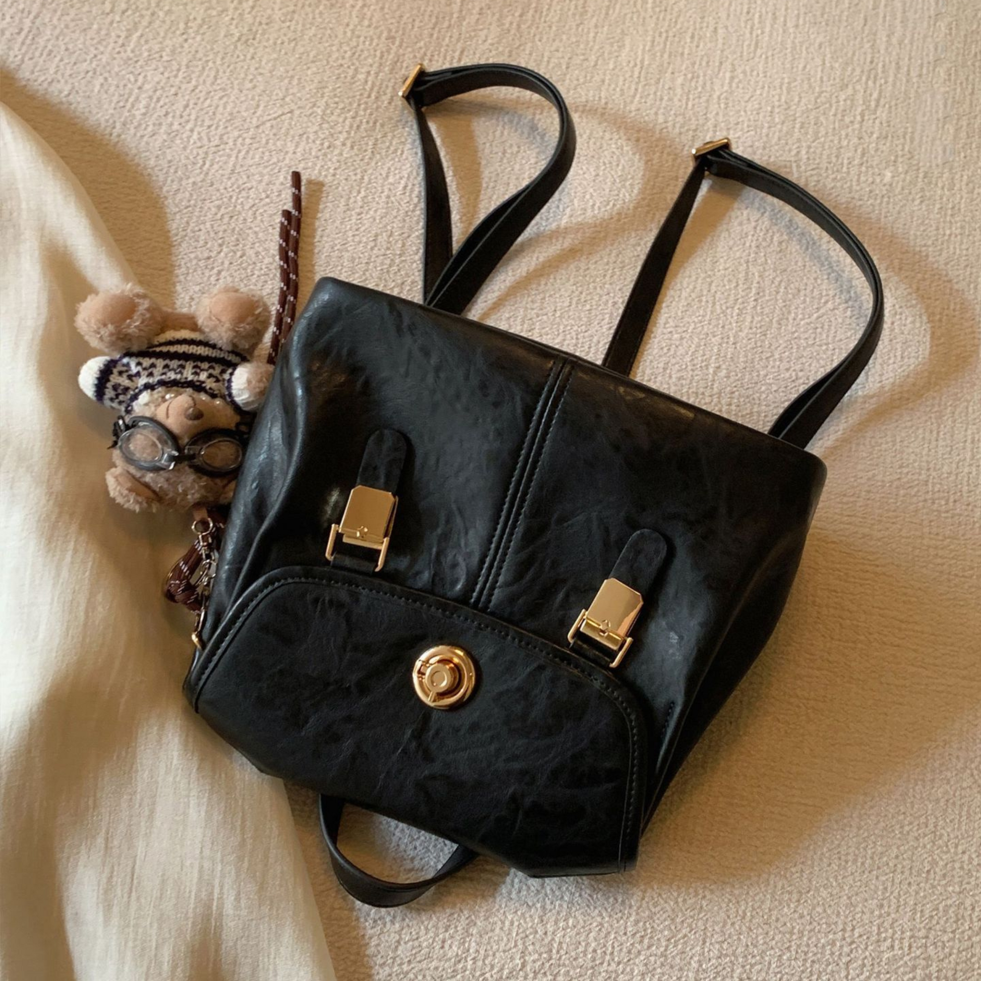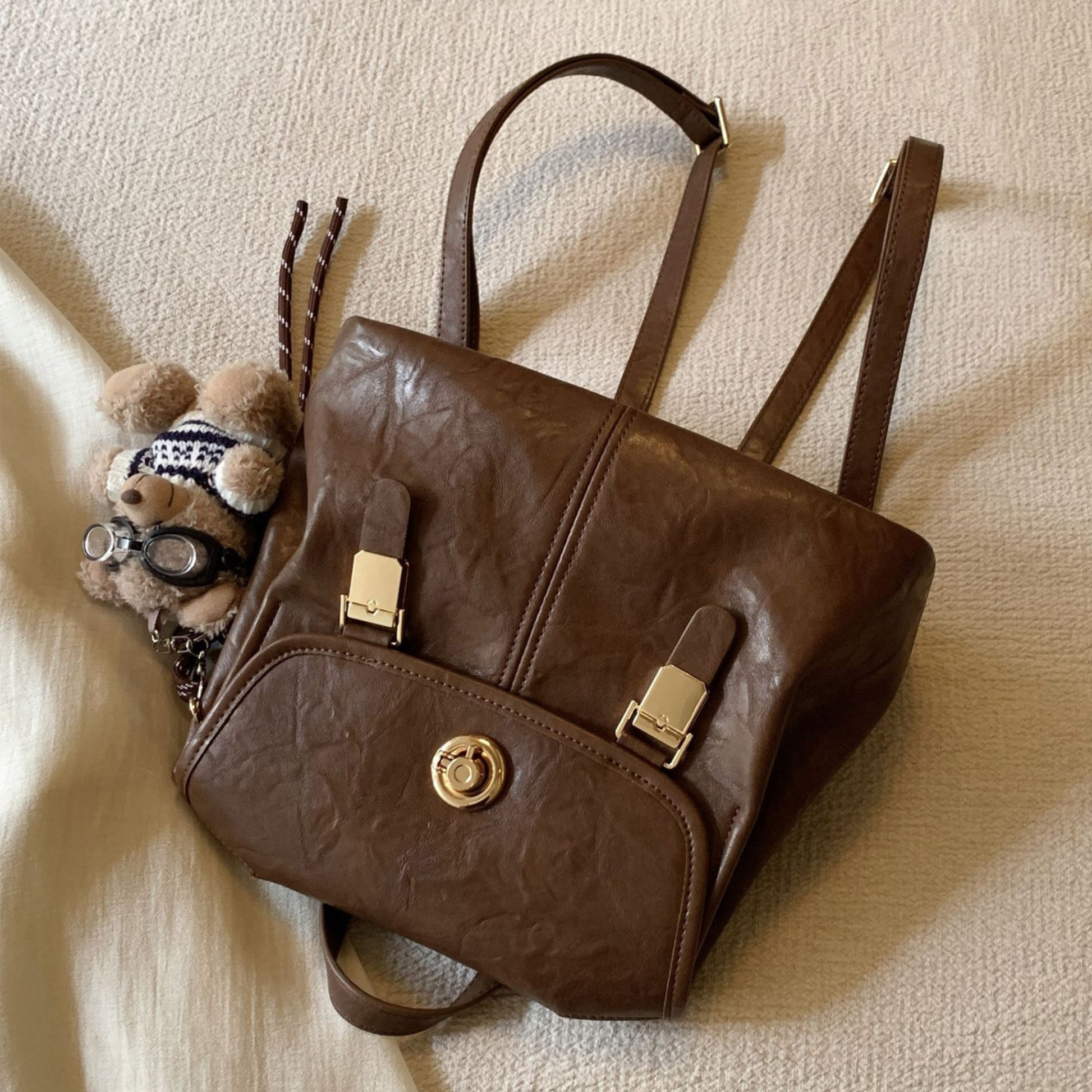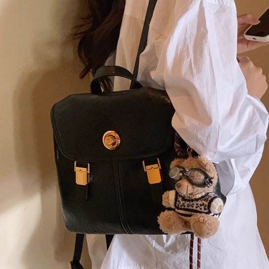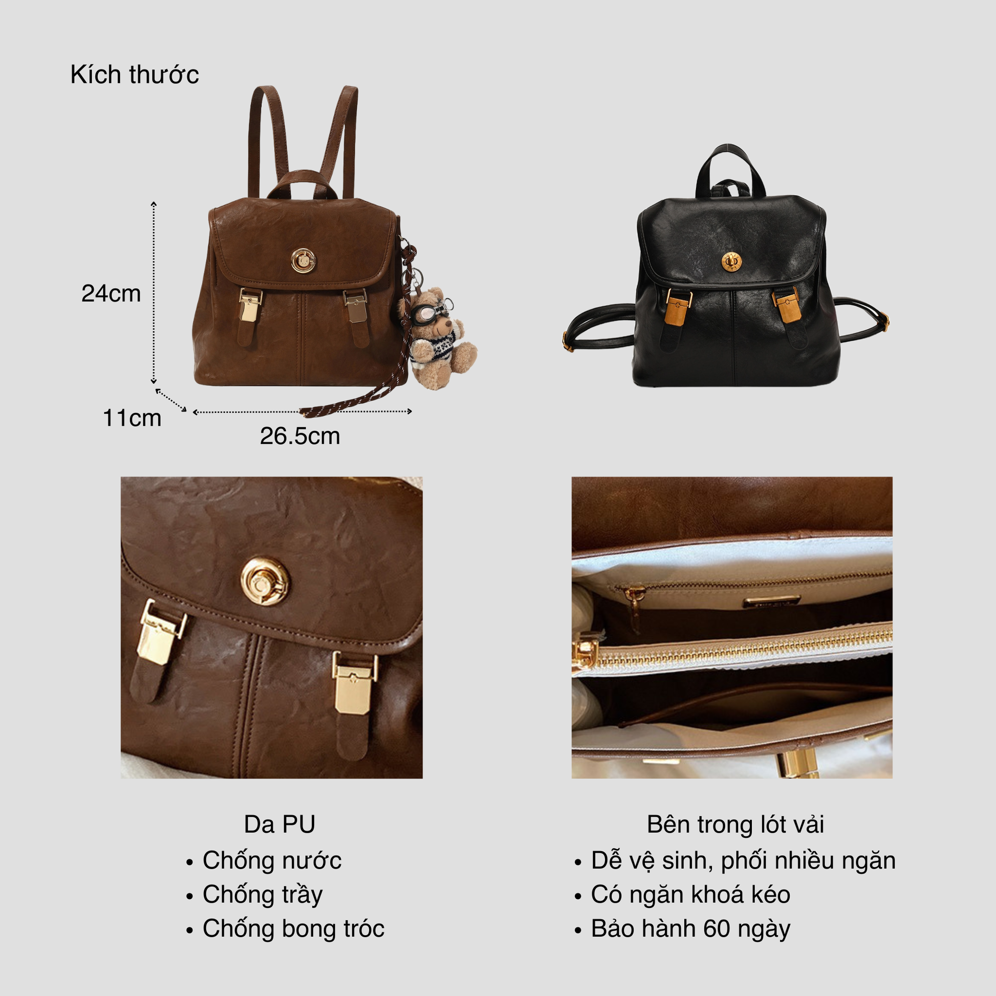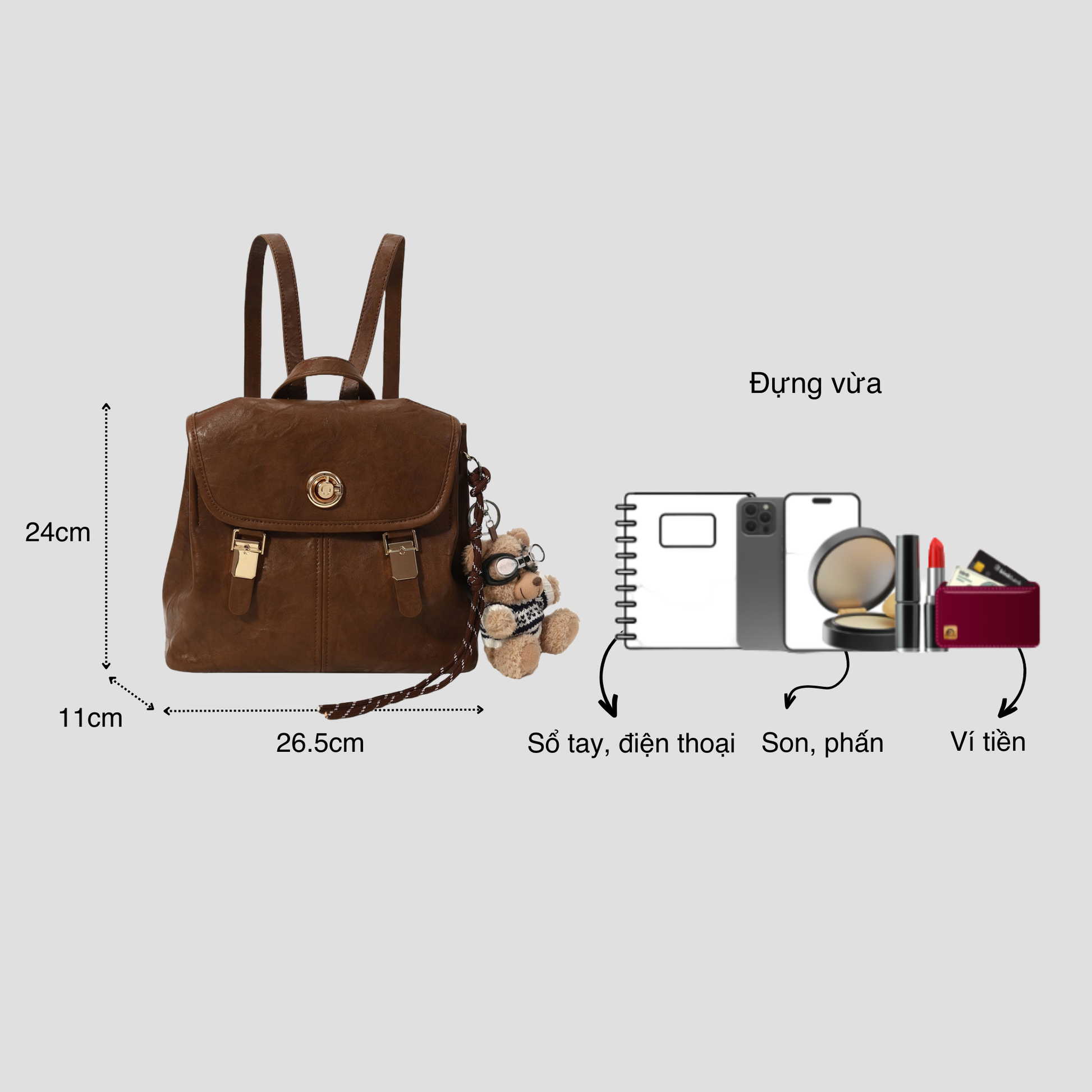 Một chiếc balo da trơn có thiết kế nắp gập phối charm gấu xinh xắn. Bên trong phối nhiều ngăn nhỏ đựng được iPad mini, điện thoại, sổ tay, đồ cá nhân... Kiểu dáng vintage dễ mix được với mọi set đồ dù là đi học, đi làm hay đi chơi. Chắc chắn đây sẽ là người bạn không thể thiếu đồng hành cùng bạn suốt 1 ngày dài đấy.