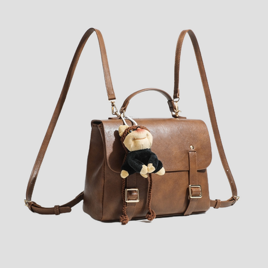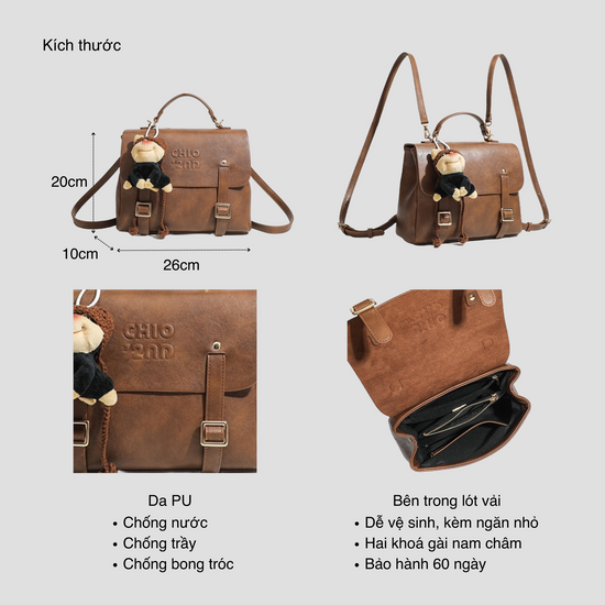 Một chiếc balo da có thiết kế nắp gập phối charm gấu xinh xắn. Balo có thể sử dụng như một chiếc túi xách rất tiện lợi. Bên trong phối nhiều ngăn nhỏ đựng được iPad mini, điện thoại, sổ tay, đồ cá nhân... Kiểu dáng vintage dễ mix được với mọi set đồ dù là đi học, đi làm hay đi chơi. Chắc chắn đây sẽ là người bạn không thể thiếu đồng hành cùng bạn suốt 1 ngày dài đấy.
