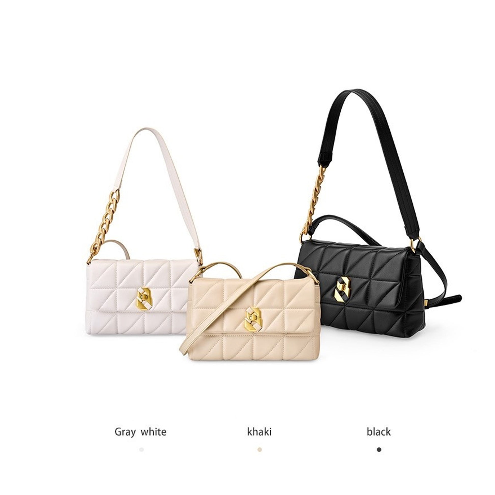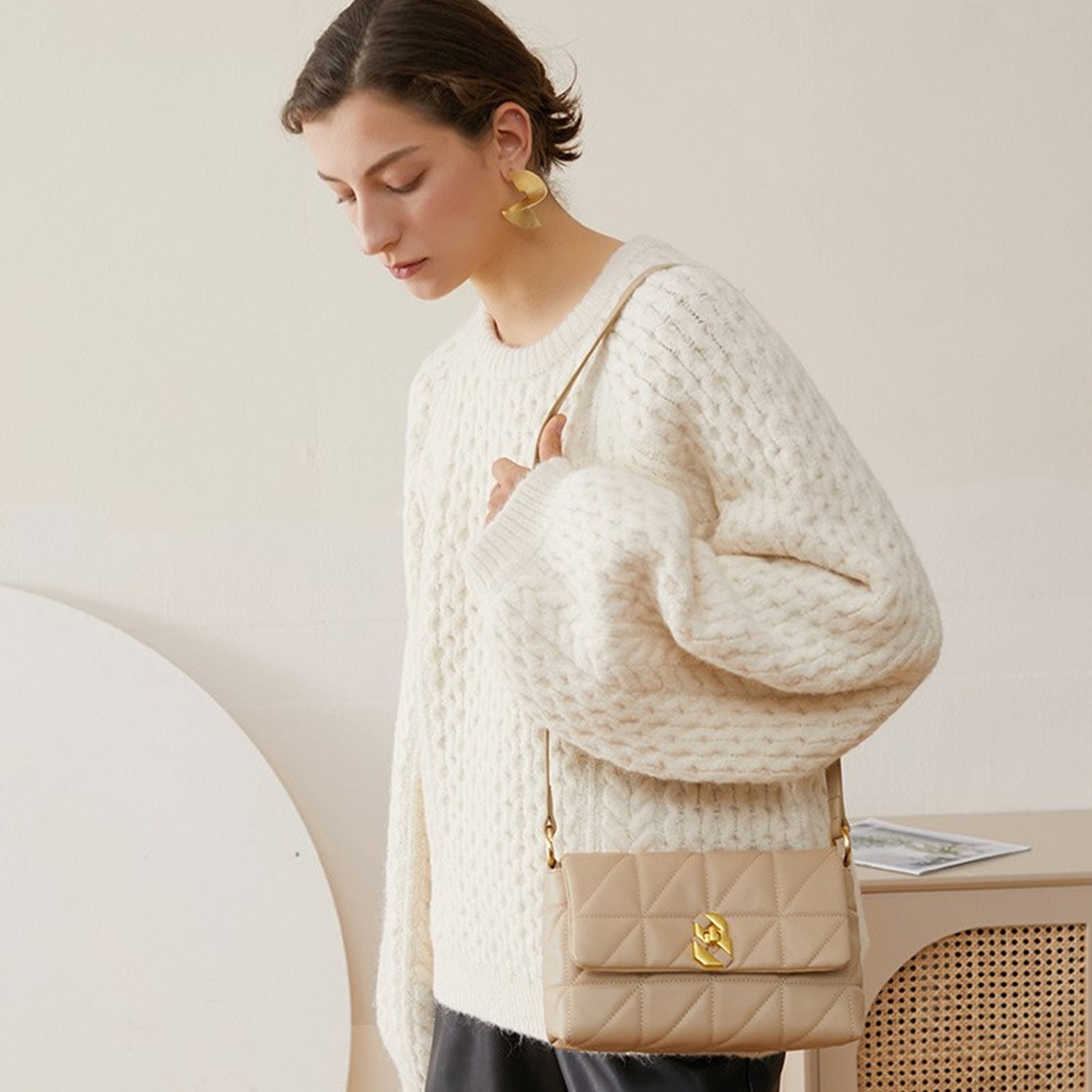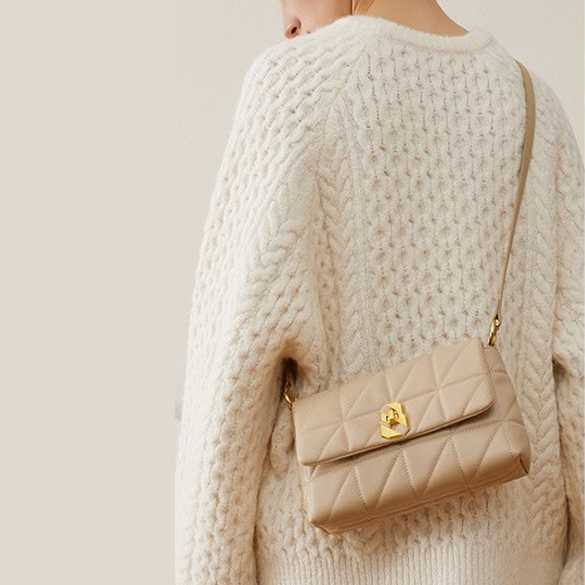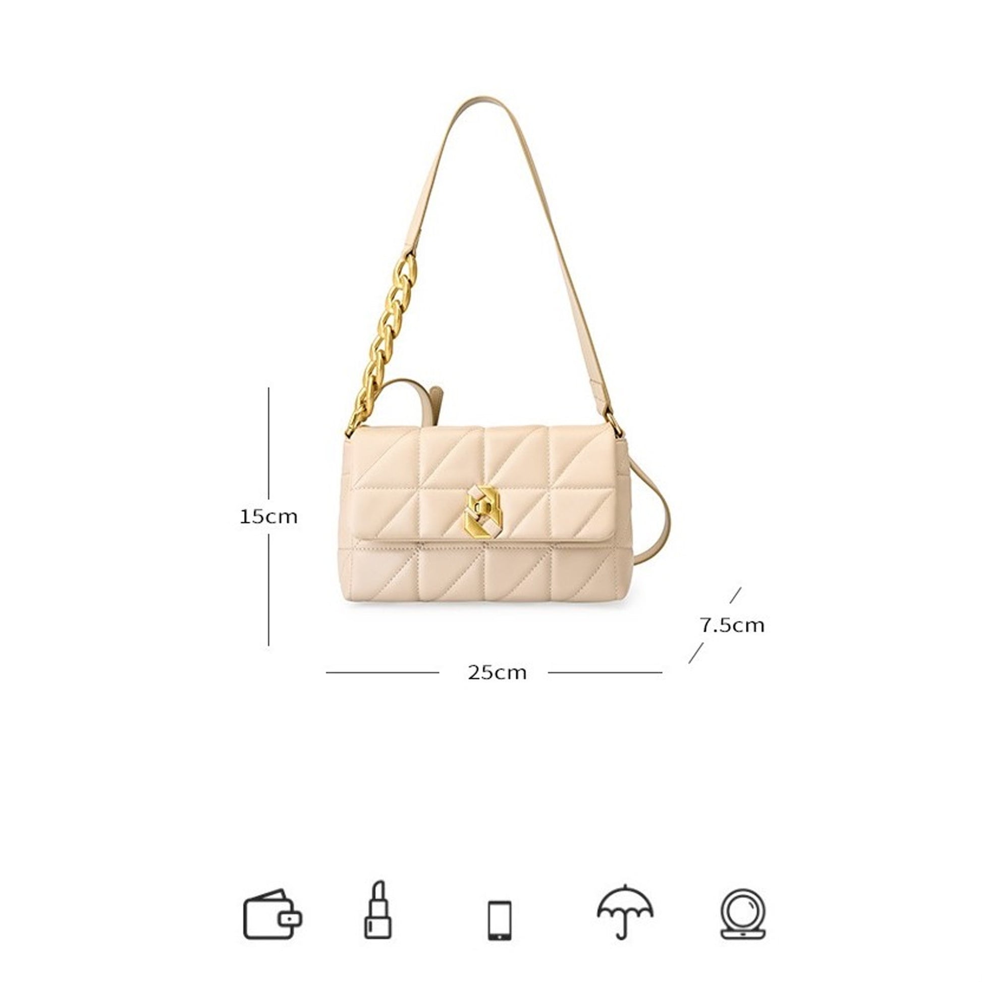 Chiếc túi xách da kiểu vân chéo kết hợp mặt khoá kim loại sang trọng và không kém phần tinh tế. Dây đeo có thể thay đổi độ dài để dùng được ba kiểu: xách tay, đeo vai hoặc đeo chéo tuỳ ý. Không gian bên trong túi đựng được những đồ dùng cá nhân như điện thoại, bóp ví, mắt kính, đồ trang điểm,... Màu sắc trẻ trung dễ mix với mọi set đồ mỗi khi đi làm hay dạo phố.