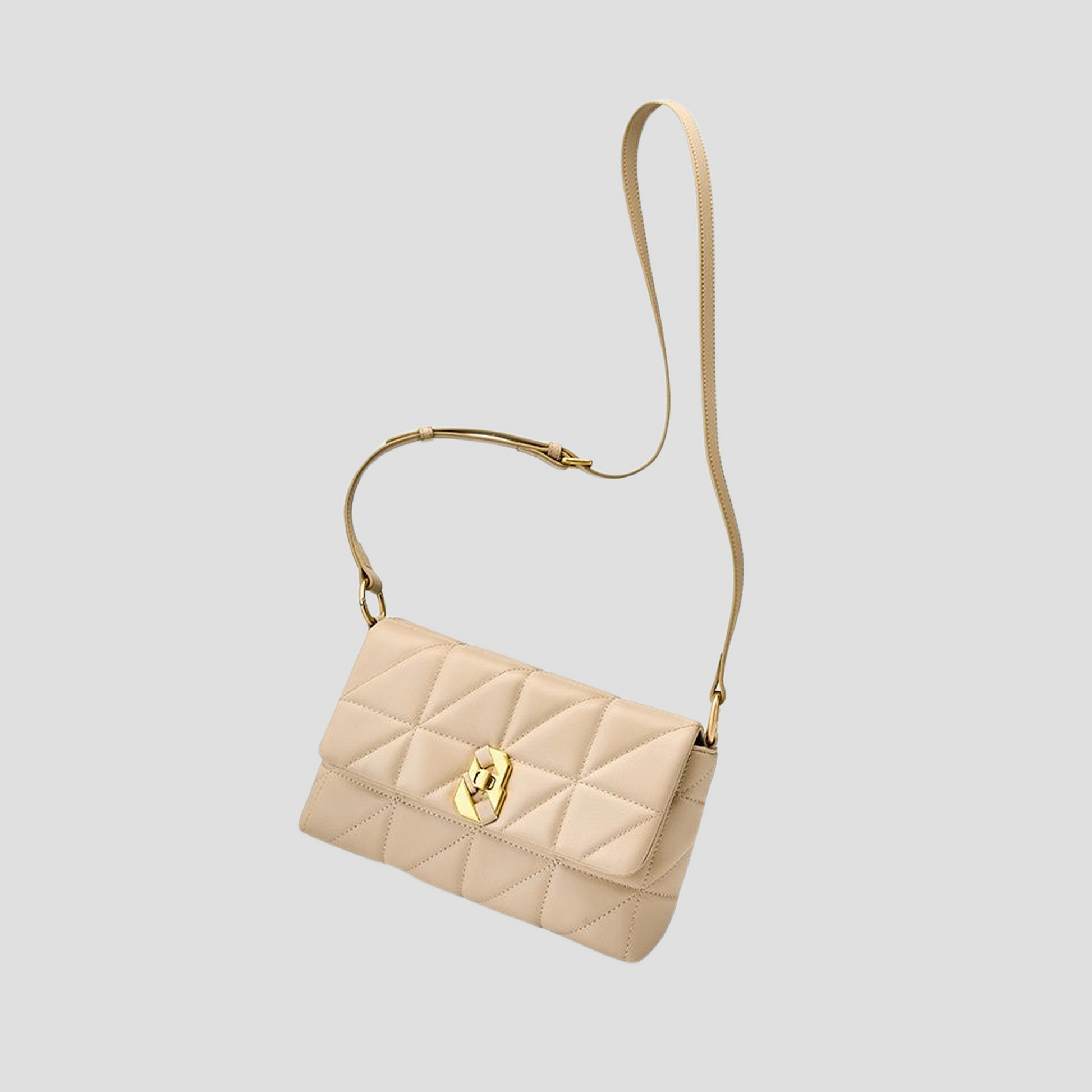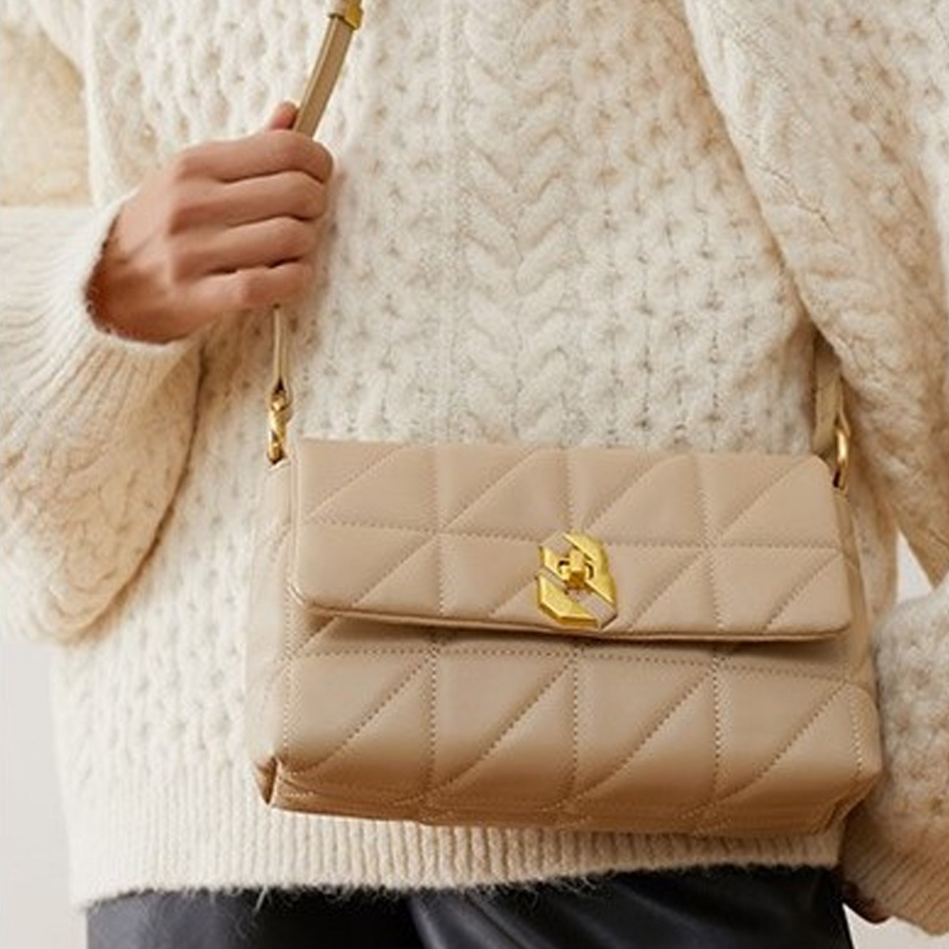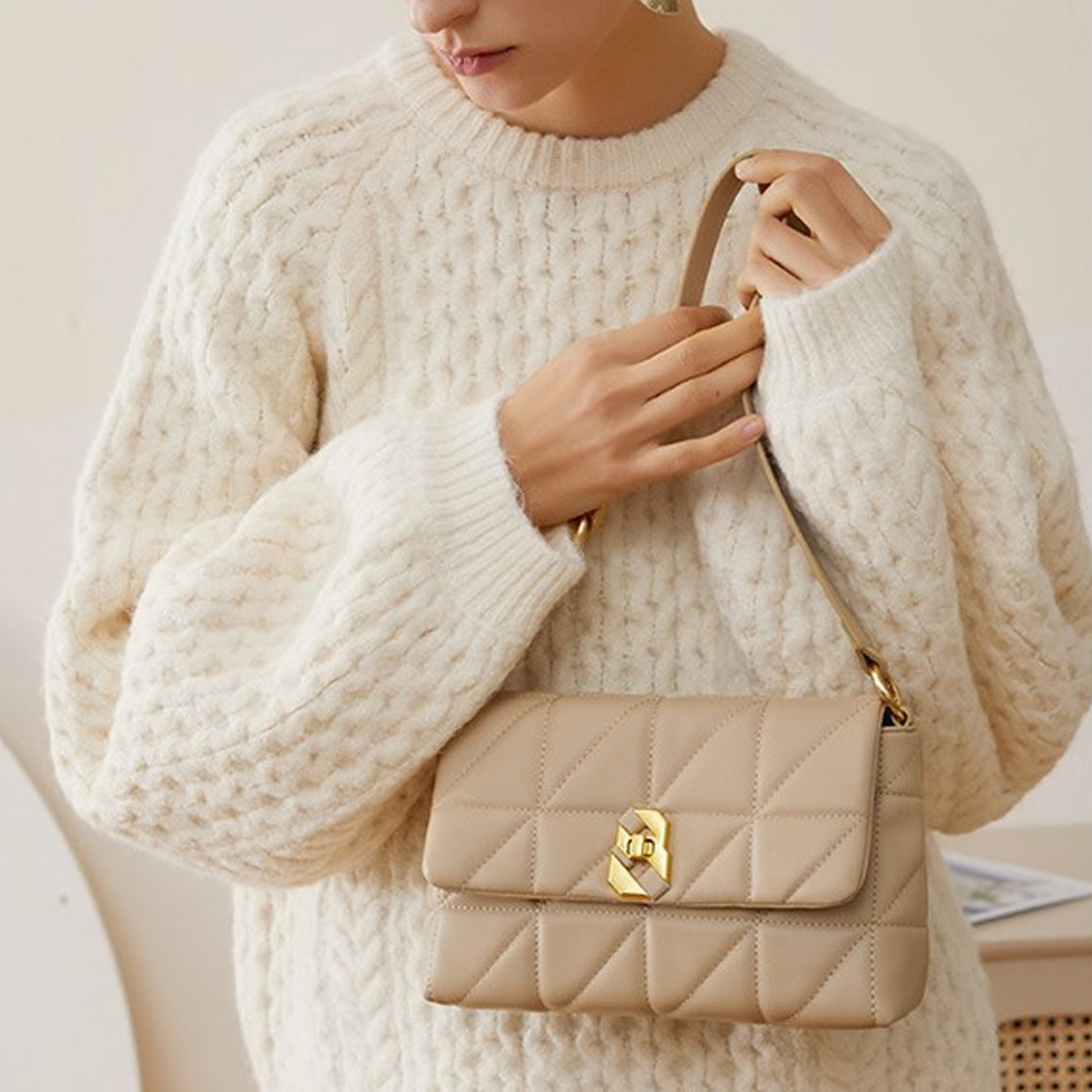 Chiếc túi xách da kiểu vân chéo kết hợp mặt khoá kim loại sang trọng và không kém phần tinh tế. Dây đeo có thể thay đổi độ dài để dùng được ba kiểu: xách tay, đeo vai hoặc đeo chéo tuỳ ý. Không gian bên trong túi đựng được những đồ dùng cá nhân như điện thoại, bóp ví, mắt kính, đồ trang điểm,... Màu sắc trẻ trung dễ mix với mọi set đồ mỗi khi đi làm hay dạo phố.