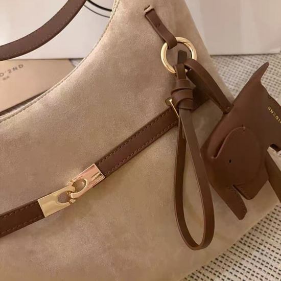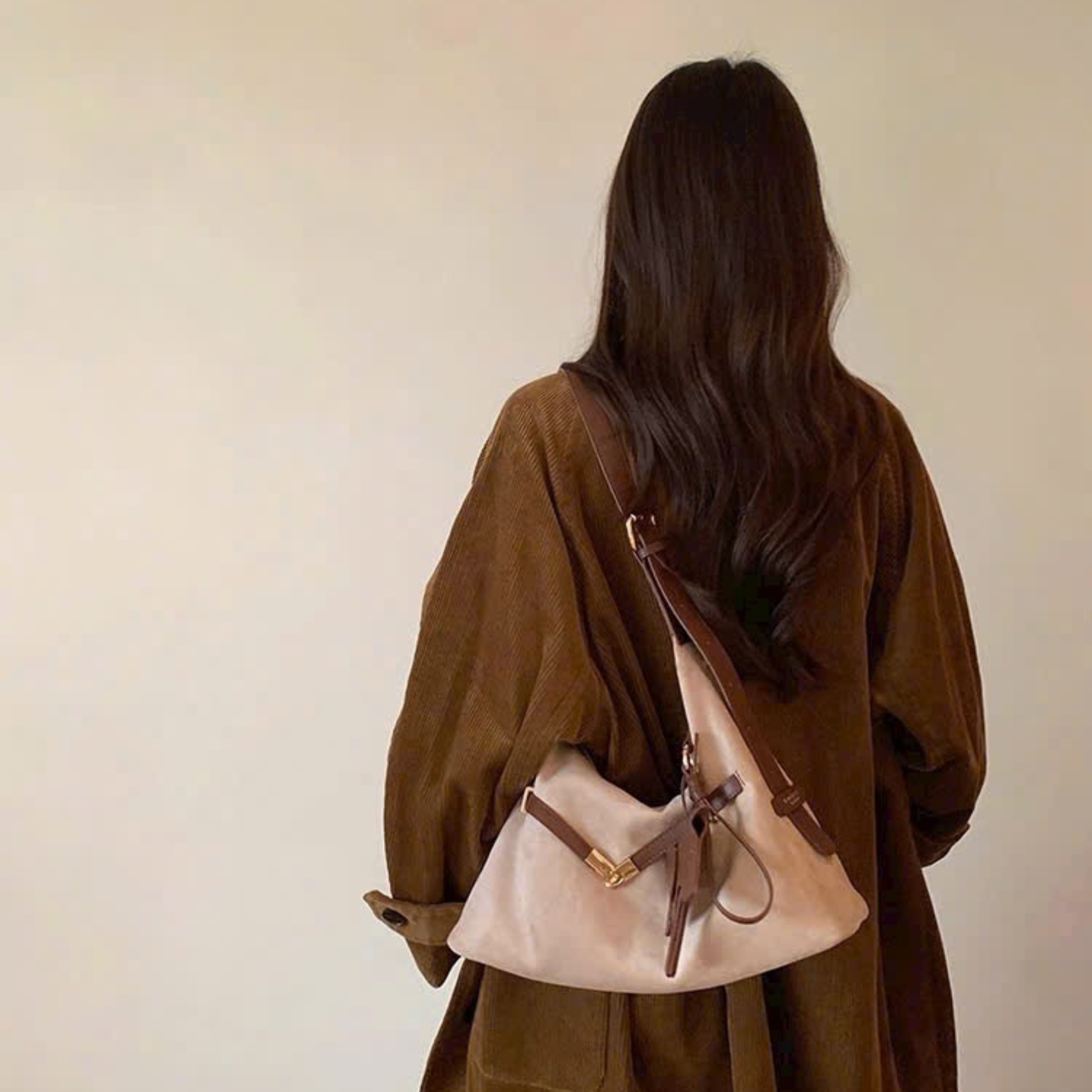 Chiếc túi xách da lộn phối đai da, kèm thêm charm đơn giản nhưng cũng không kém phần vintage. Điểm nổi bật của túi là dây đeo linh hoạt, bạn có thể sử dụng ba kiểu: cầm tay, đeo vai hoặc đeo chéo tuỳ thích.