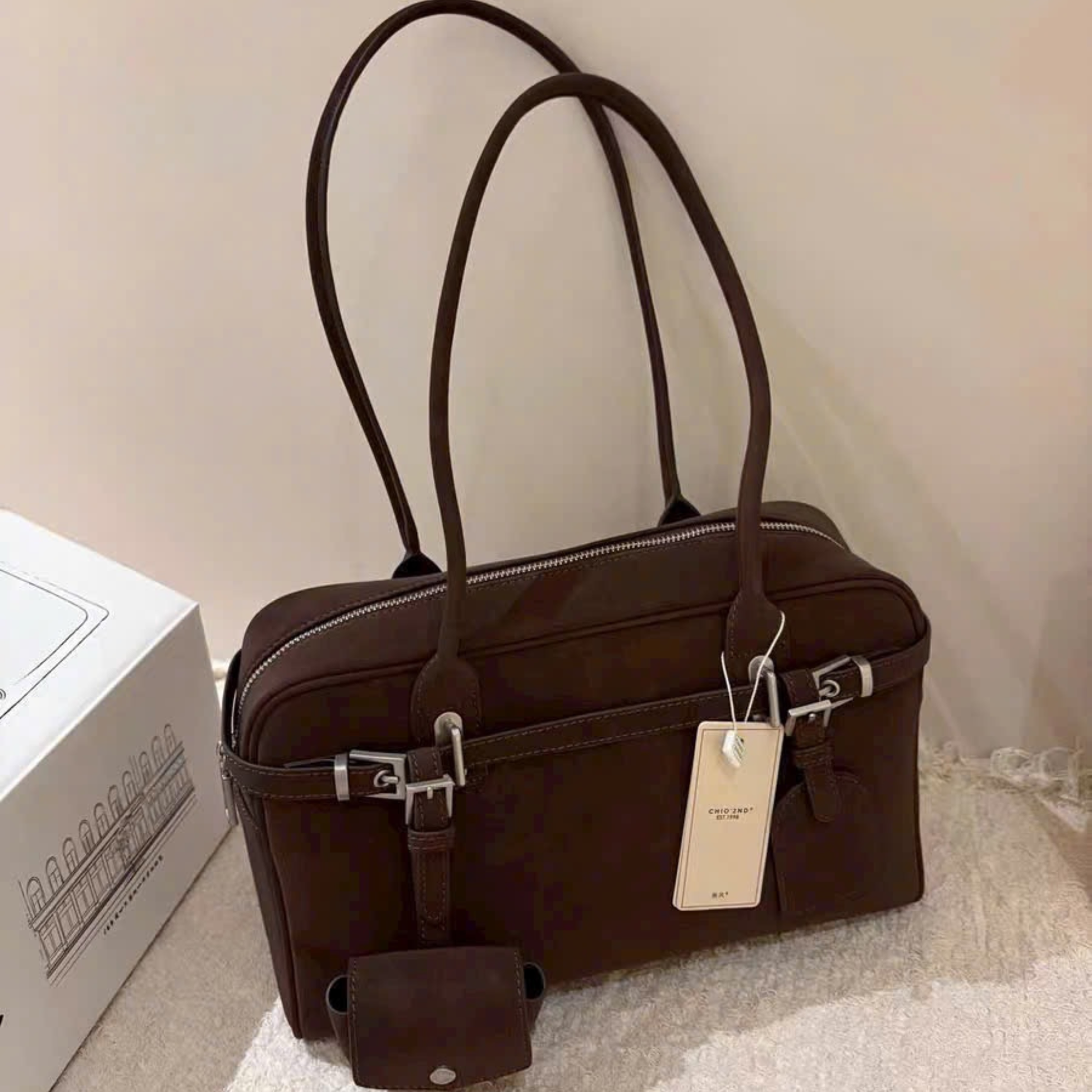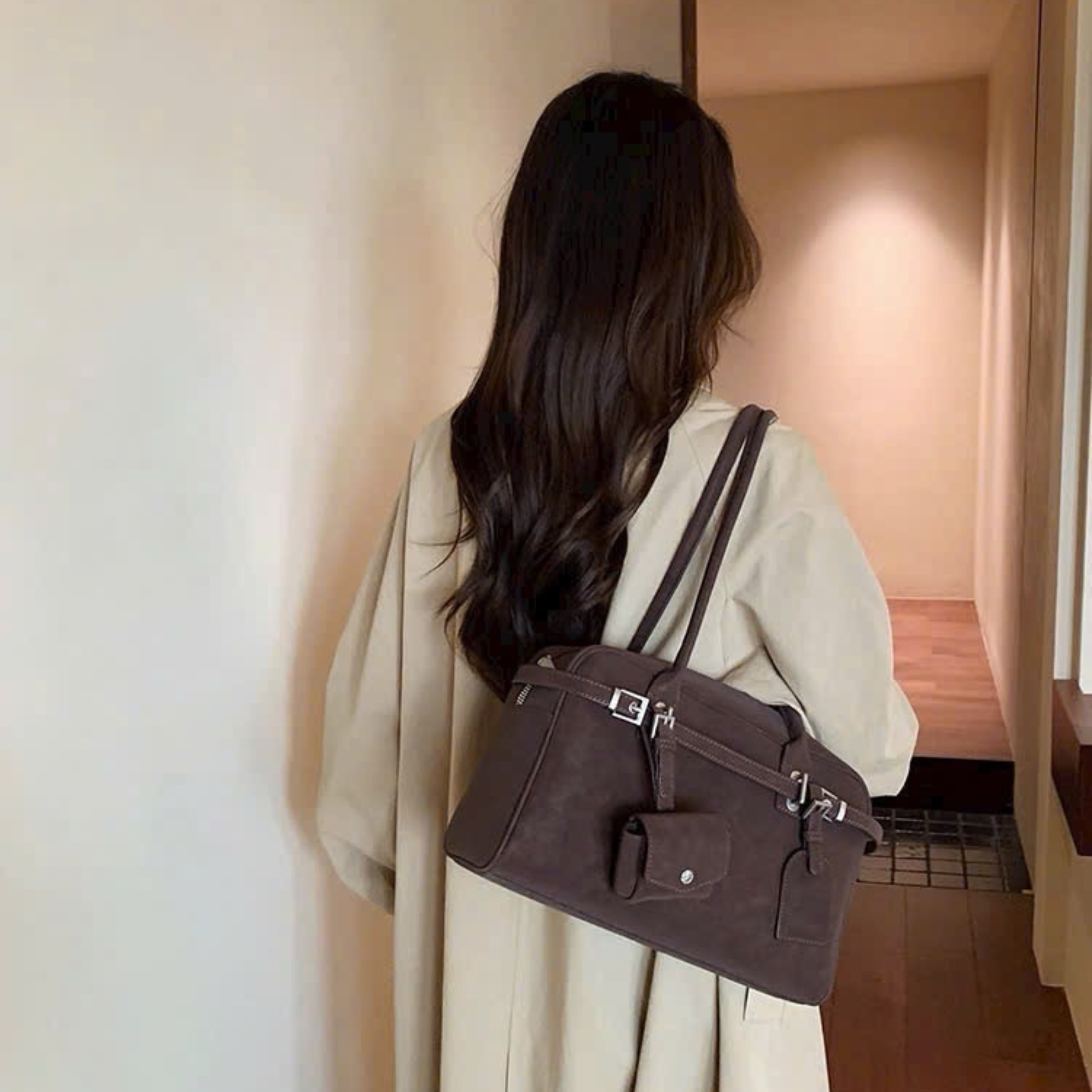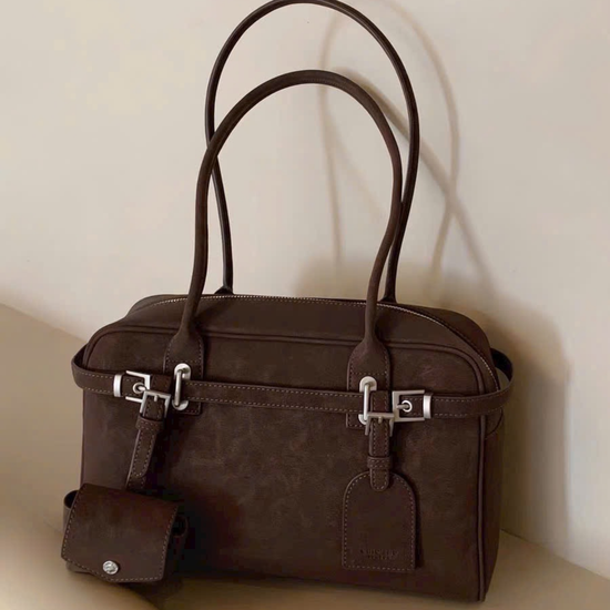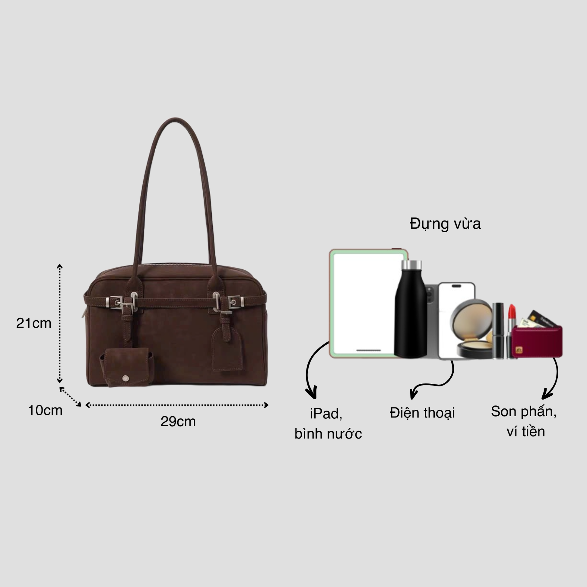 Chiếc túi xách da lộn trơn phối đai lạ mắt, kèm thêm ví nhỏ làm charm đơn giản nhưng cũng không kém phần vintage. Quai đeo bạn có thể sử dụng hai kiểu: cầm tay hoặc đeo vai tuỳ thích.