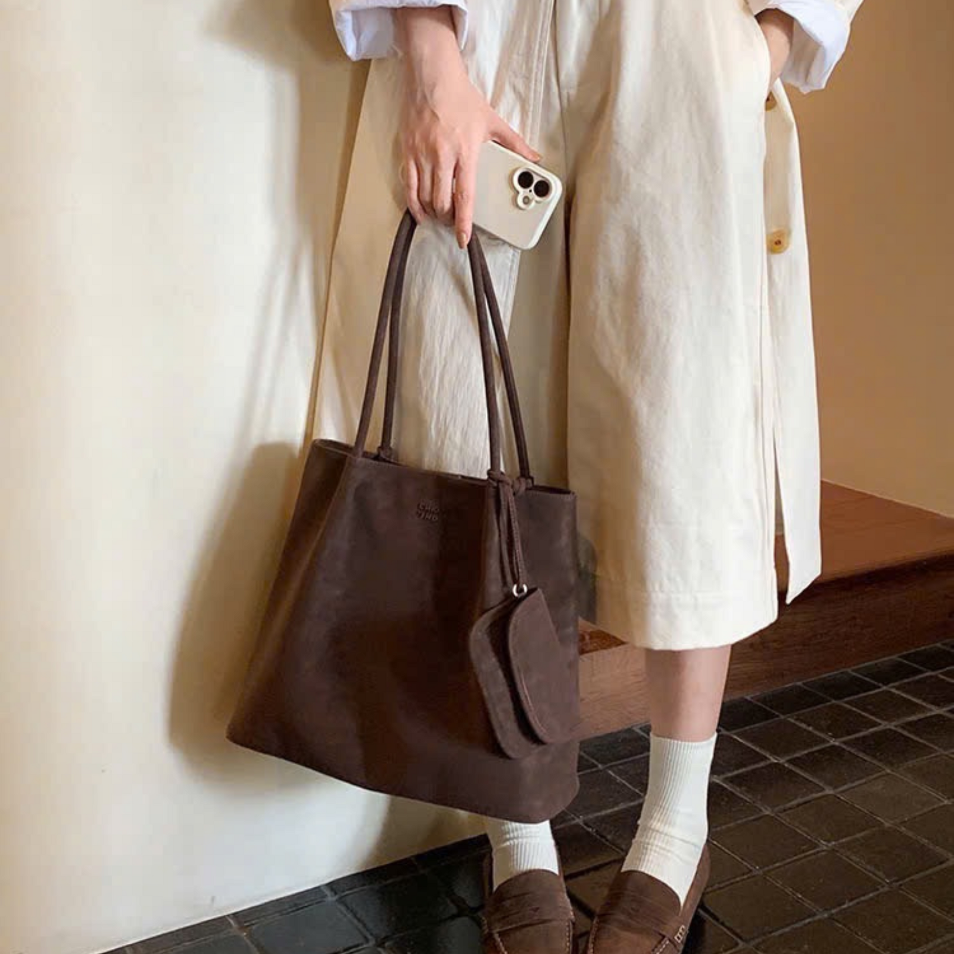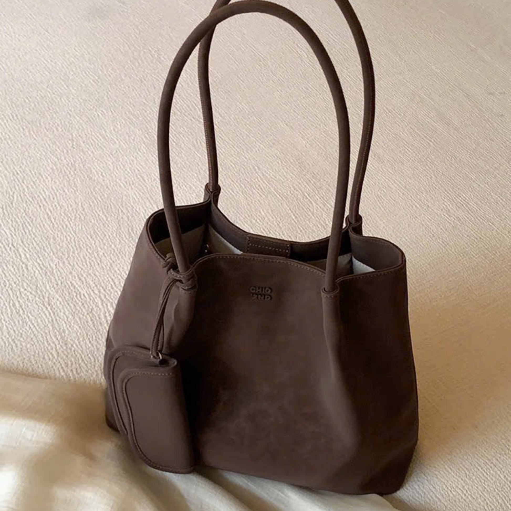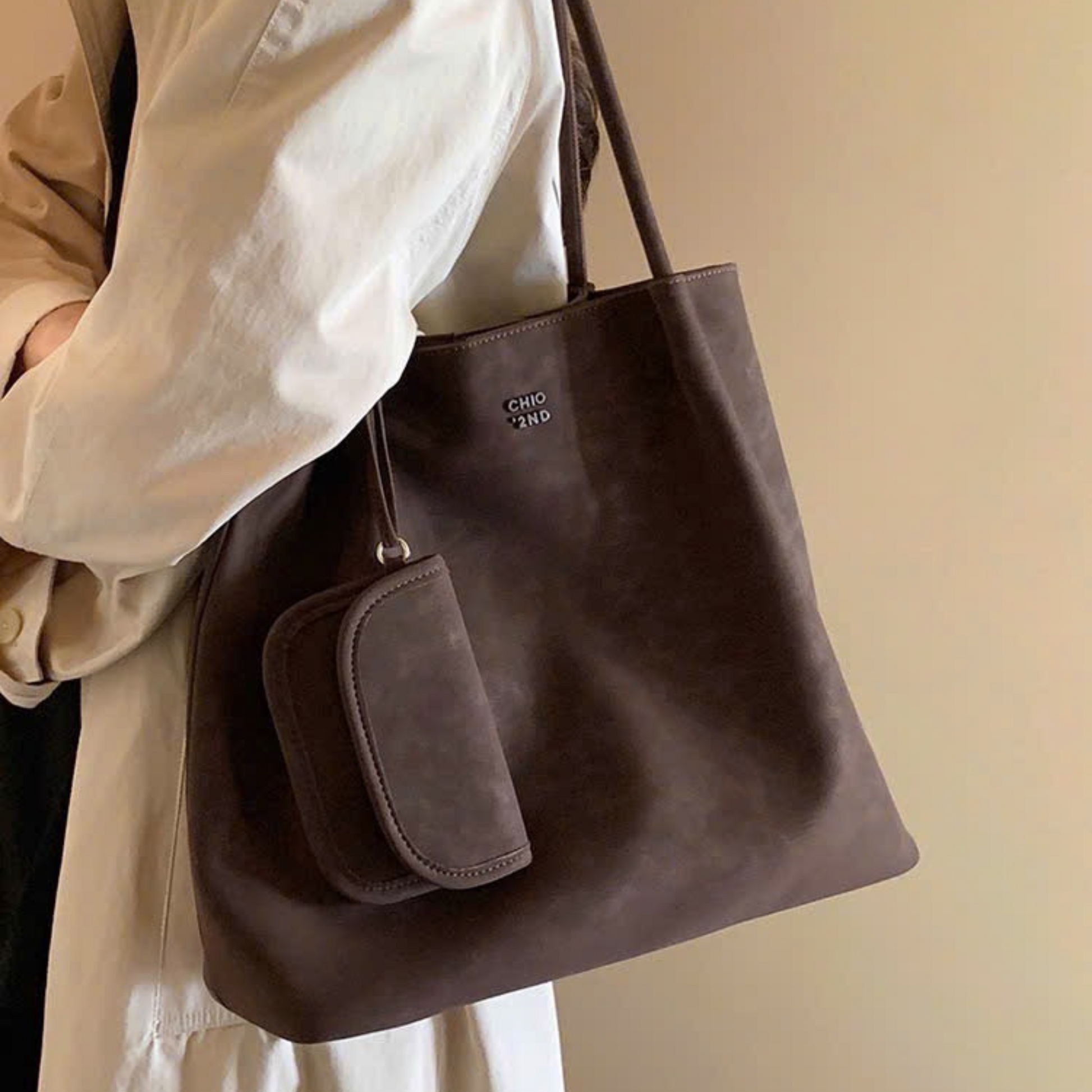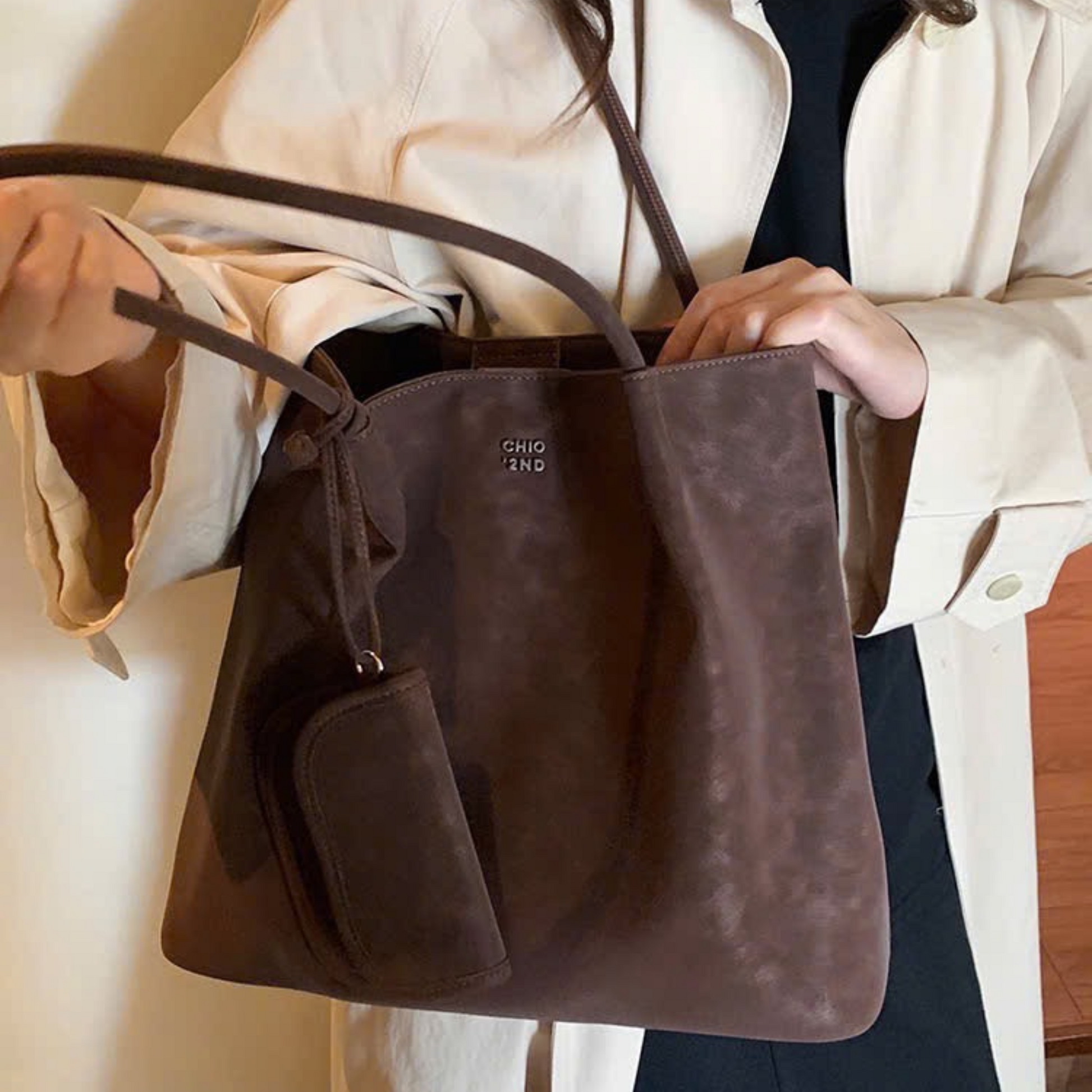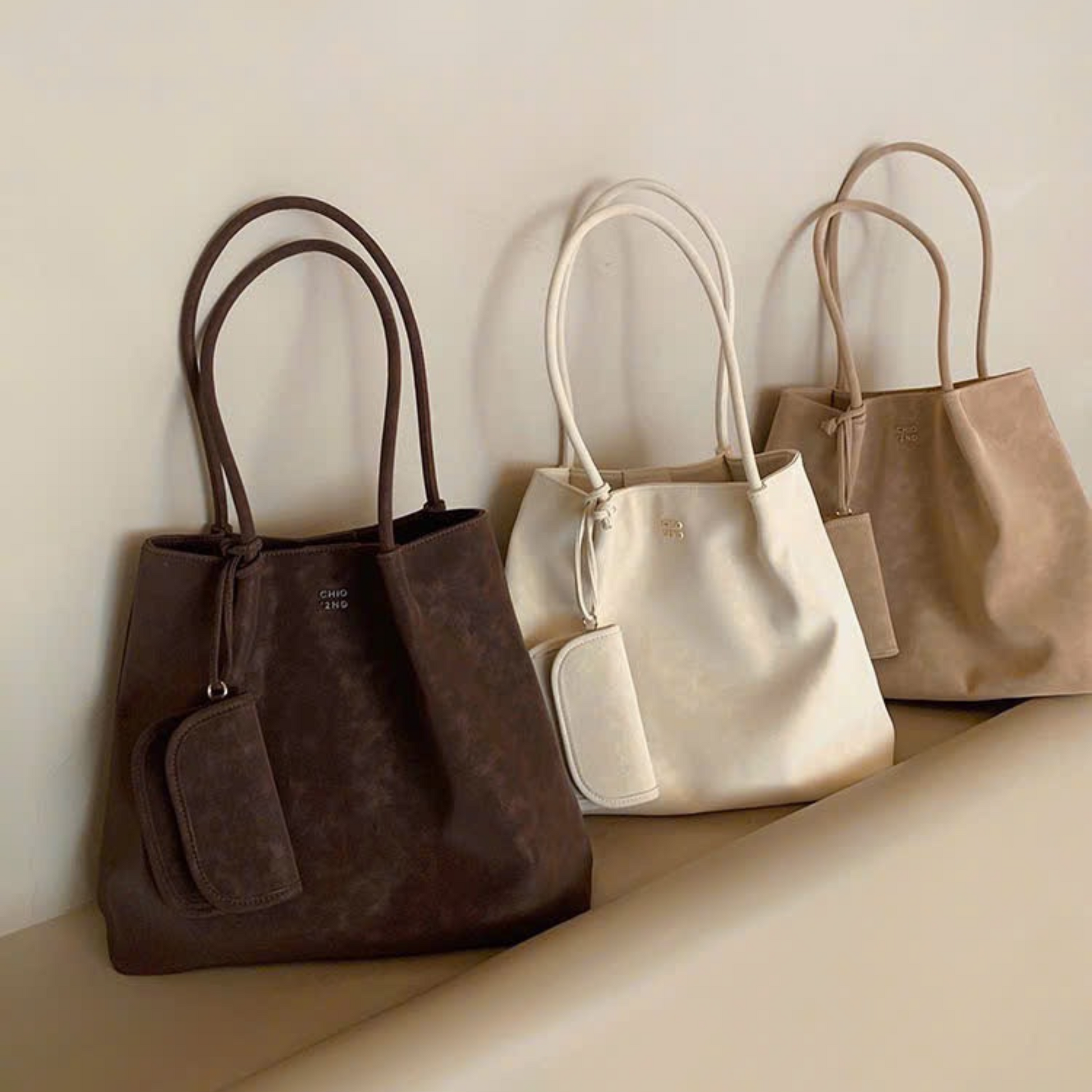 Chiếc túi xách da lộn trơn phối ví nhỏ đơn giản nhưng cũng không kém phần vintage. Quai đeo bạn có thể sử dụng hai kiểu: cầm tay hoặc đeo vai tuỳ thích.