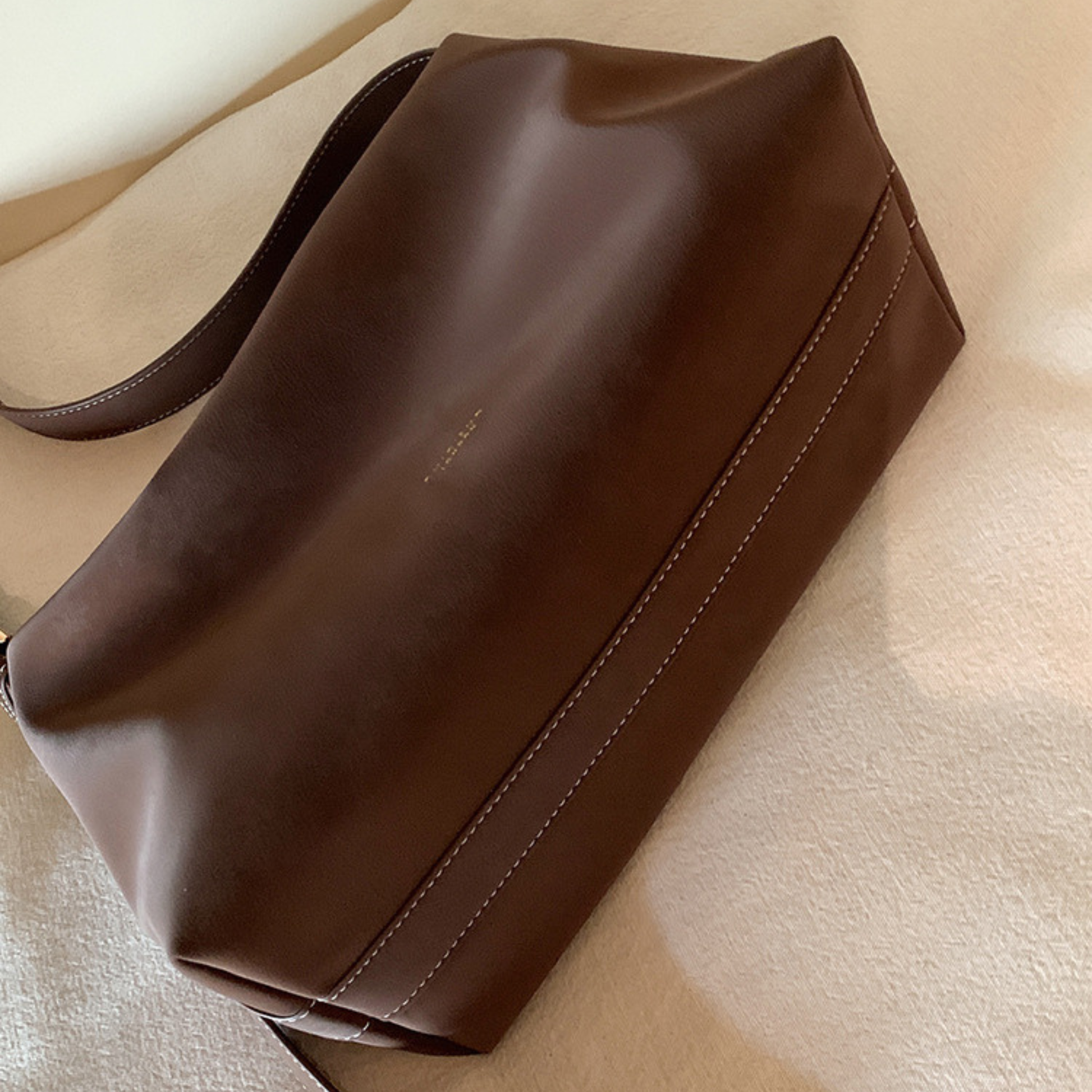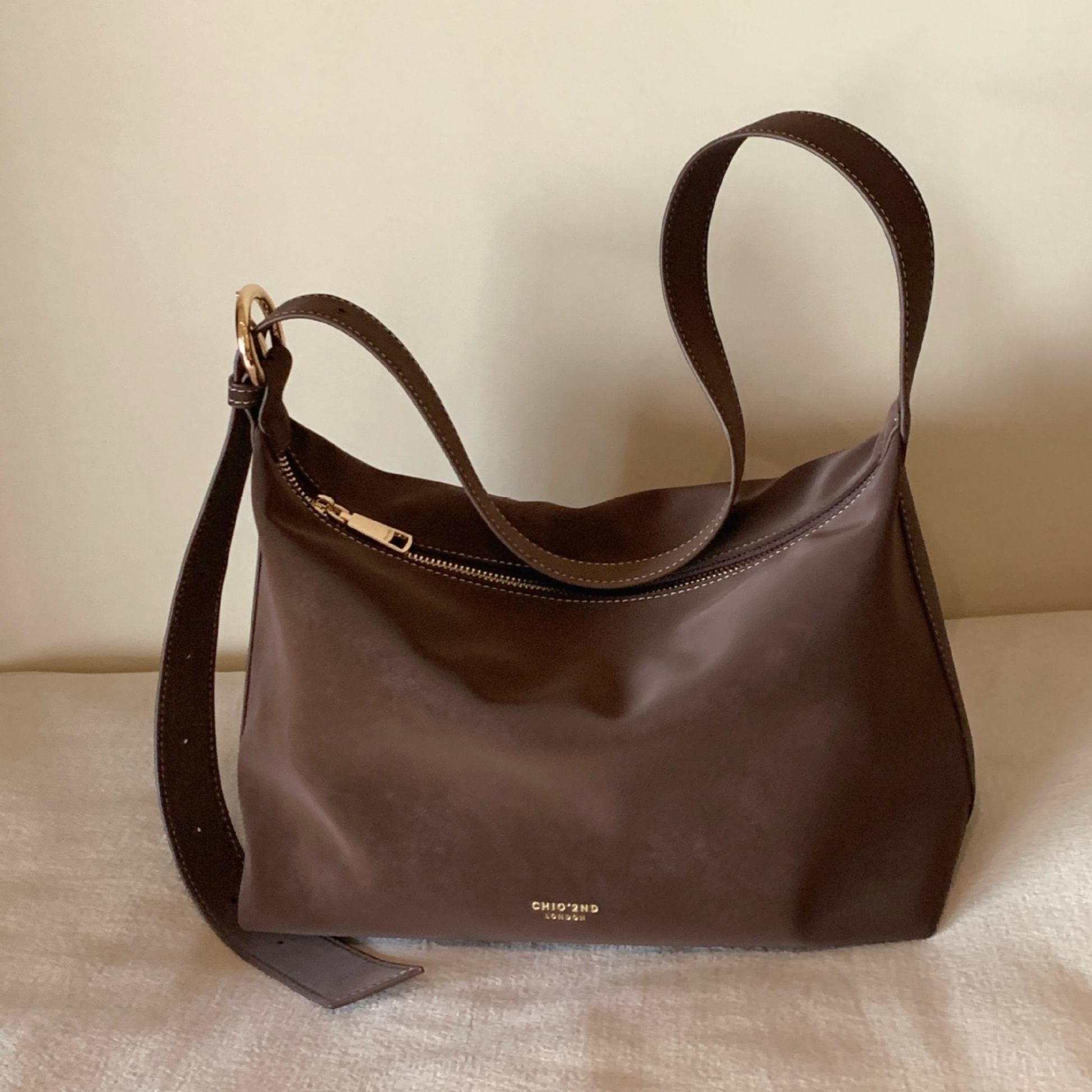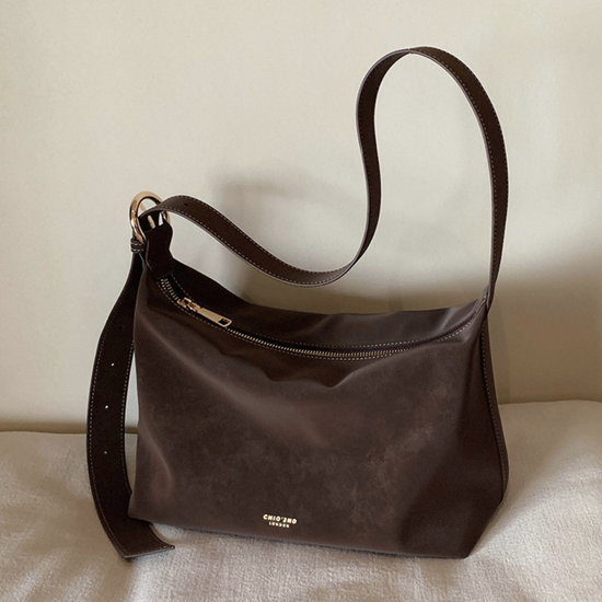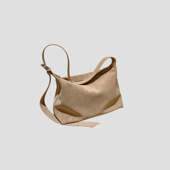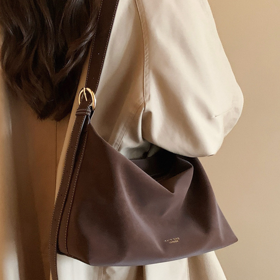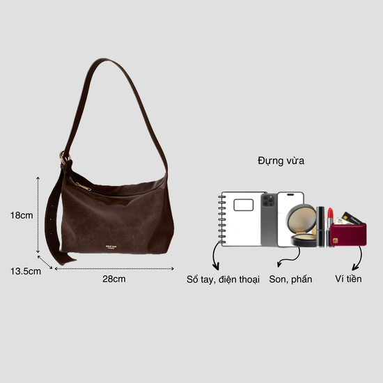 Chiếc túi xách da lộn kiểu trơn đơn giản mang hơi hướng vintage. Quai đeo có thể điểu chỉnh để sử dụng linh hoạt hai kiểu: đeo vai hoặc đeo chéo tuỳ ý. Không gian túi rộng rãi, đủ để chứa đồ dùng cần thiết hàng ngày như điện thoại, bóp ví, đồ trang điểm...