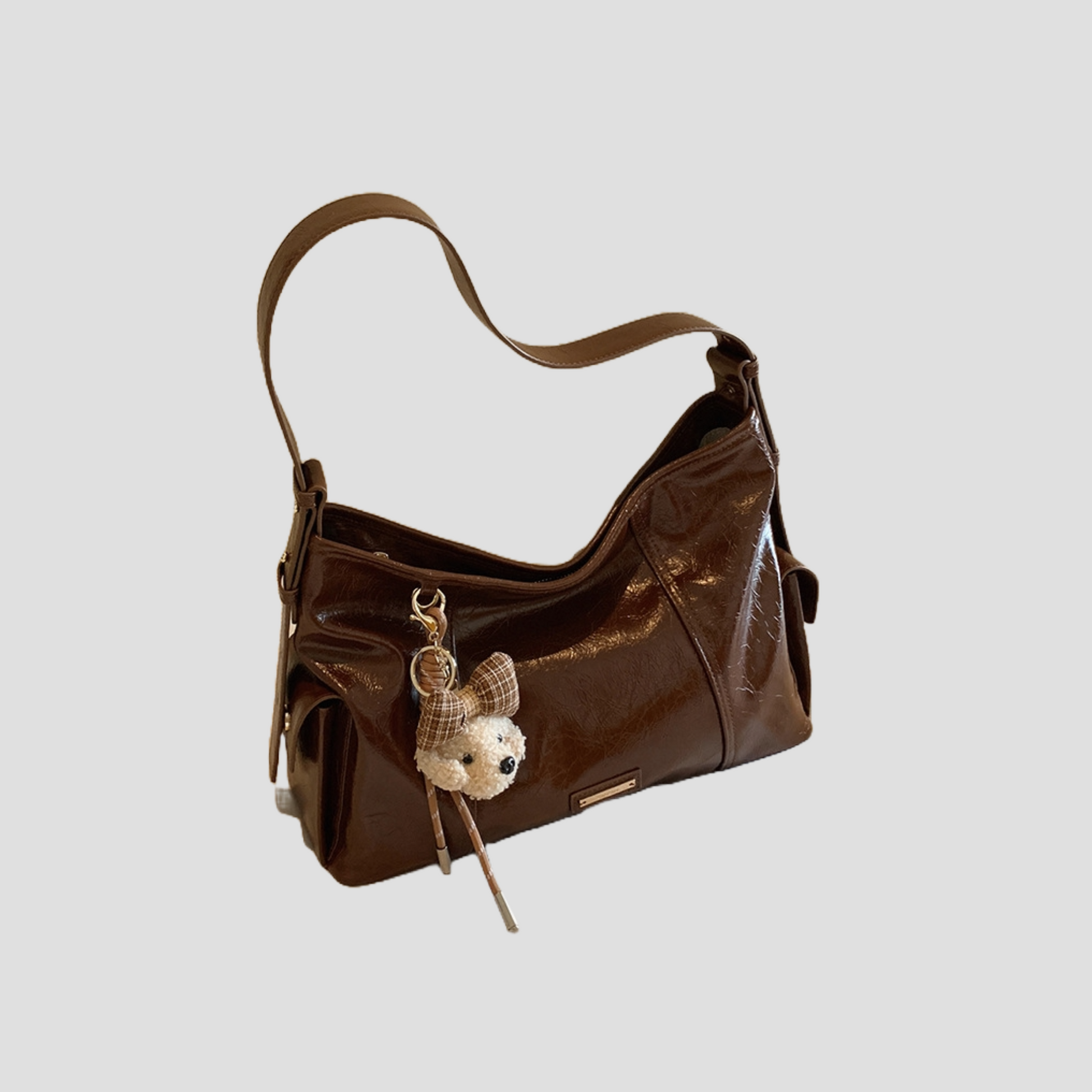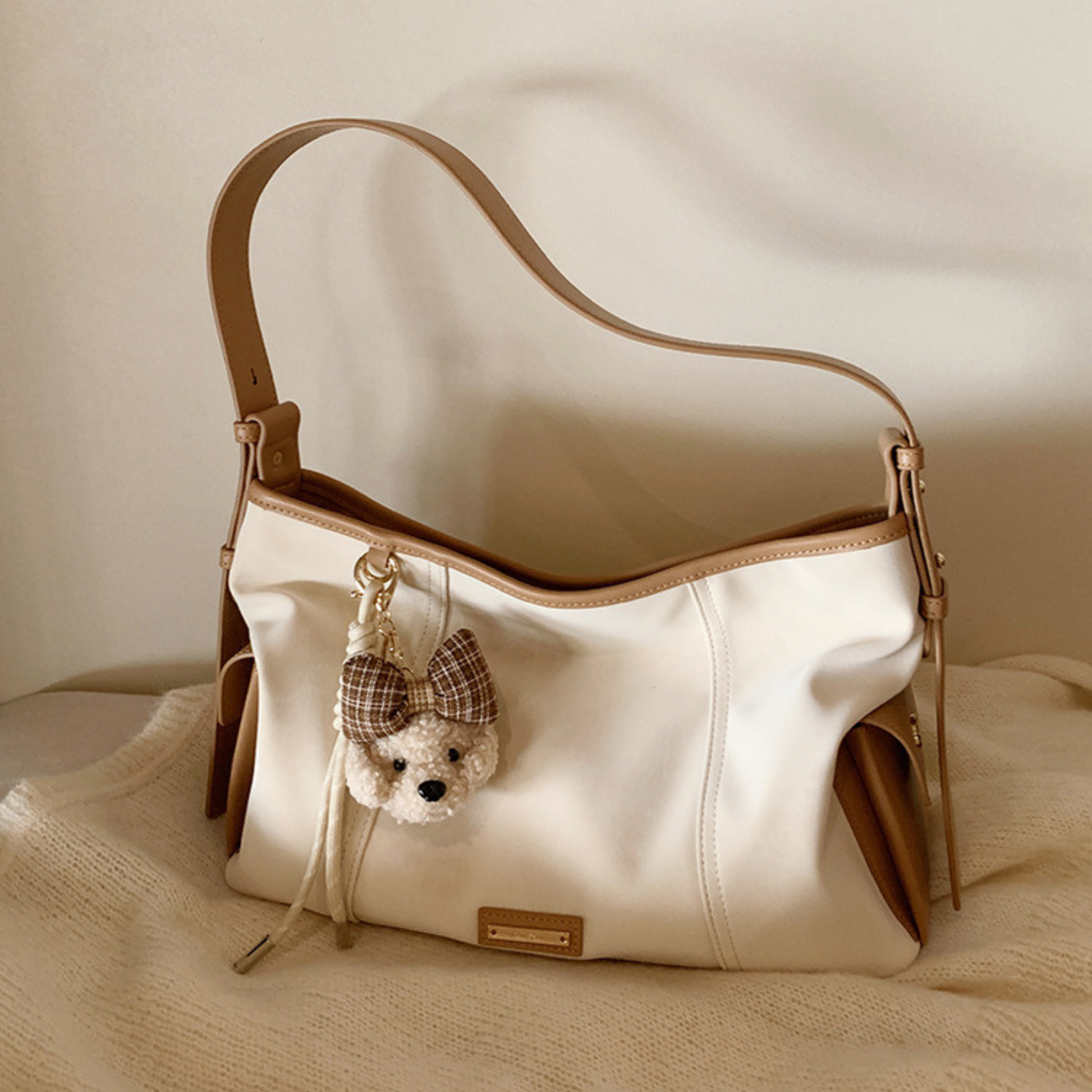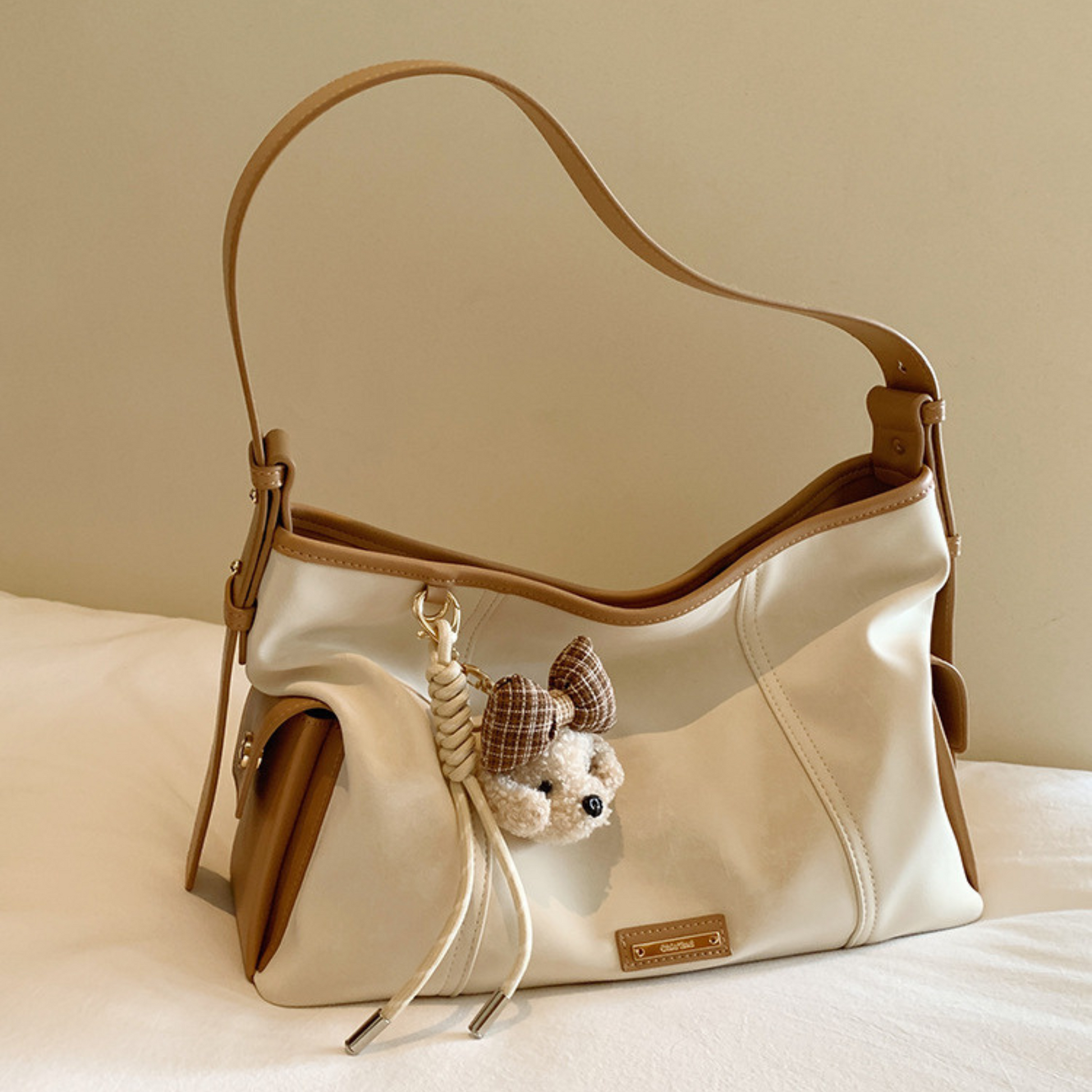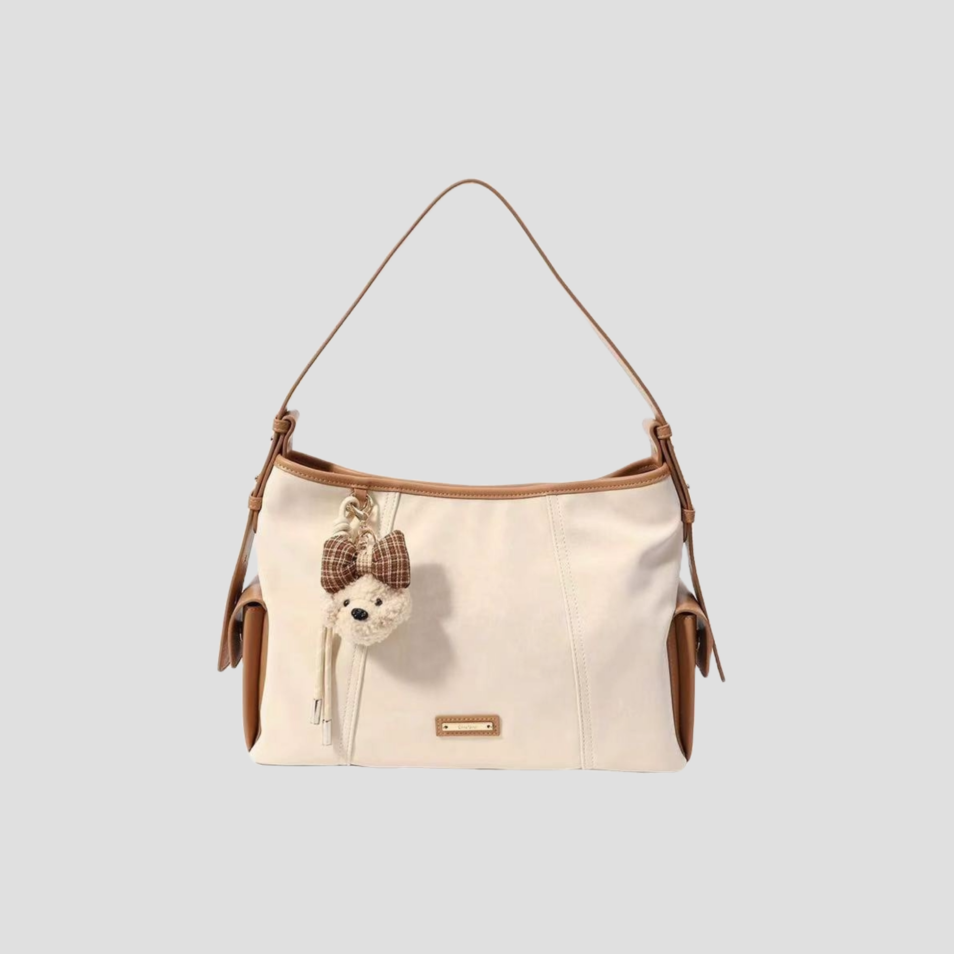 Chiếc túi xách da trơn phối ngăn hộp hai bên hông, kèm thêm charm gấu xinh. Quai đeo có thể sử dụng theo hai kiểu: đeo vai hoặc xách tay tuỳ ý. Bên trong túi rộng rãi có thể dùng đựng nhiều đồ dùng cần thiết hàng ngày như tập A4, iPad mini, sổ tay, điện thoại, bóp ví, bình nước, đồ trang điểm...