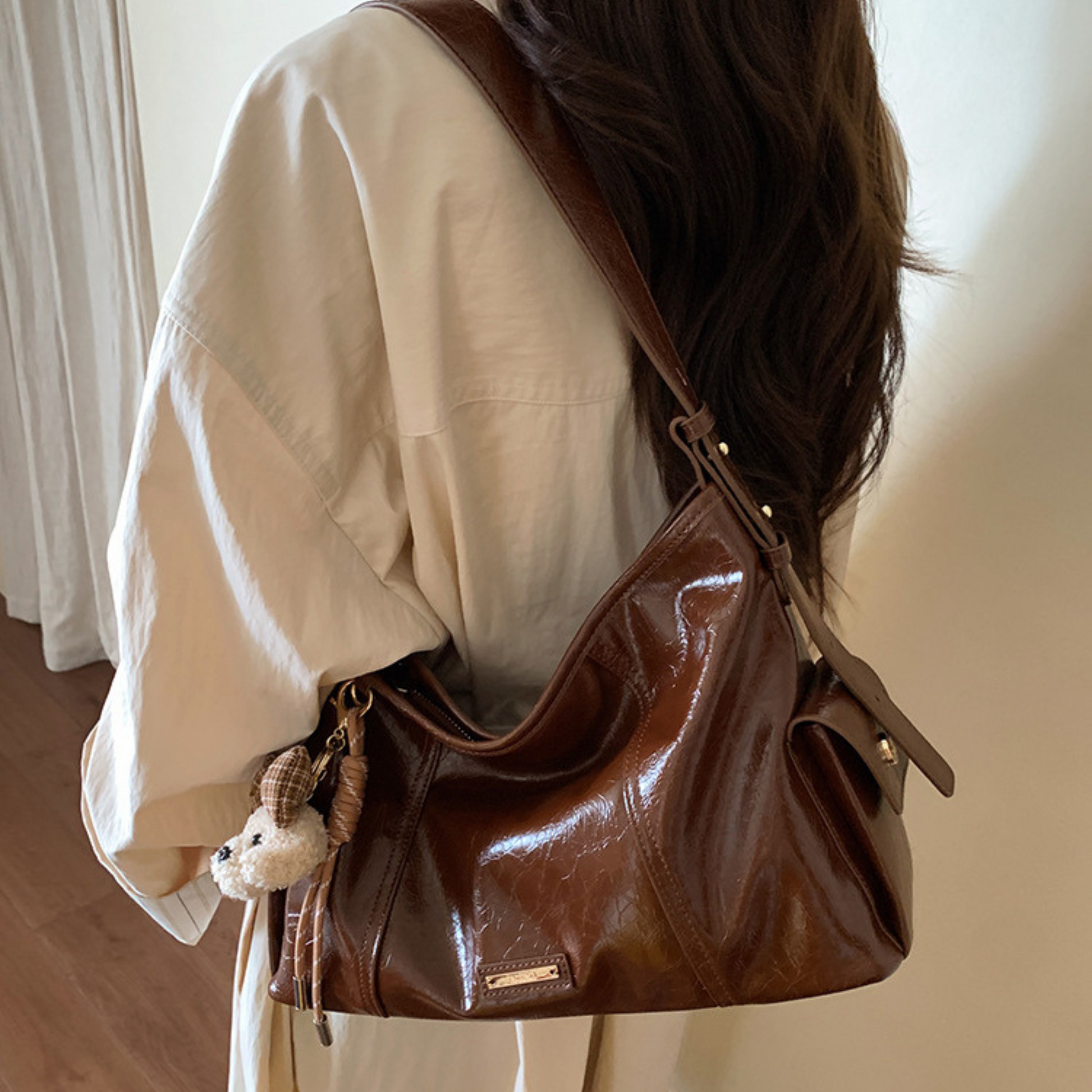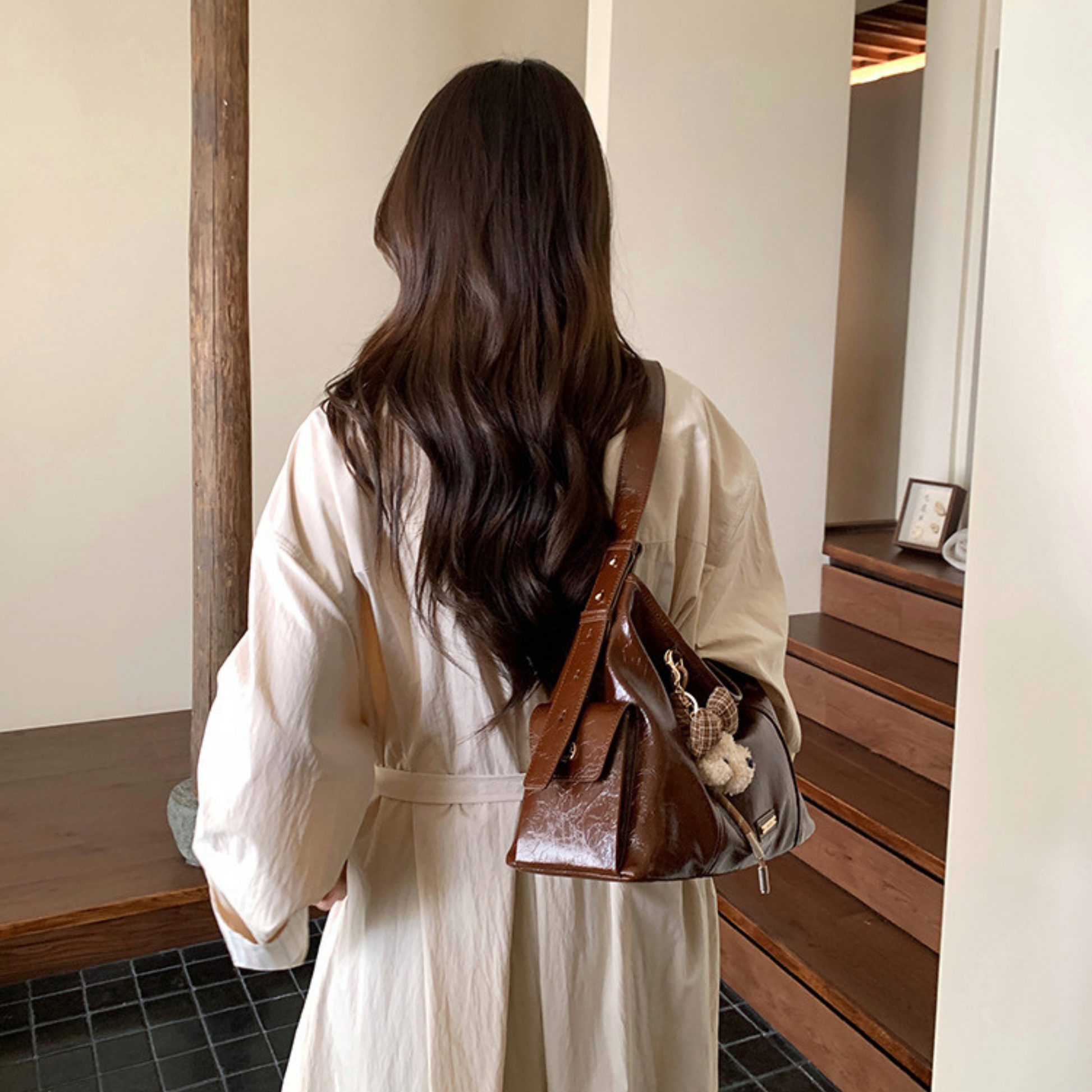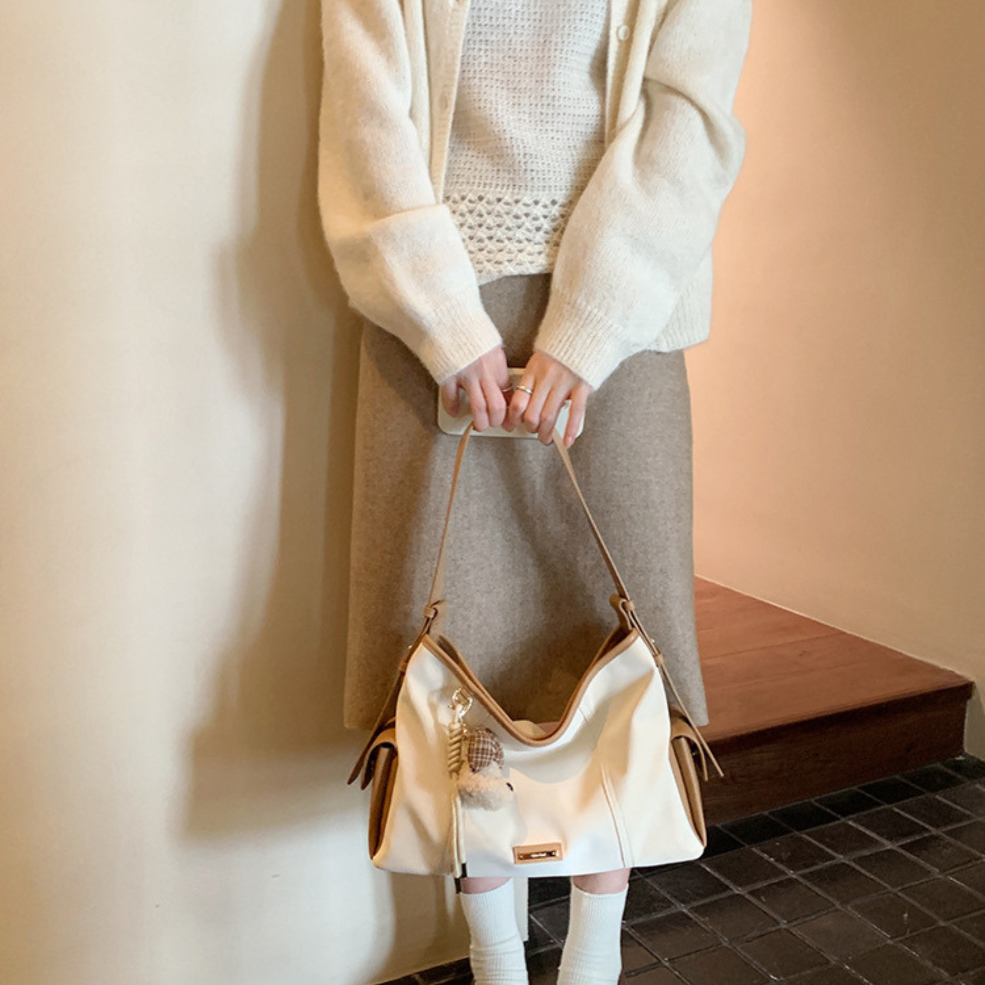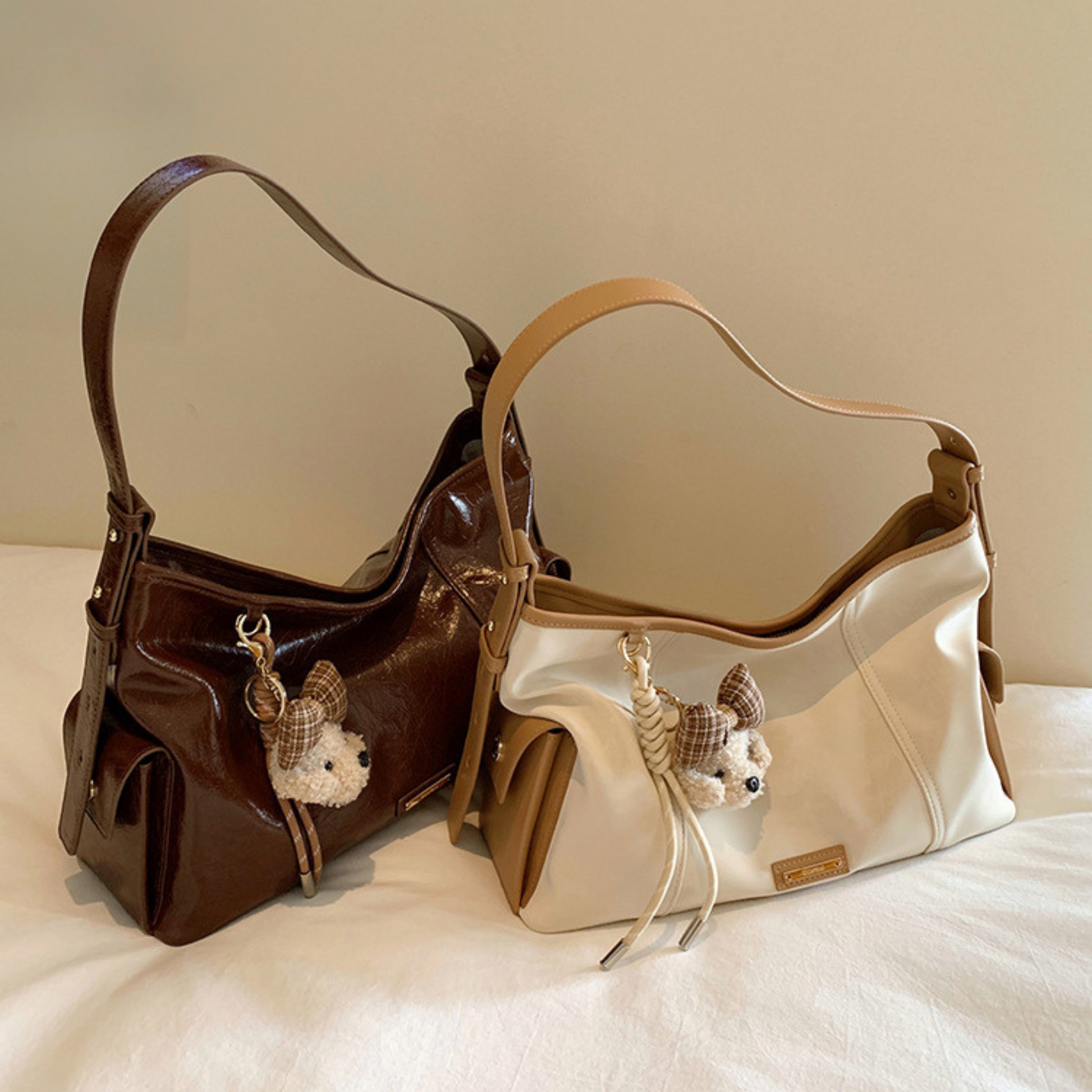Chiếc túi xách da trơn phối ngăn hộp hai bên hông, kèm thêm charm gấu xinh. Quai đeo có thể sử dụng theo hai kiểu: đeo vai hoặc xách tay tuỳ ý. Bên trong túi rộng rãi có thể dùng đựng nhiều đồ dùng cần thiết hàng ngày như tập A4, iPad mini, sổ tay, điện thoại, bóp ví, bình nước, đồ trang điểm...