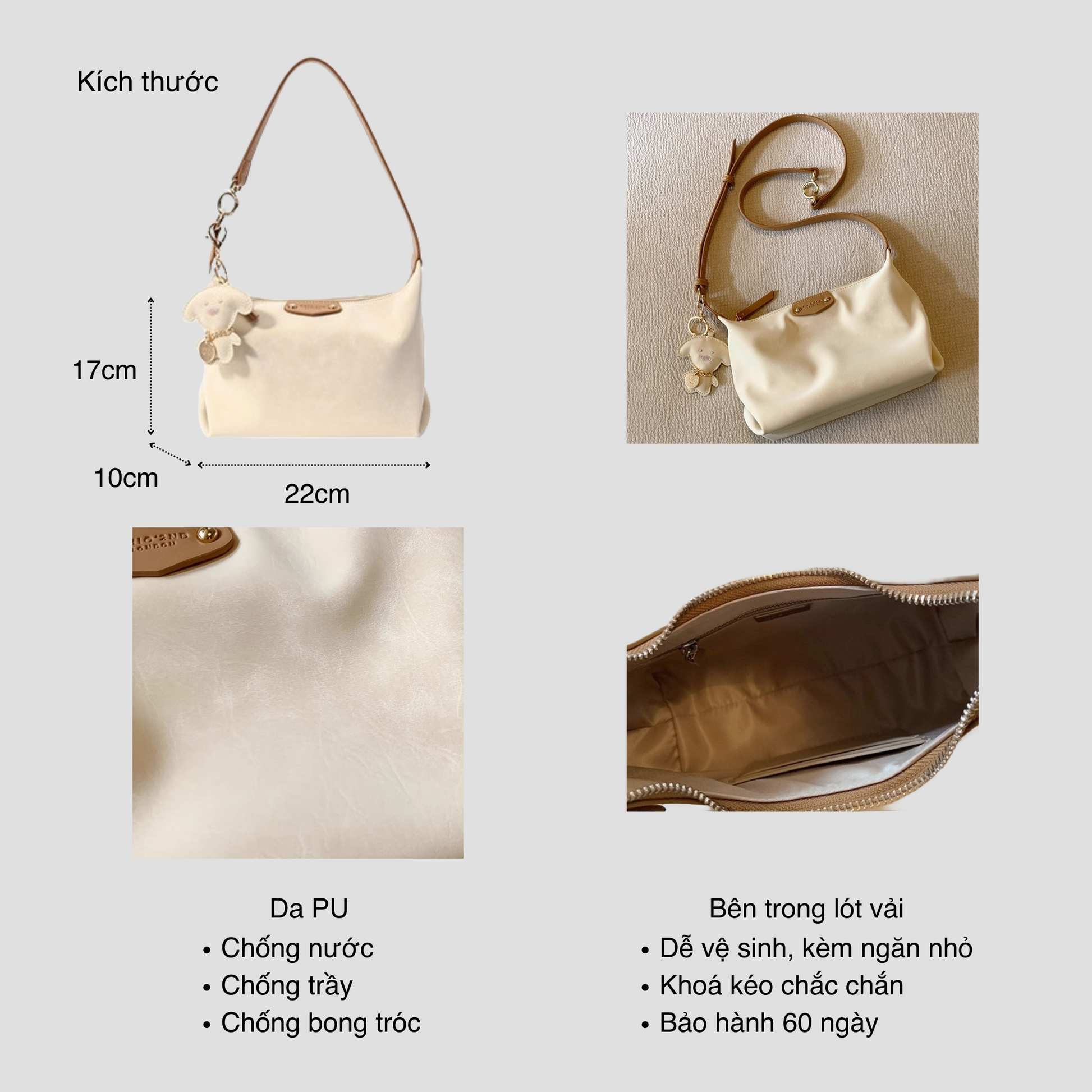 Chiếc túi xách nữ với thiết kế màu trắng trơn phối quai nâu, kèm thêm charm đơn giản. Điểm nổi bật của túi là dây đeo linh hoạt, bạn có thể sử dụng ba kiểu: cầm tay, đeo vai hoặc đeo chéo tuỳ thích.