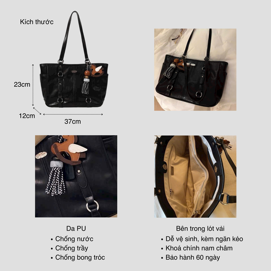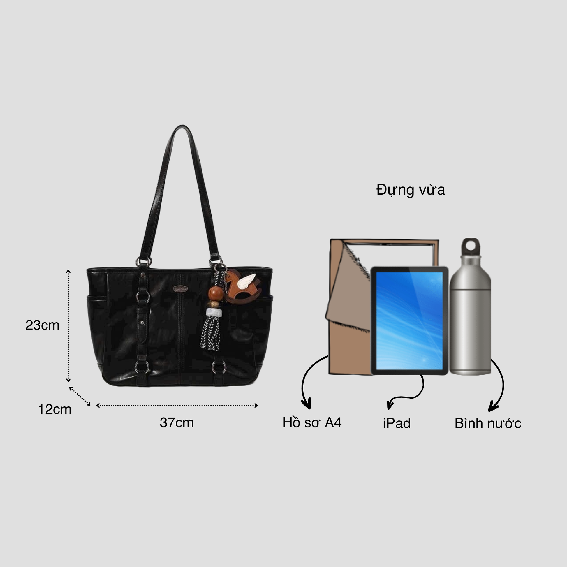 Chiếc túi xách da trơn kiểu dáng bigsize phối kèm charm xinh mà các nàng không nên bỏ qua. Quai đeo có thể tùy ý sử dụng theo hai kiểu: đeo vai hoặc xách tay tuỳ ý. Túi có không gian rộng rãi đủ để chứa nhiều đồ dùng cần thiết hàng ngày như tập hồ sơ A4, iPad, sổ tay, điện thoại, bóp ví, đồ trang điểm...