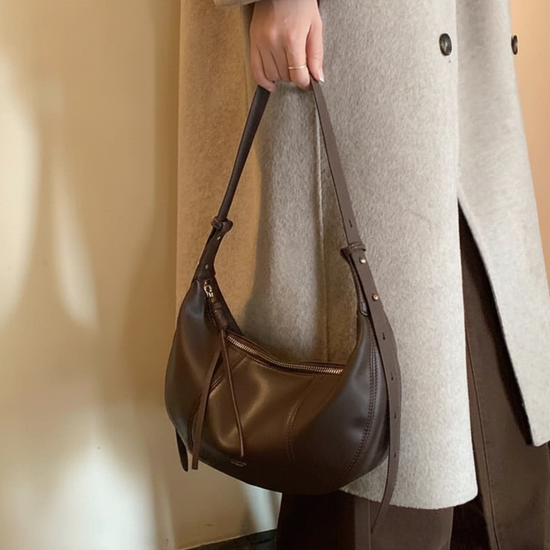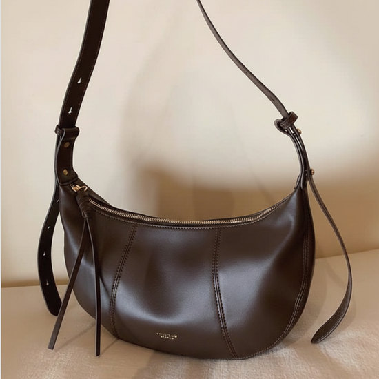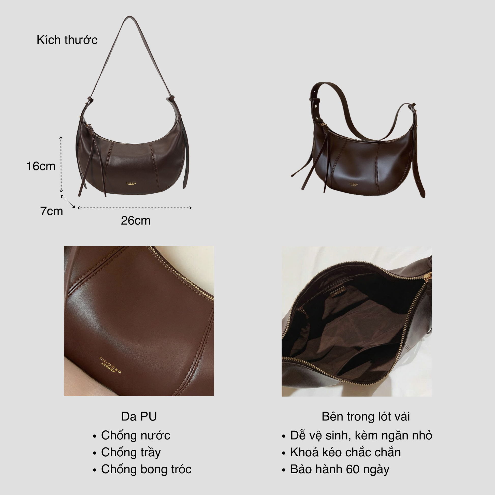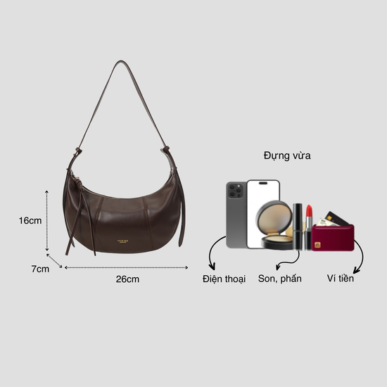 Chiếc túi xách da với thiết kế kiểu dáng half moon thời trang với form túi mềm mại. Điểm nổi bật của túi là dây đeo linh hoạt, bạn có thể sử dụng ba kiểu: cầm tay, đeo vai hoặc đeo chéo tuỳ thích.