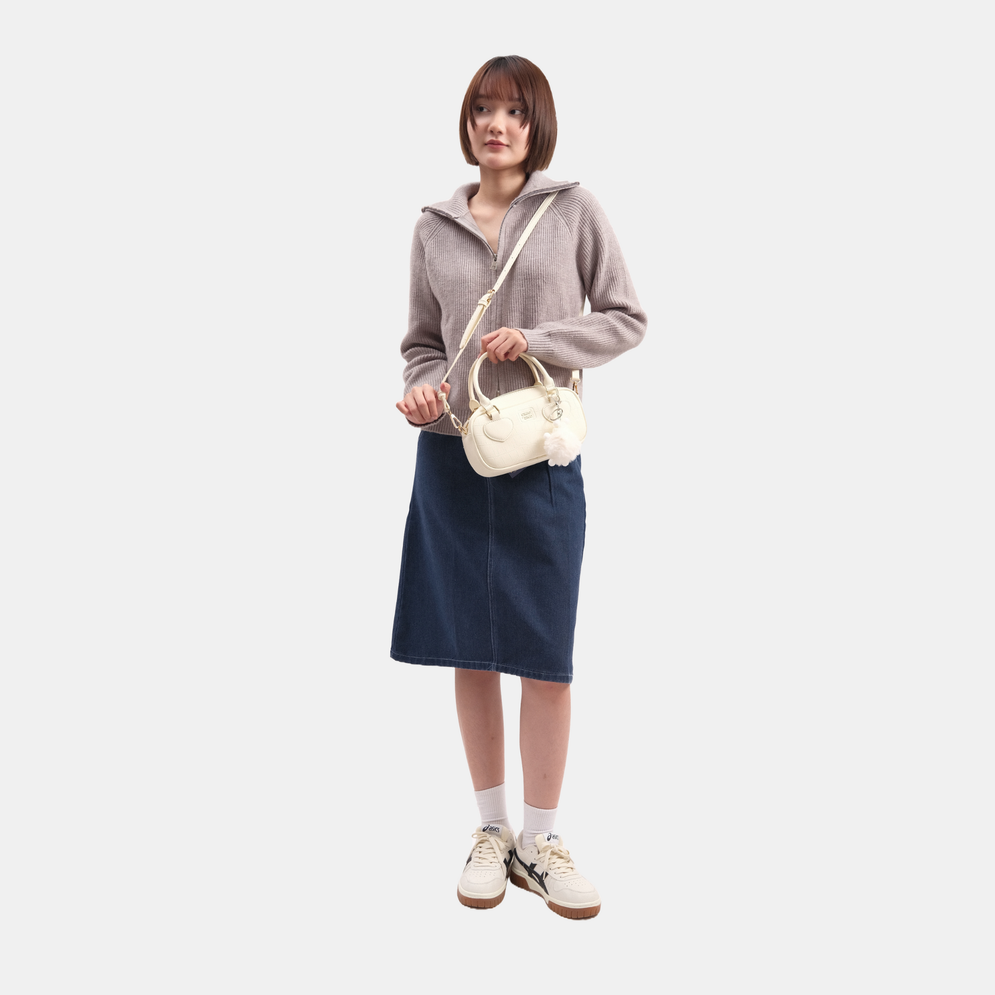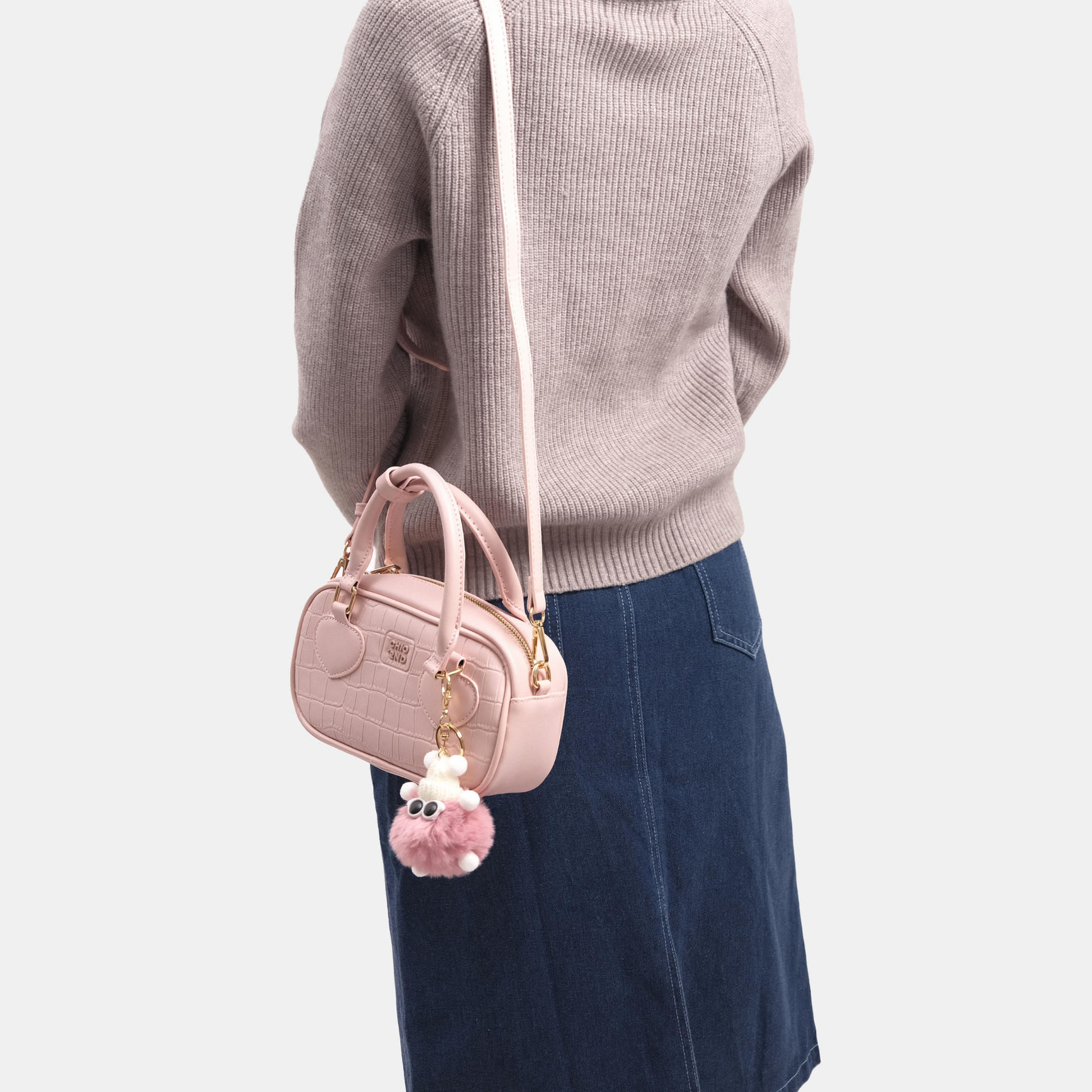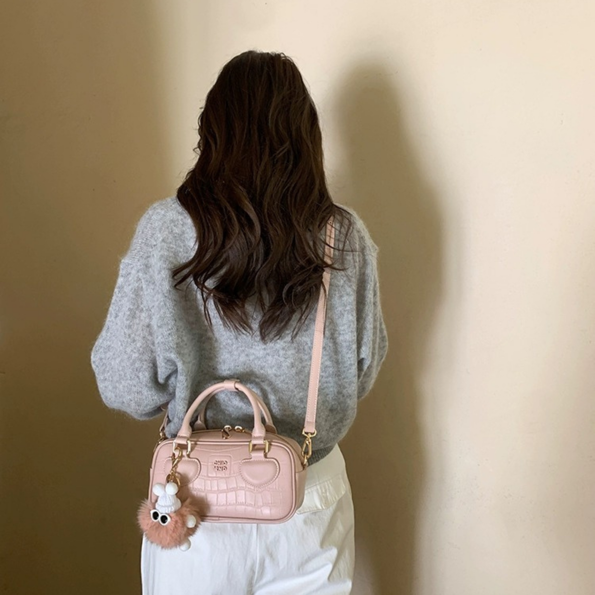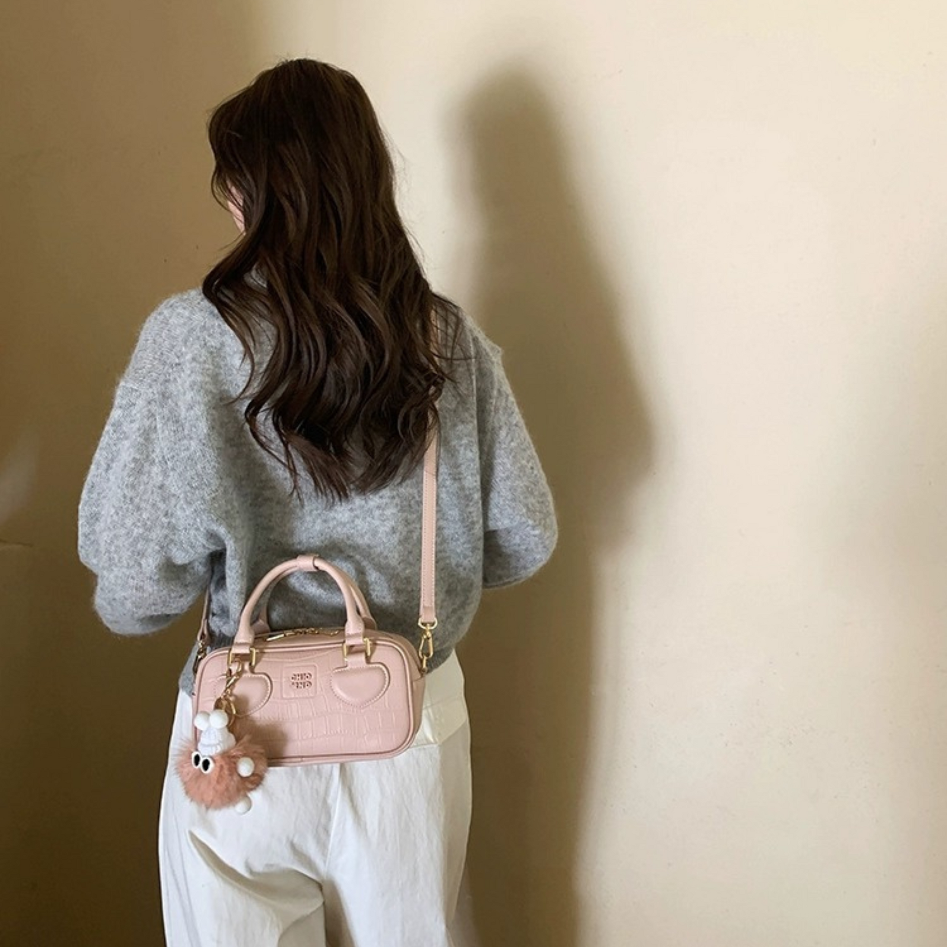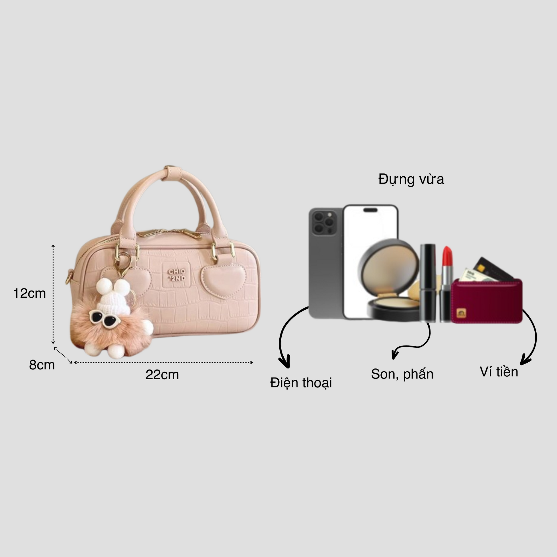 Chiếc túi xách da vân có thiết kế kiểu hộp thanh lịch kèm charm xinh xắn. Điểm nổi bật của túi là dây đeo linh hoạt, bạn có thể sử dụng theo ba kiểu: cầm tay, đeo vai hoặc đeo chéo tuỳ thích.