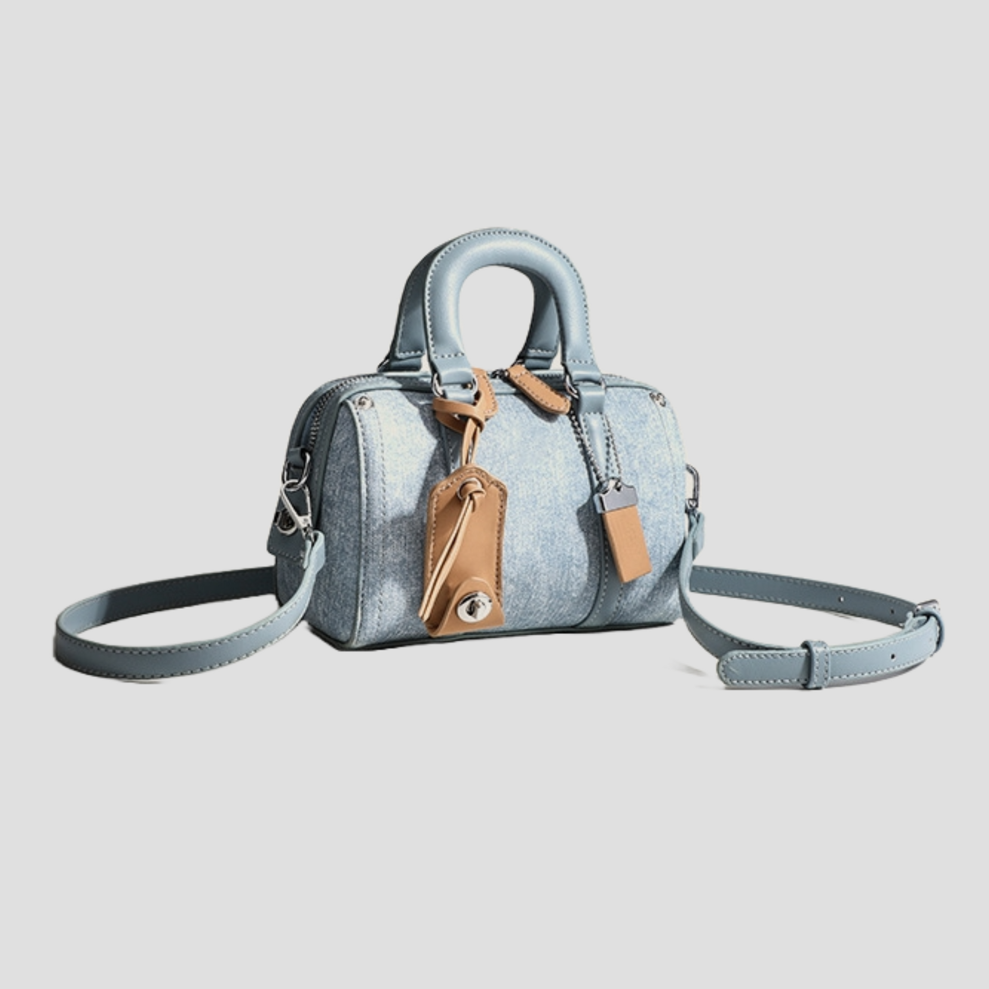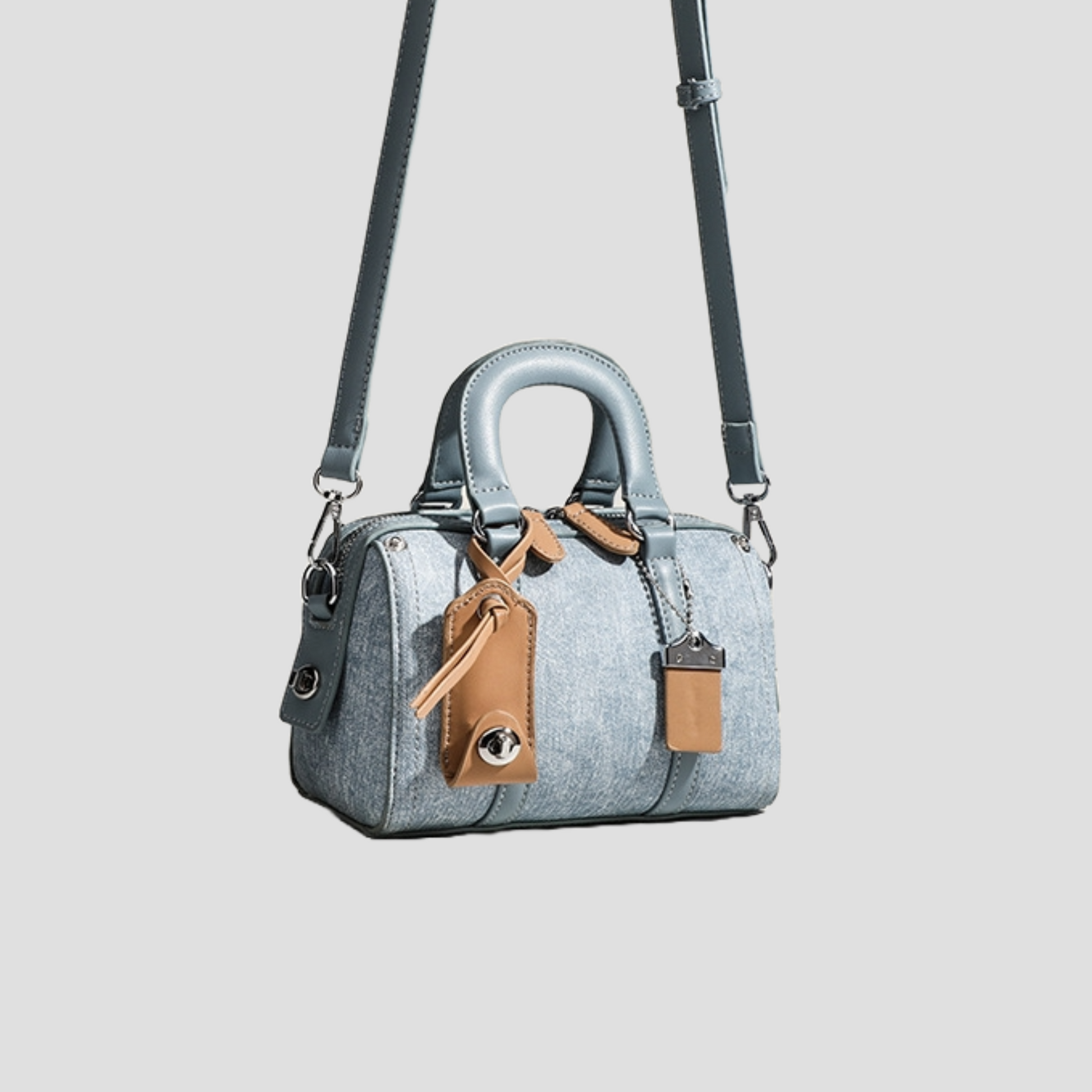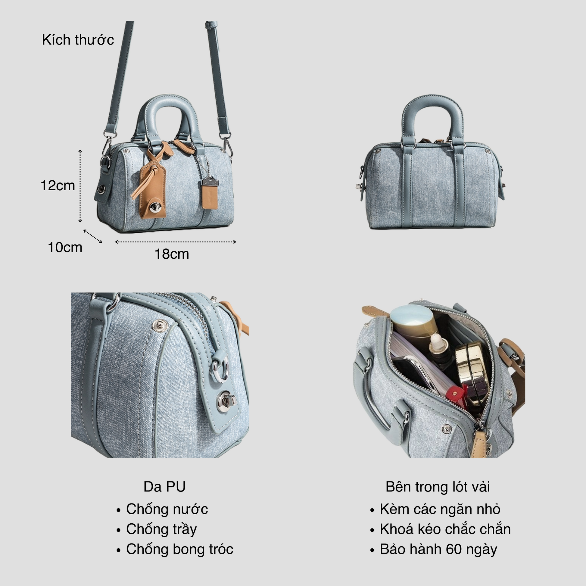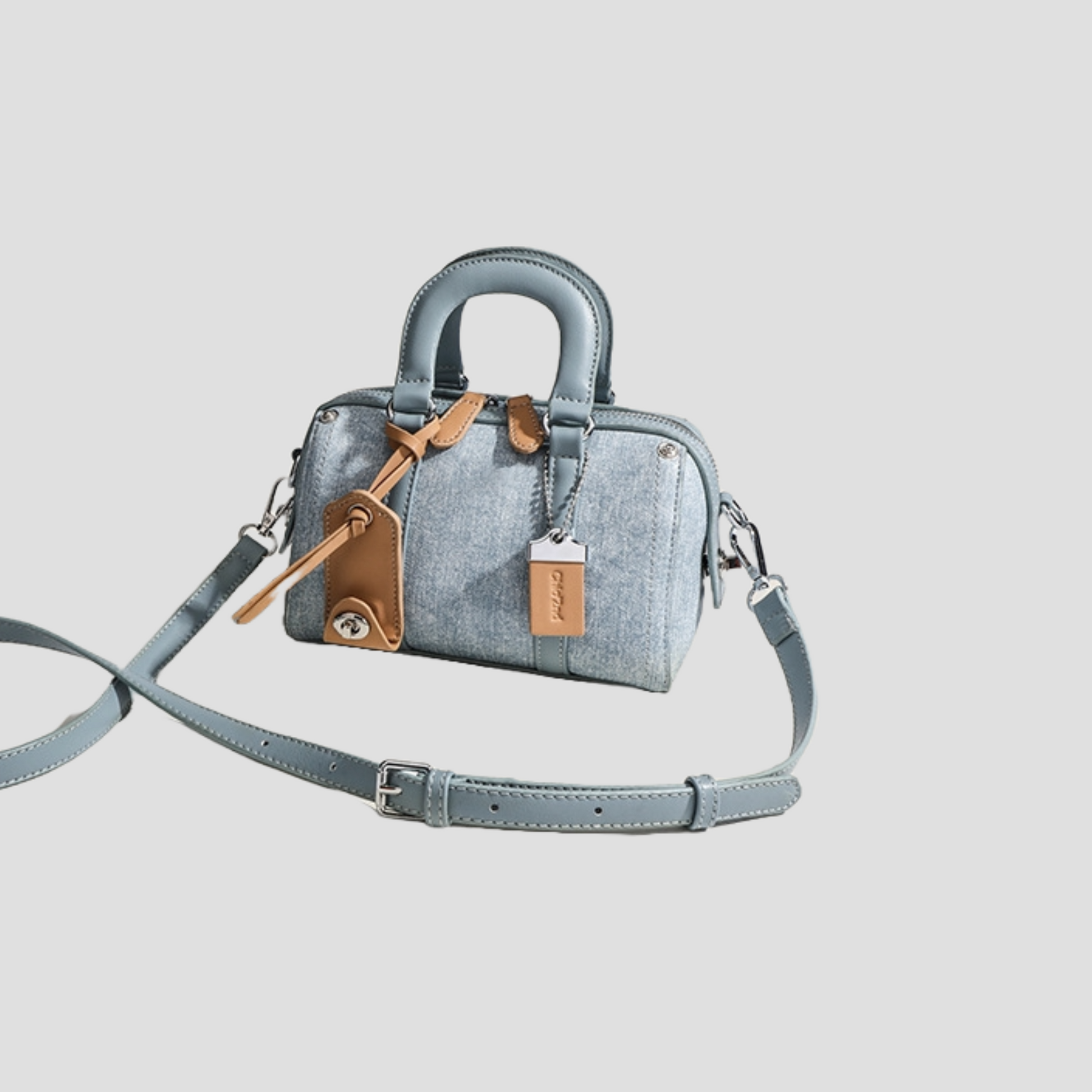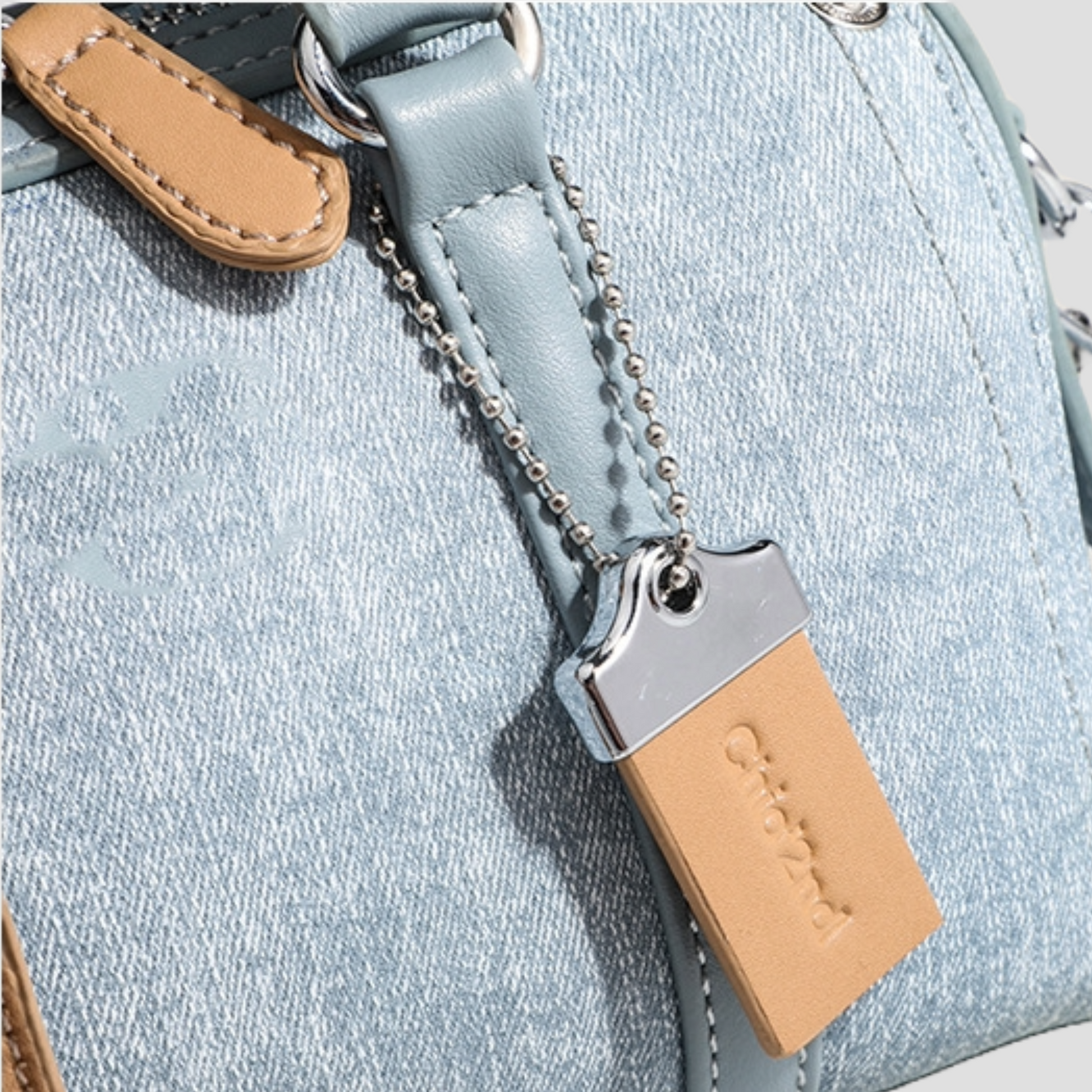 Chiếc túi xách da kiểu denim với thiết kế dáng bầu lạ mắt, kèm thêm charm xinh. Điểm nổi bật của túi là dây đeo linh hoạt, bạn có thể sử dụng theo ba kiểu: cầm tay, đeo vai hoặc đeo chéo tuỳ thích.