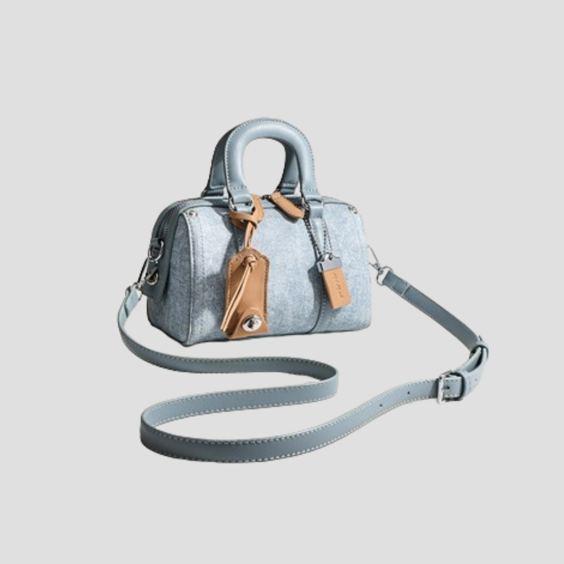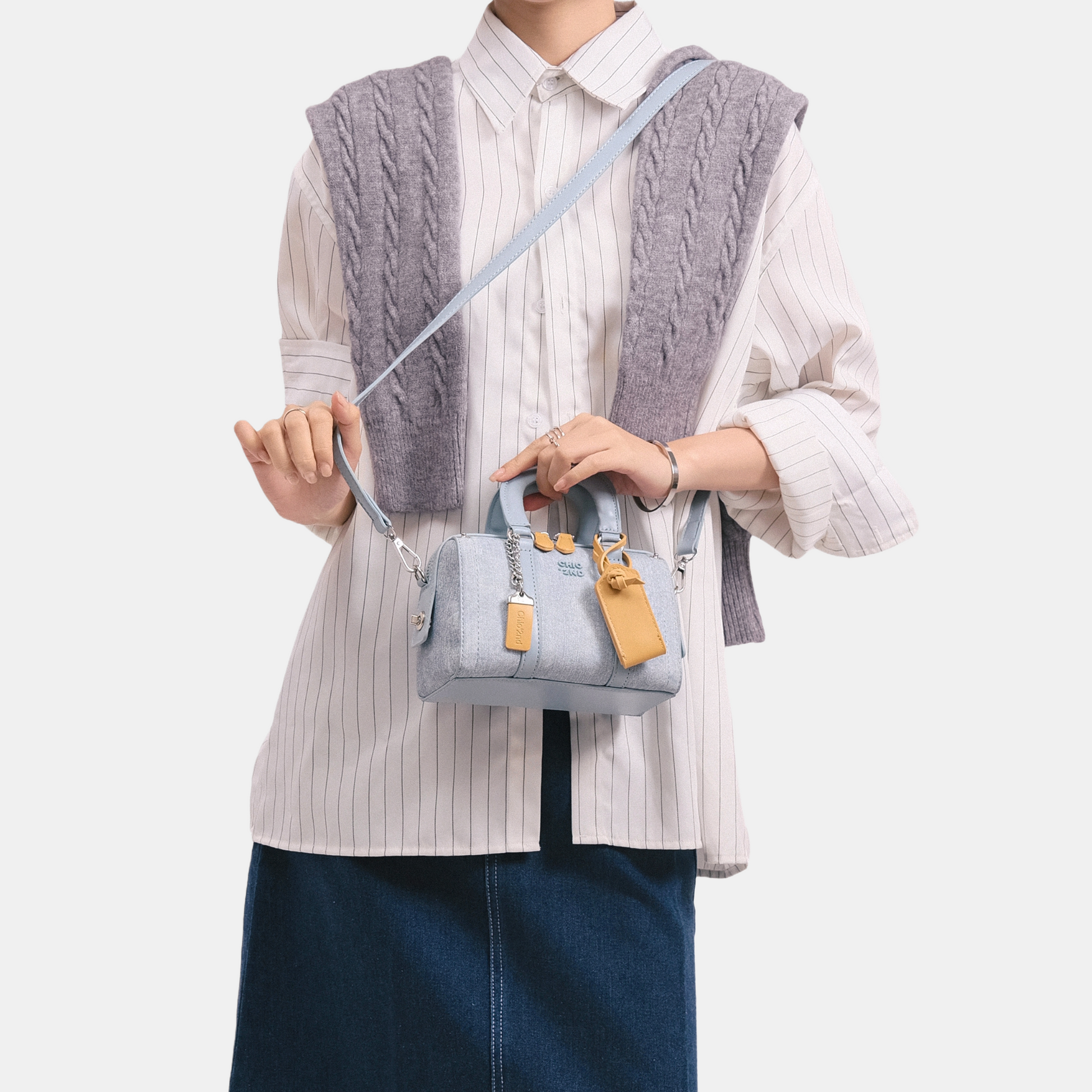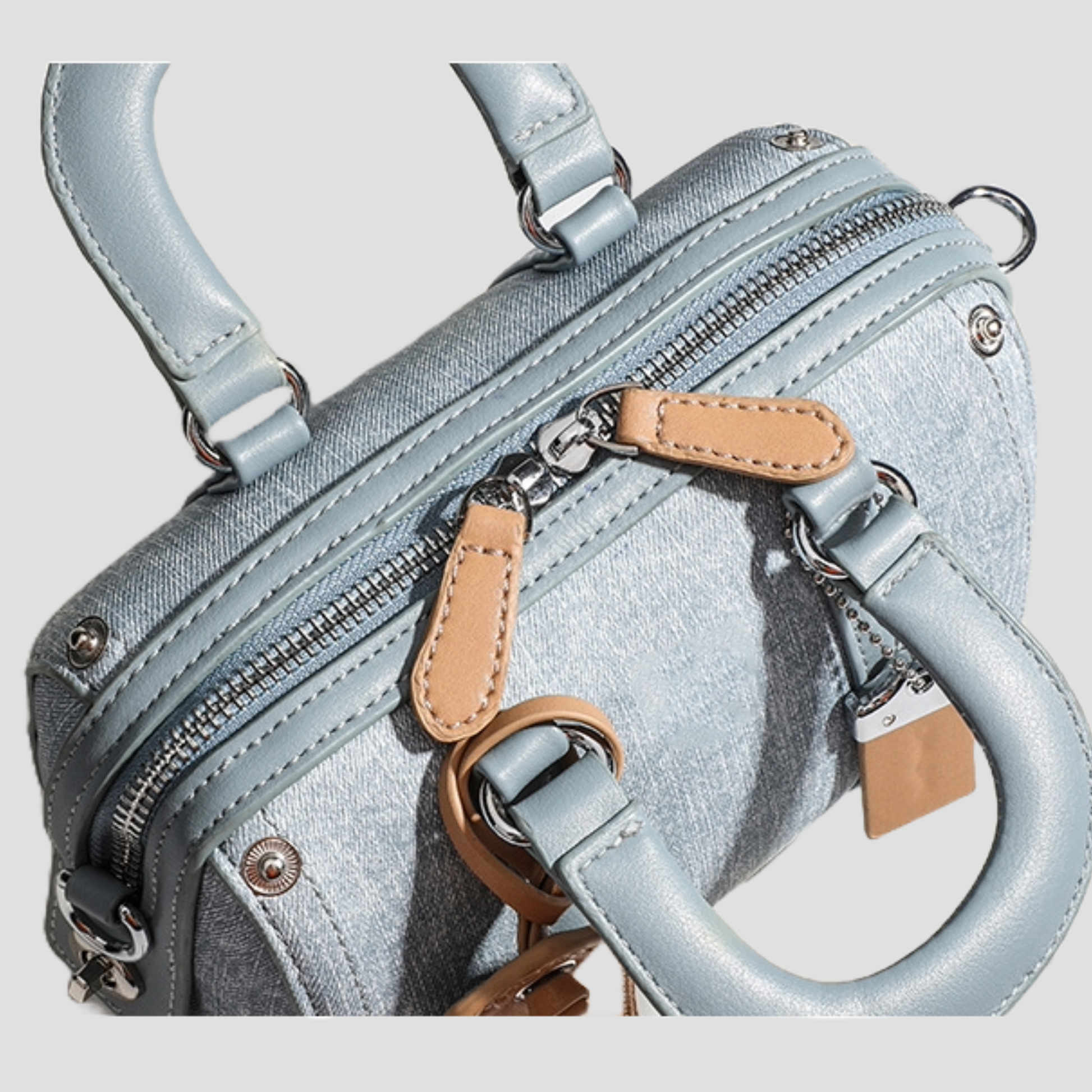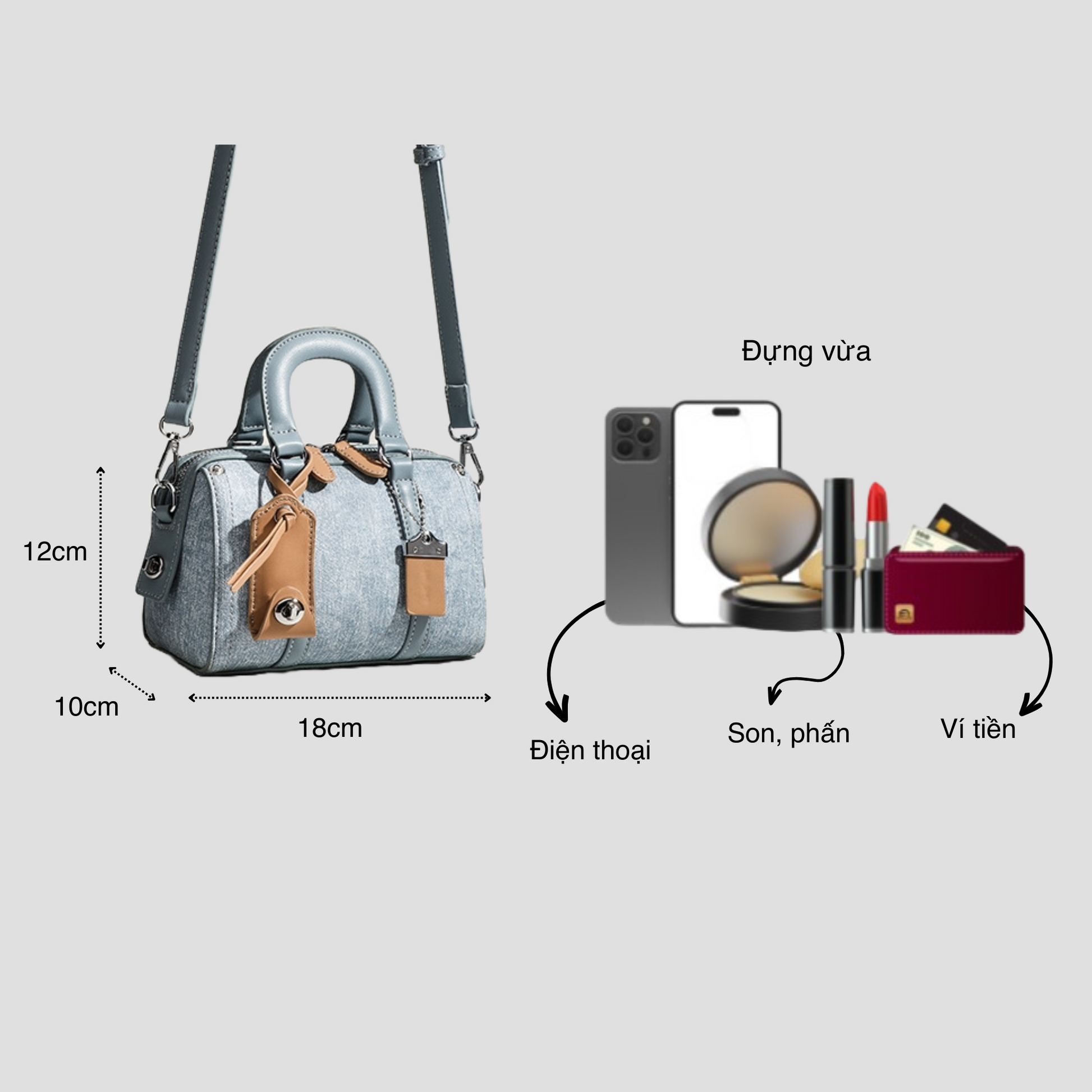 Chiếc túi xách da kiểu denim với thiết kế dáng bầu lạ mắt, kèm thêm charm xinh. Điểm nổi bật của túi là dây đeo linh hoạt, bạn có thể sử dụng theo ba kiểu: cầm tay, đeo vai hoặc đeo chéo tuỳ thích.