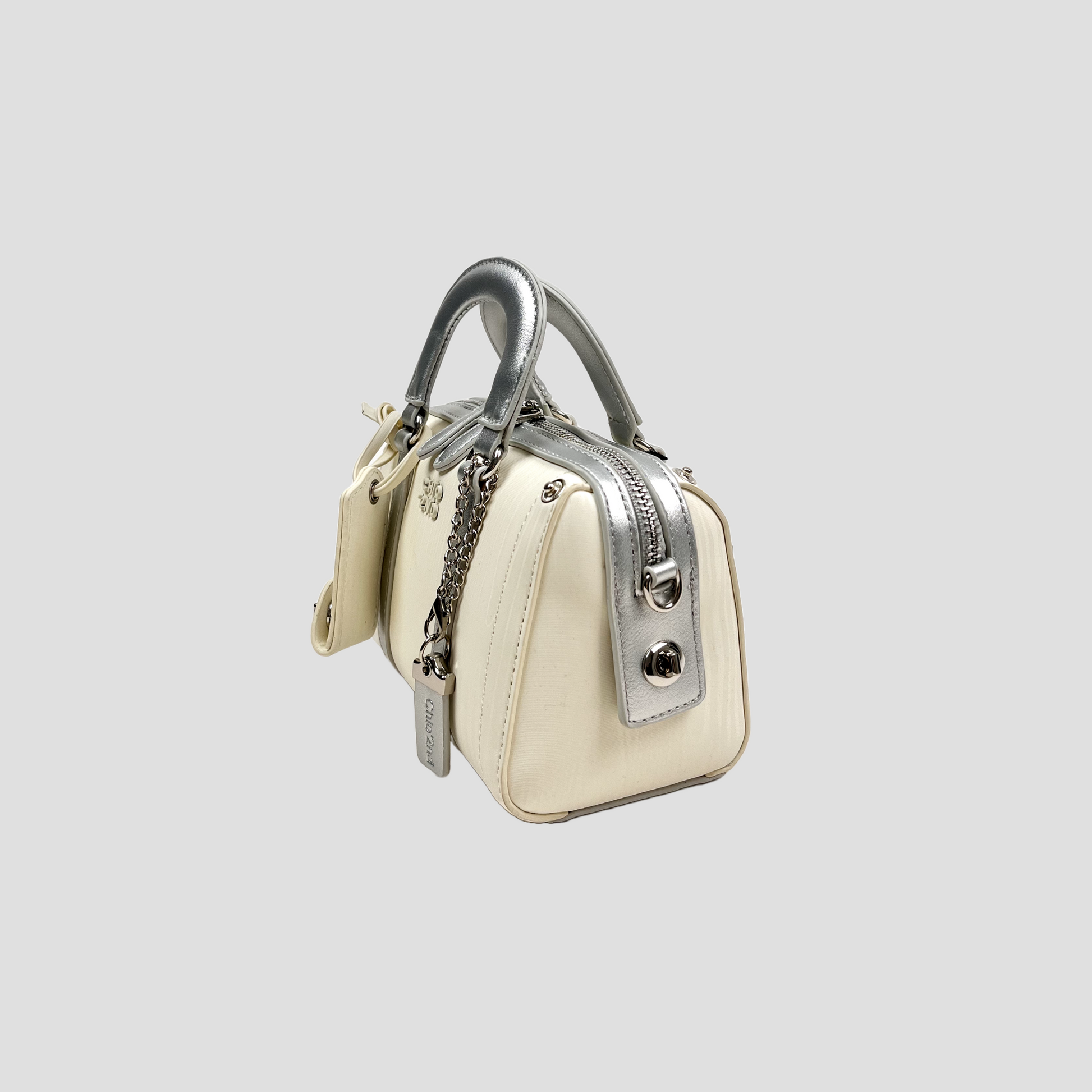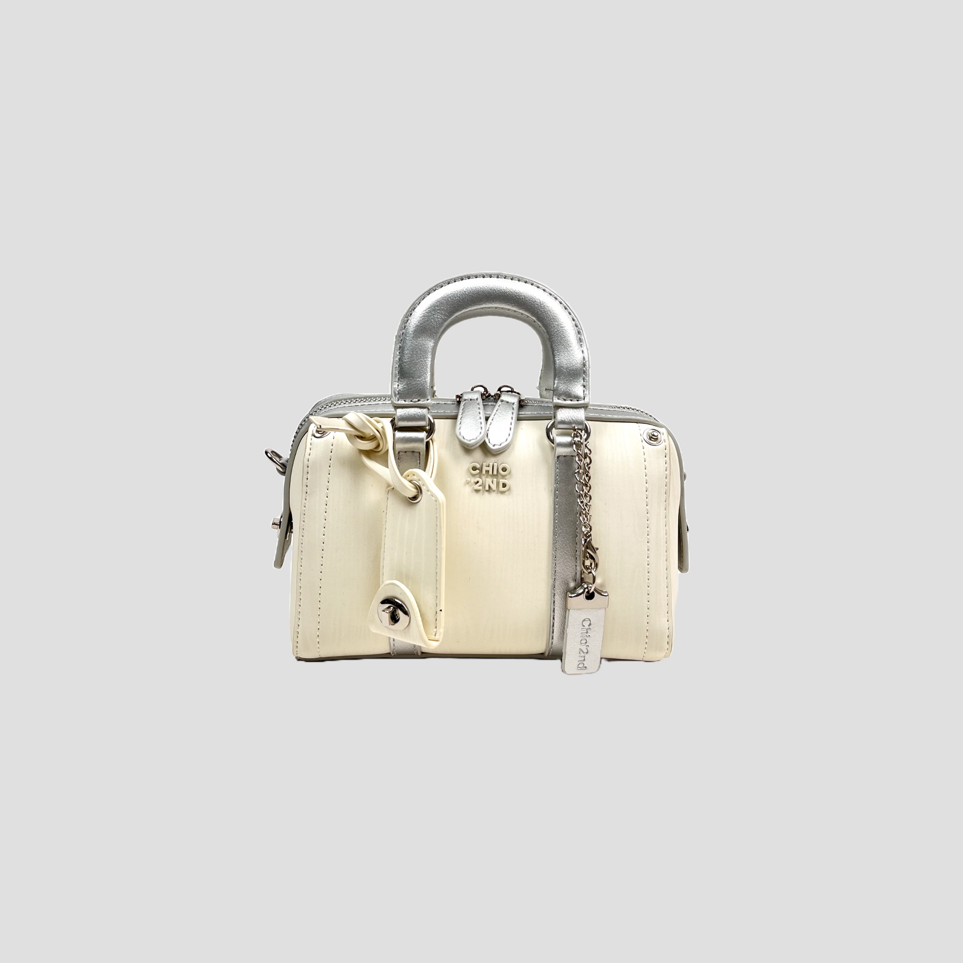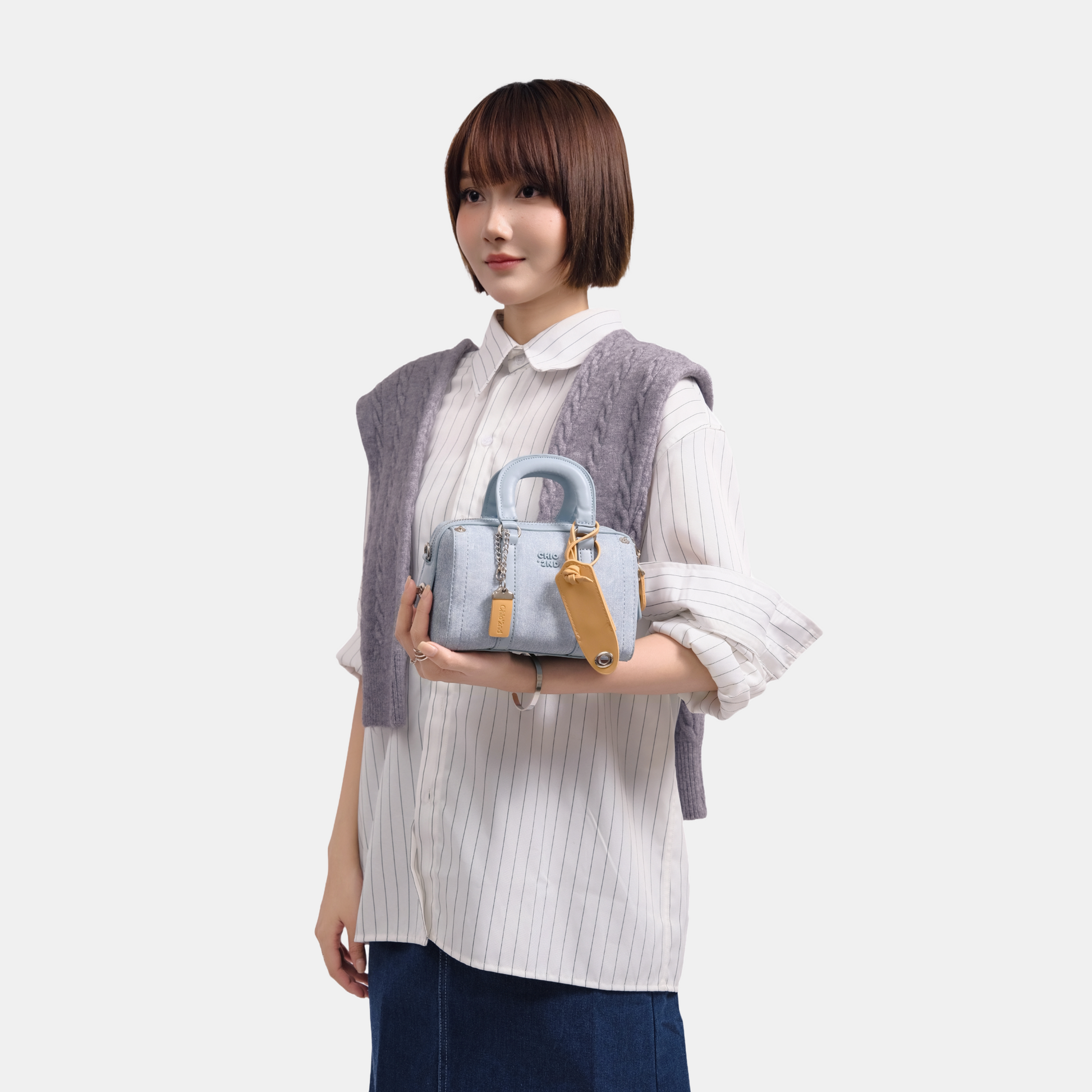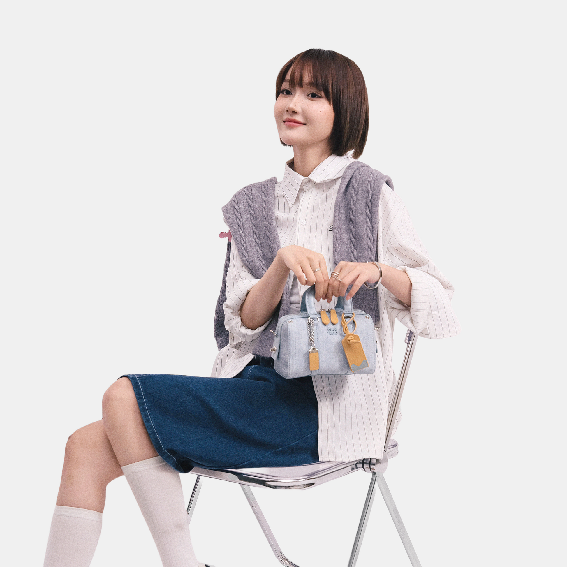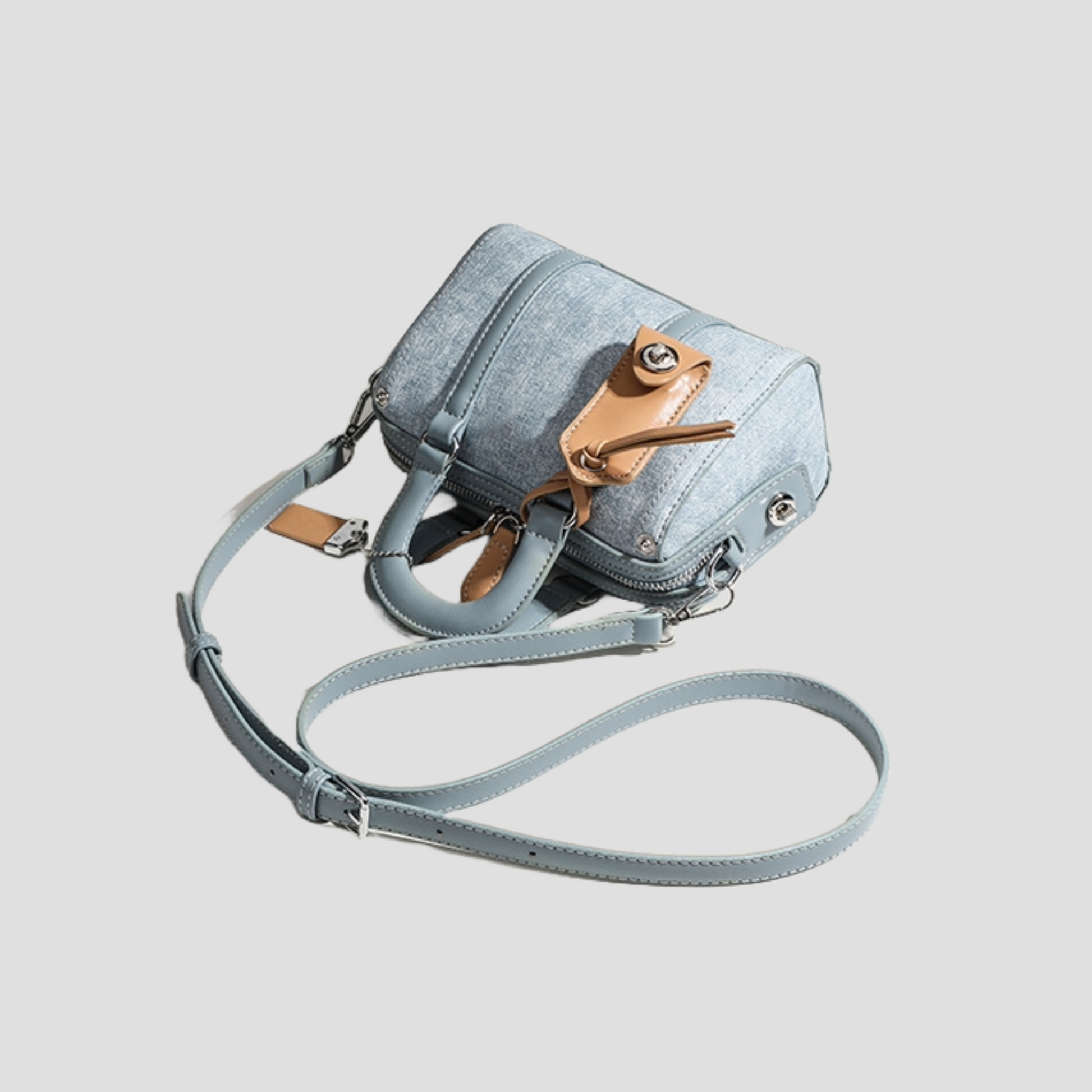 Chiếc túi xách da kiểu denim với thiết kế dáng bầu lạ mắt, kèm thêm charm xinh. Điểm nổi bật của túi là dây đeo linh hoạt, bạn có thể sử dụng theo ba kiểu: cầm tay, đeo vai hoặc đeo chéo tuỳ thích.