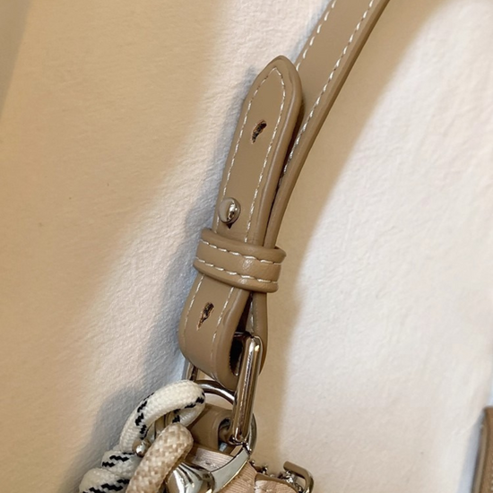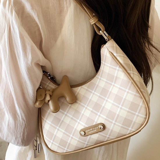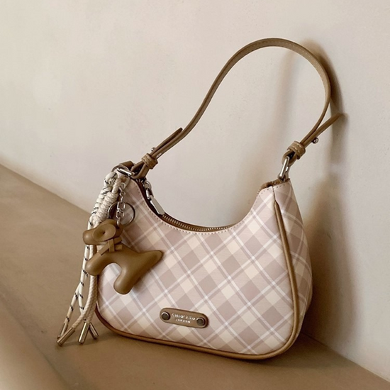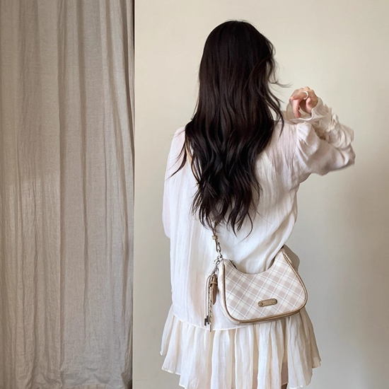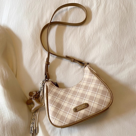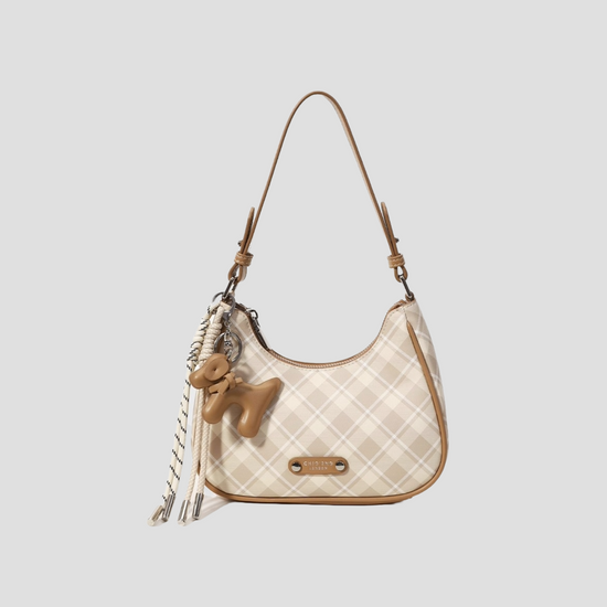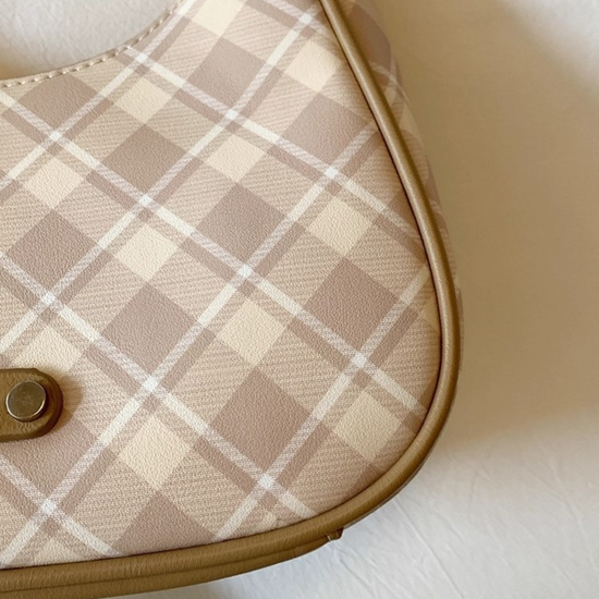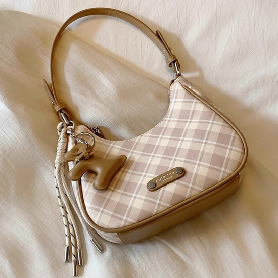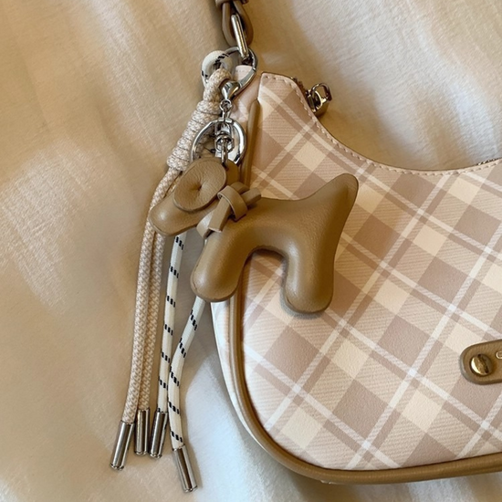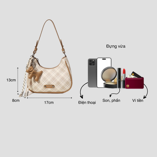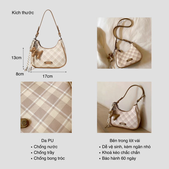 Chiếc túi xách da dáng thuyền với hoạ tiết sọc caro lạ mắt, kèm thêm charm đơn giản. Điểm nổi bật của túi là dây đeo linh hoạt, bạn có thể sử dụng ba kiểu: cầm tay, đeo vai hoặc đeo chéo tuỳ thích.