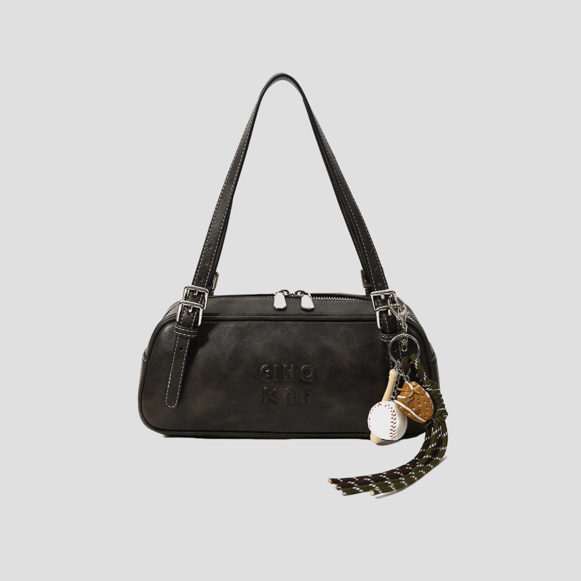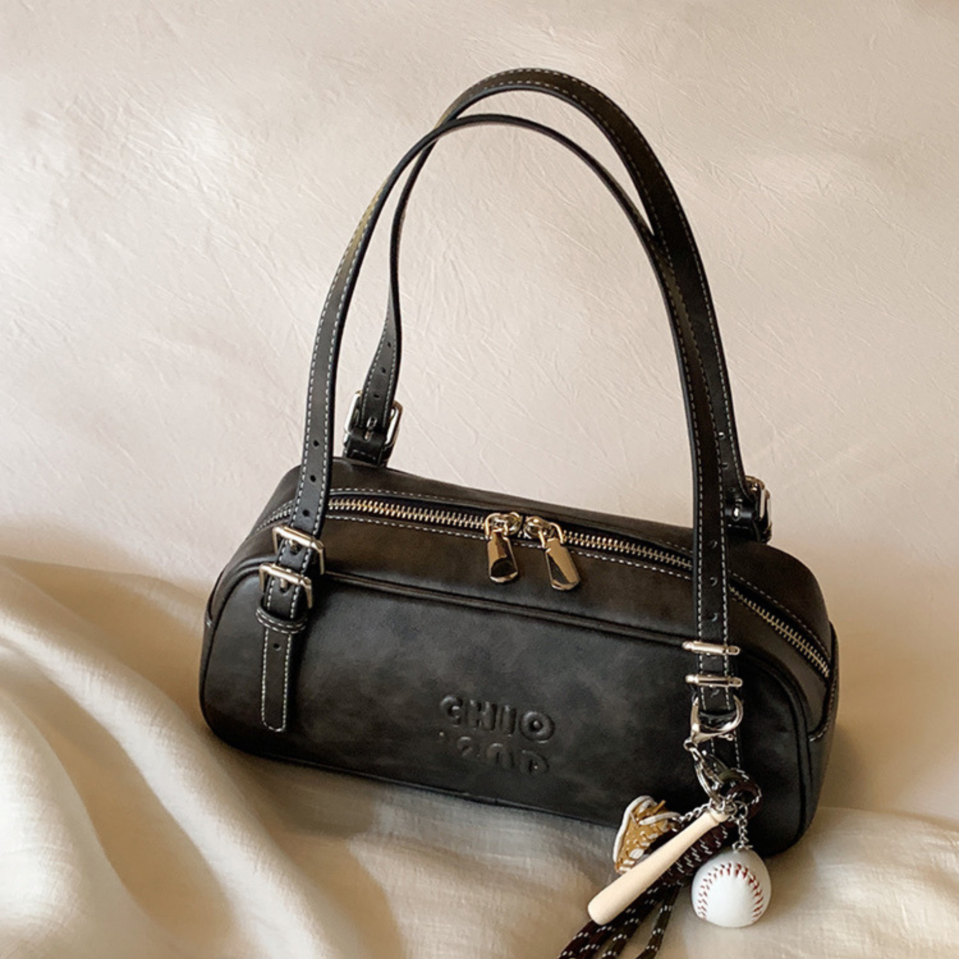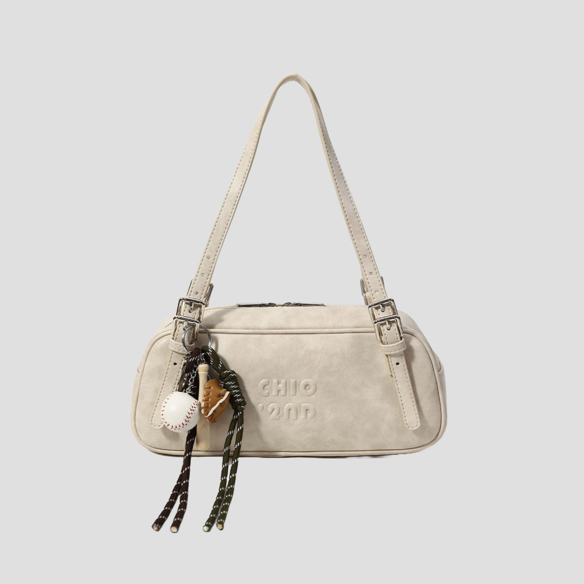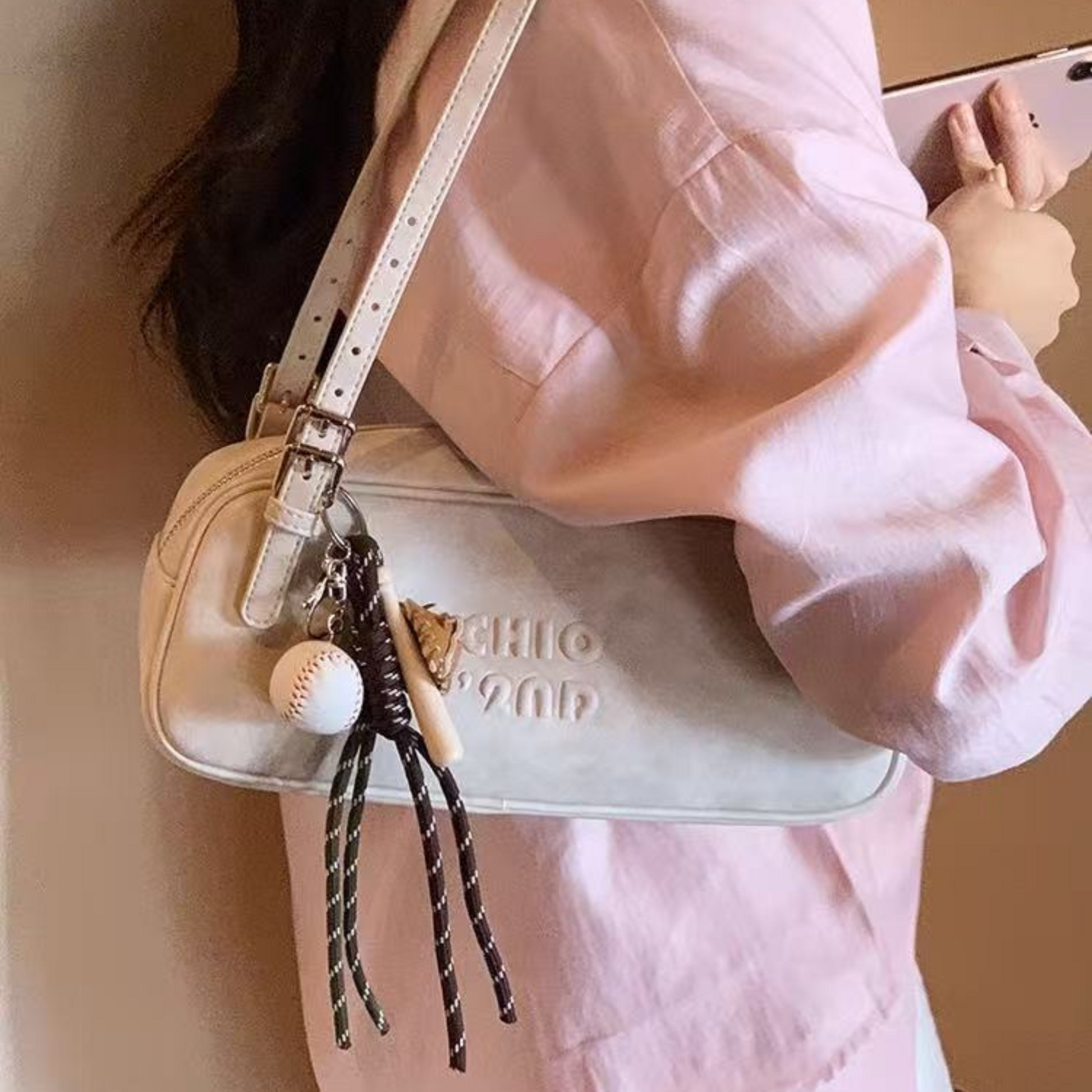 Chiếc túi xách da trơn màu loang lạ mắt, phối thêm charm bóng chày đơn giản nhưng cũng không kém phần năng động. Điểm nổi bật của túi là dây đeo linh hoạt, bạn có thể sử dụng hai kiểu: cầm tay hoặc đeo vai tuỳ thích.