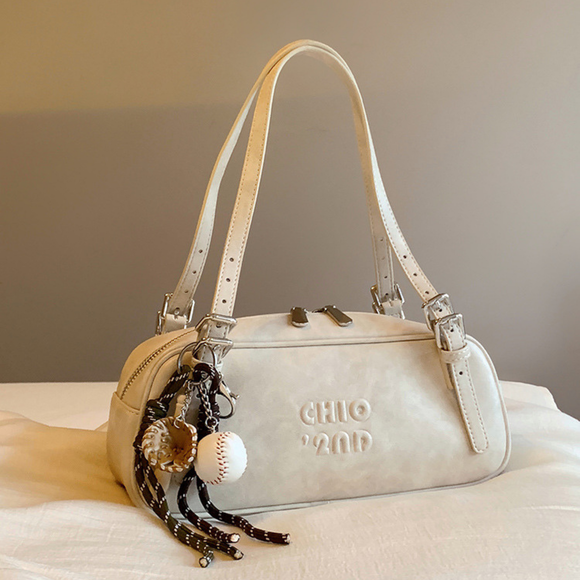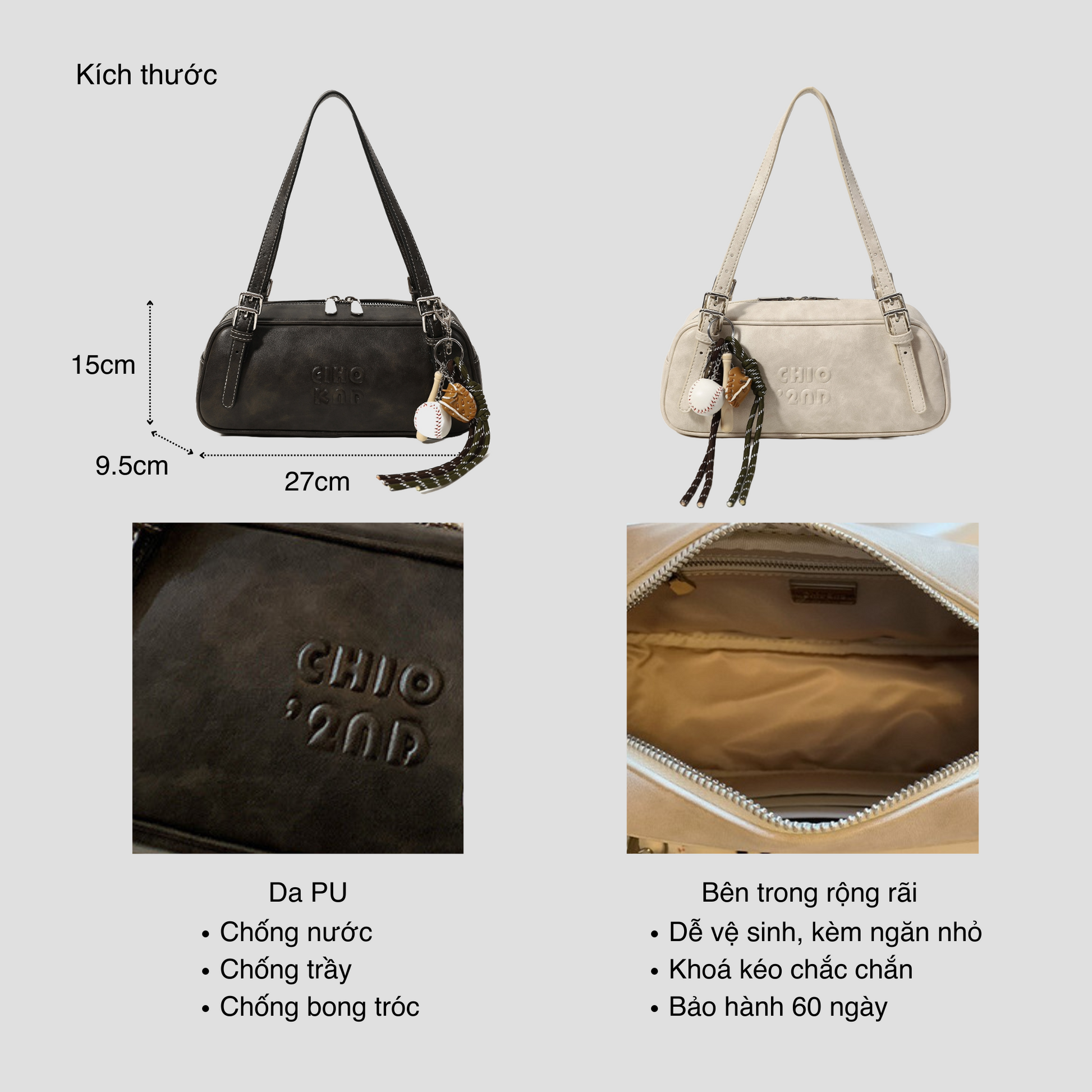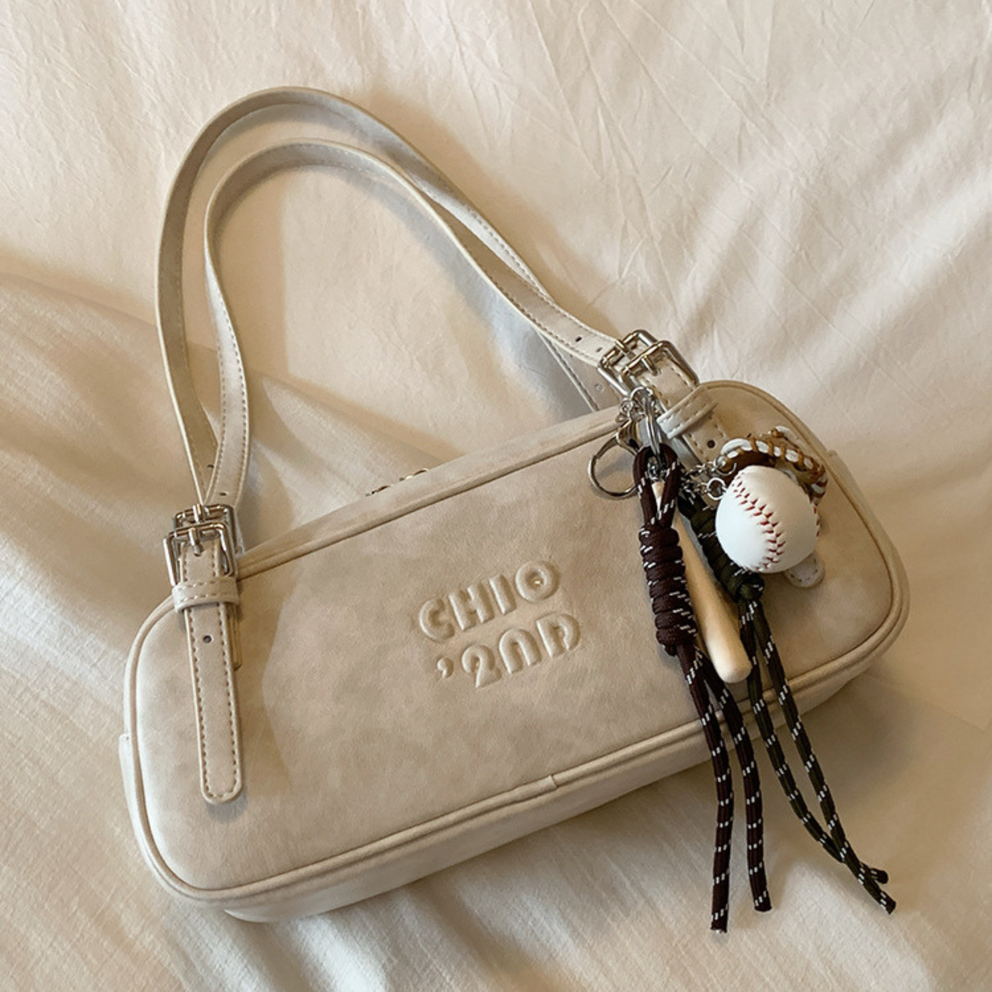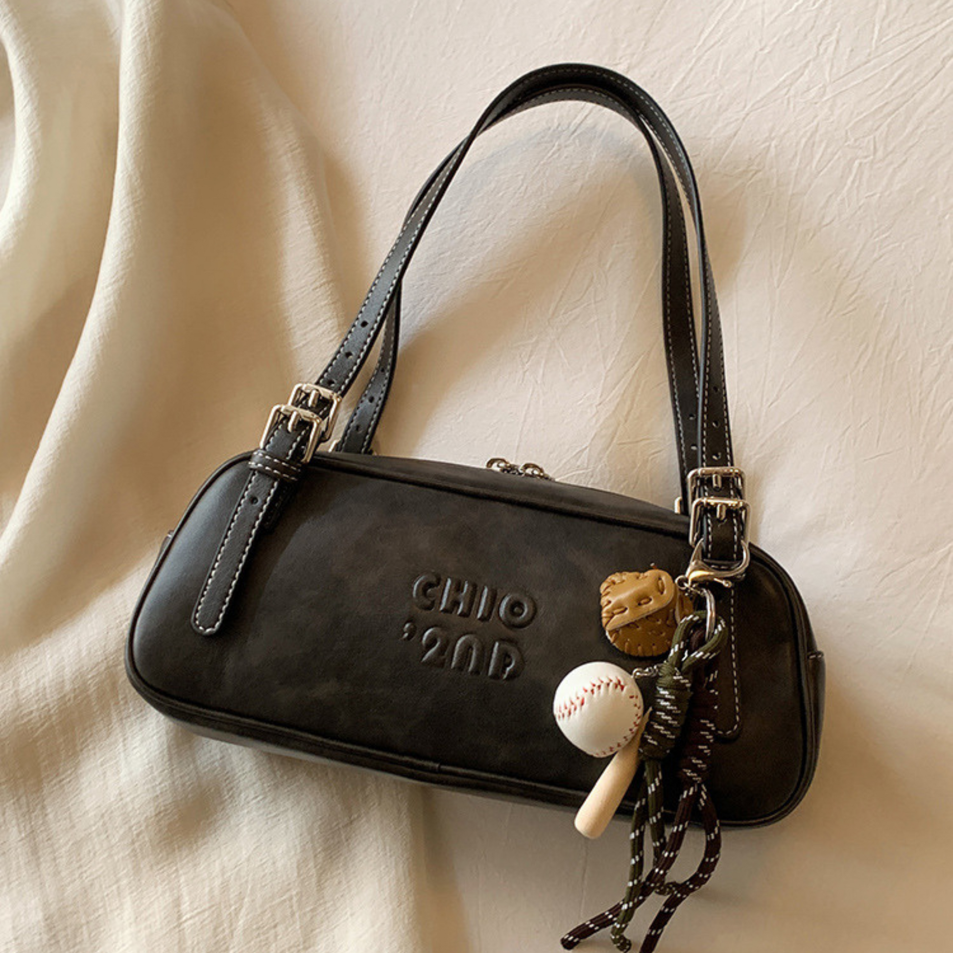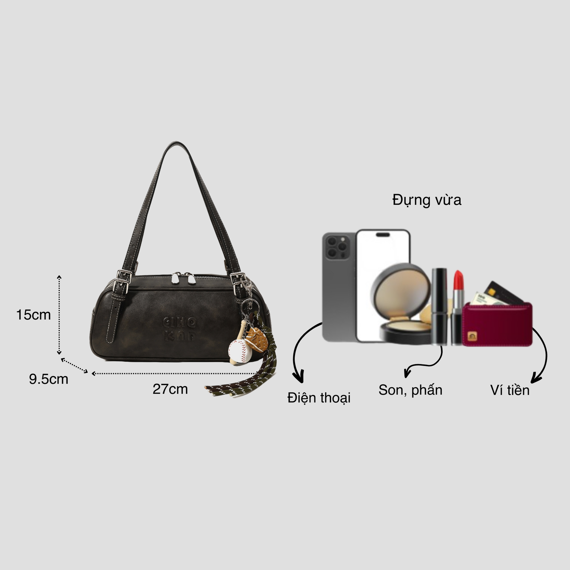 Chiếc túi xách da trơn màu loang lạ mắt, phối thêm charm bóng chày đơn giản nhưng cũng không kém phần năng động. Điểm nổi bật của túi là dây đeo linh hoạt, bạn có thể sử dụng hai kiểu: cầm tay hoặc đeo vai tuỳ thích.