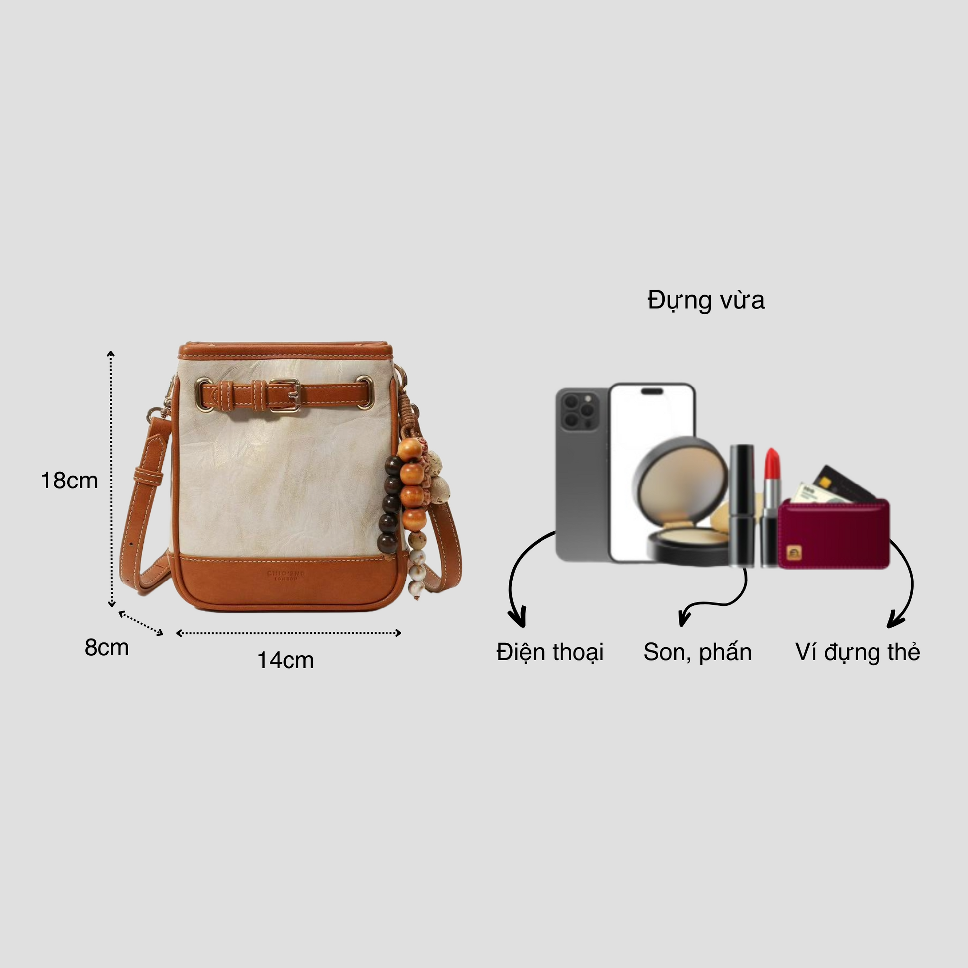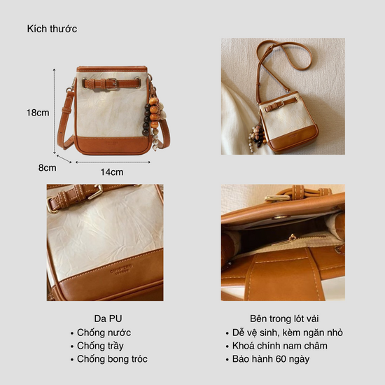 Chiếc túi xách với thiết kế đứng form phối viền màu, kèm charm chuỗi hạt đơn giản. Túi có kèm dây đeo chéo tháo rời, bạn có thể sử dụng theo hai kiểu: đeo vai hoặc đeo chéo tuỳ thích.