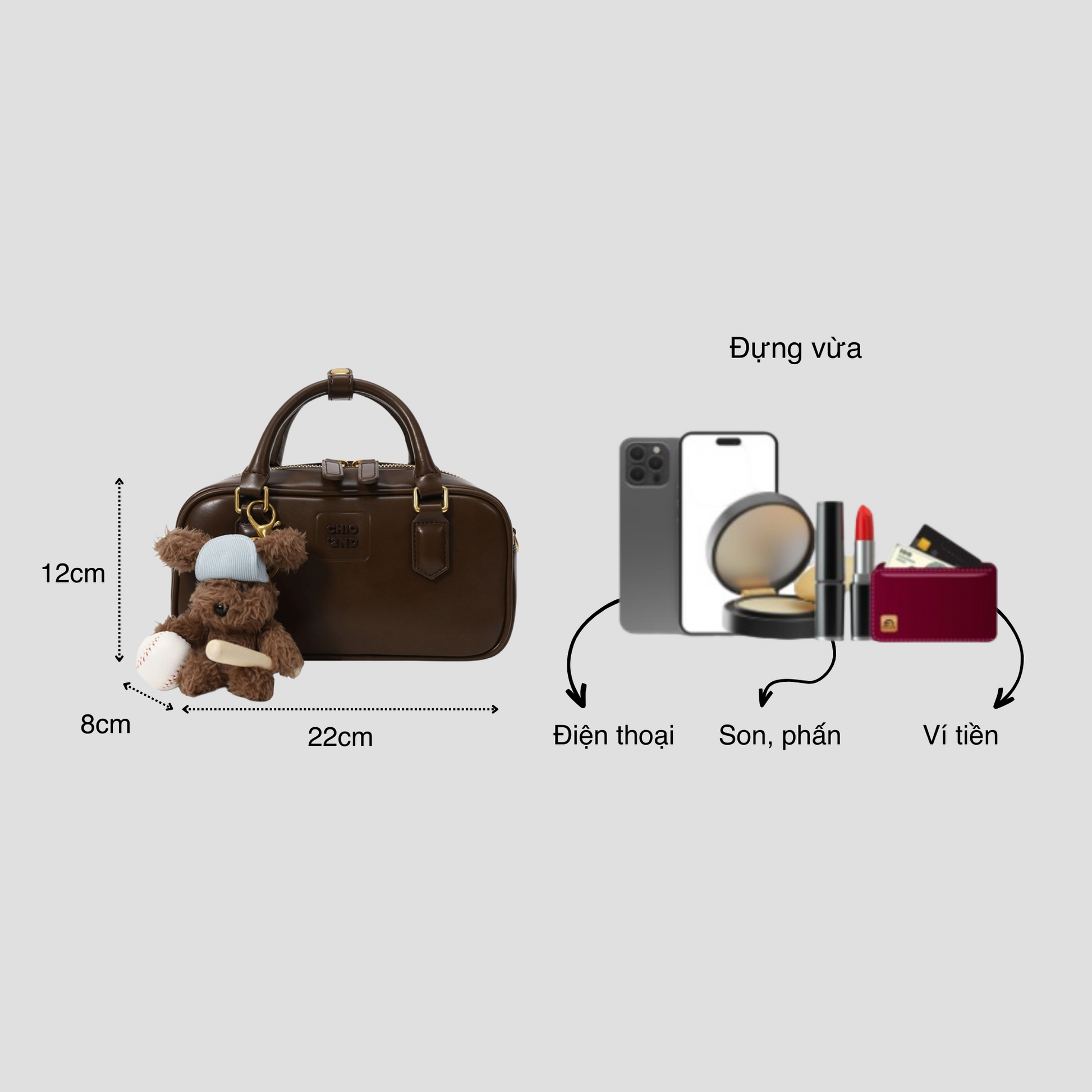 Chiếc túi xách da trơn kiểu hộp phối charm gấu bóng chày xinh xắn, mang hơi hướng vintage. Điểm nổi bật của túi là dây đeo linh hoạt, bạn có thể sử dụng ba kiểu: cầm tay, đeo vai hoặc đeo chéo tuỳ thích.
