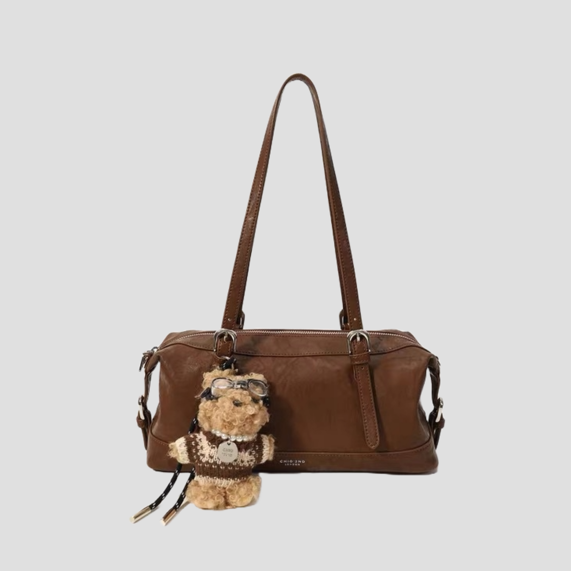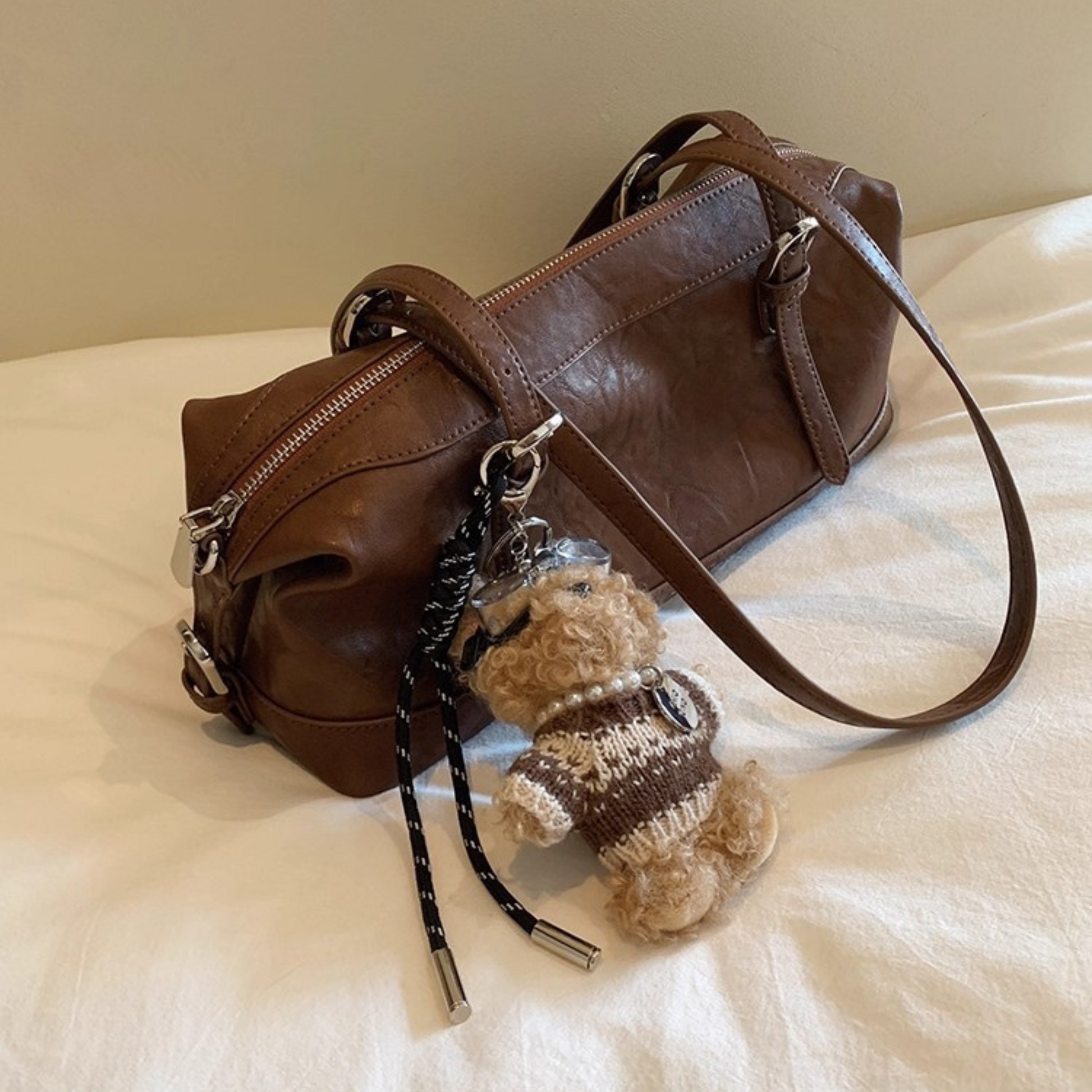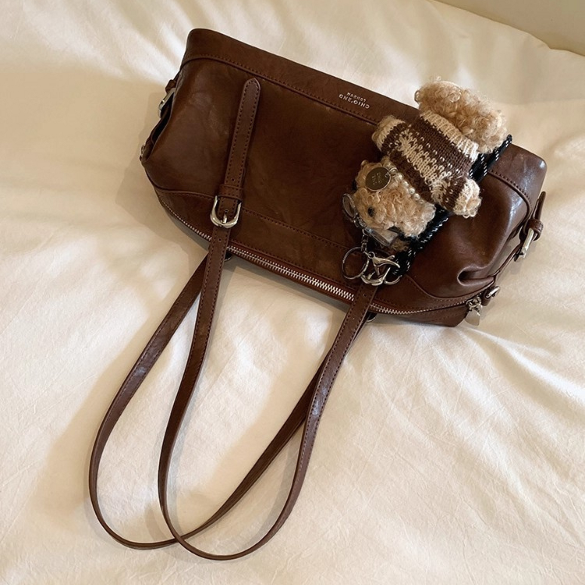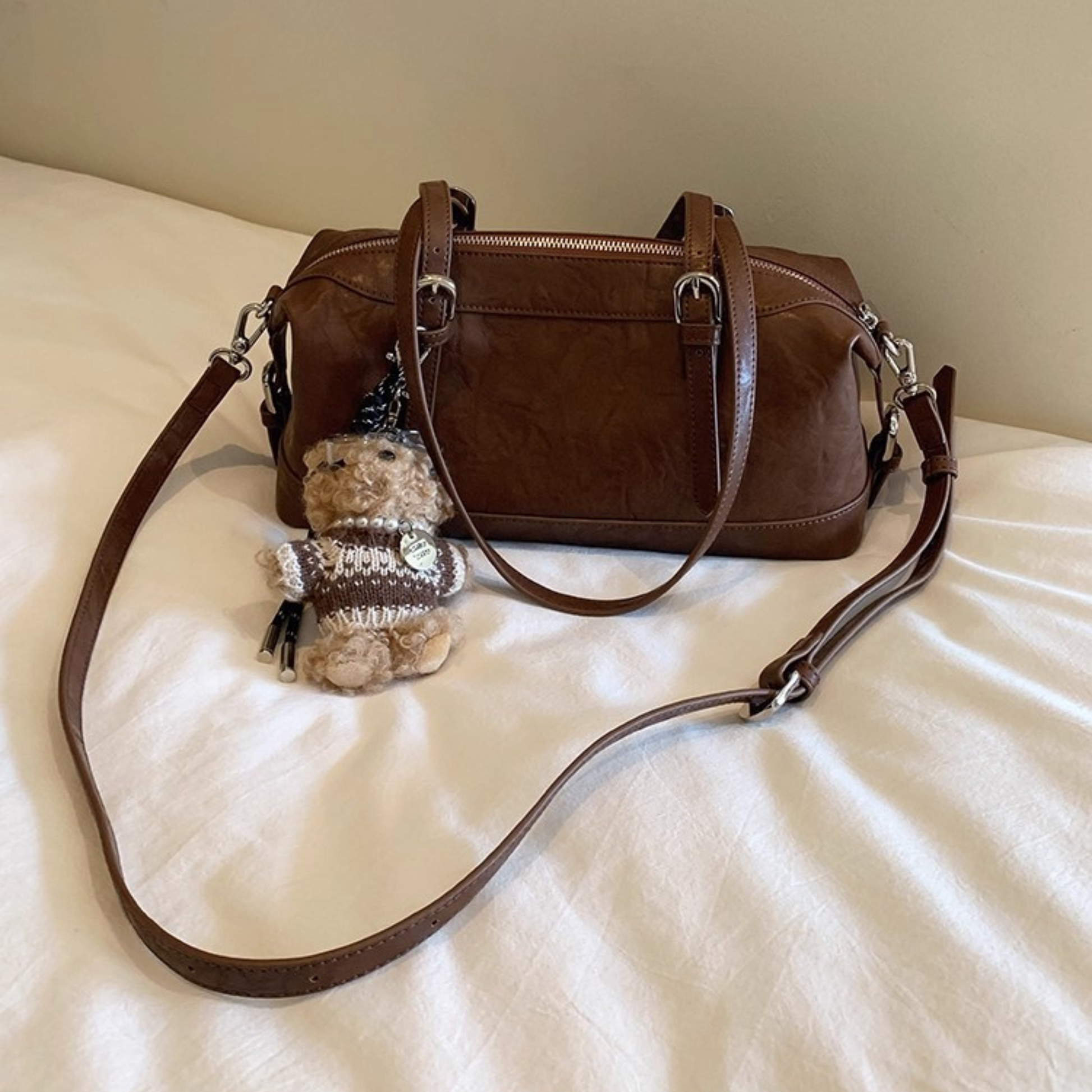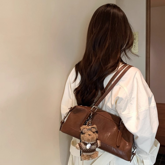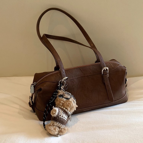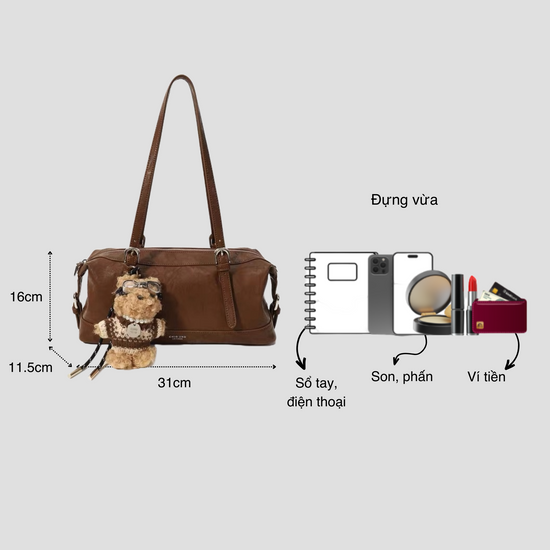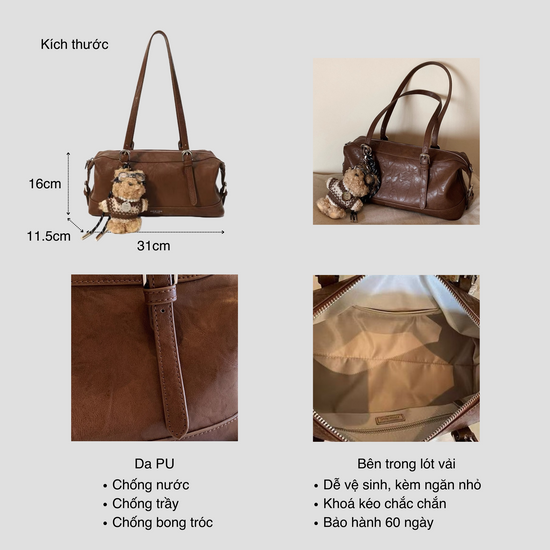 Chiếc túi xách kiểu dáng hộp nhún hai bên, phối kèm charm gấu mà các nàng không nên bỏ qua. Quai đeo có thể sử dụng theo ba kiểu: đeo vai, cầm tay hoặc đeo chéo tuỳ ý. Không gian túi rộng rãi, đủ để chứa nhiều đồ dùng cần thiết hàng ngày như sổ tay, điện thoại, bóp ví, mắt kính, đồ trang điểm...