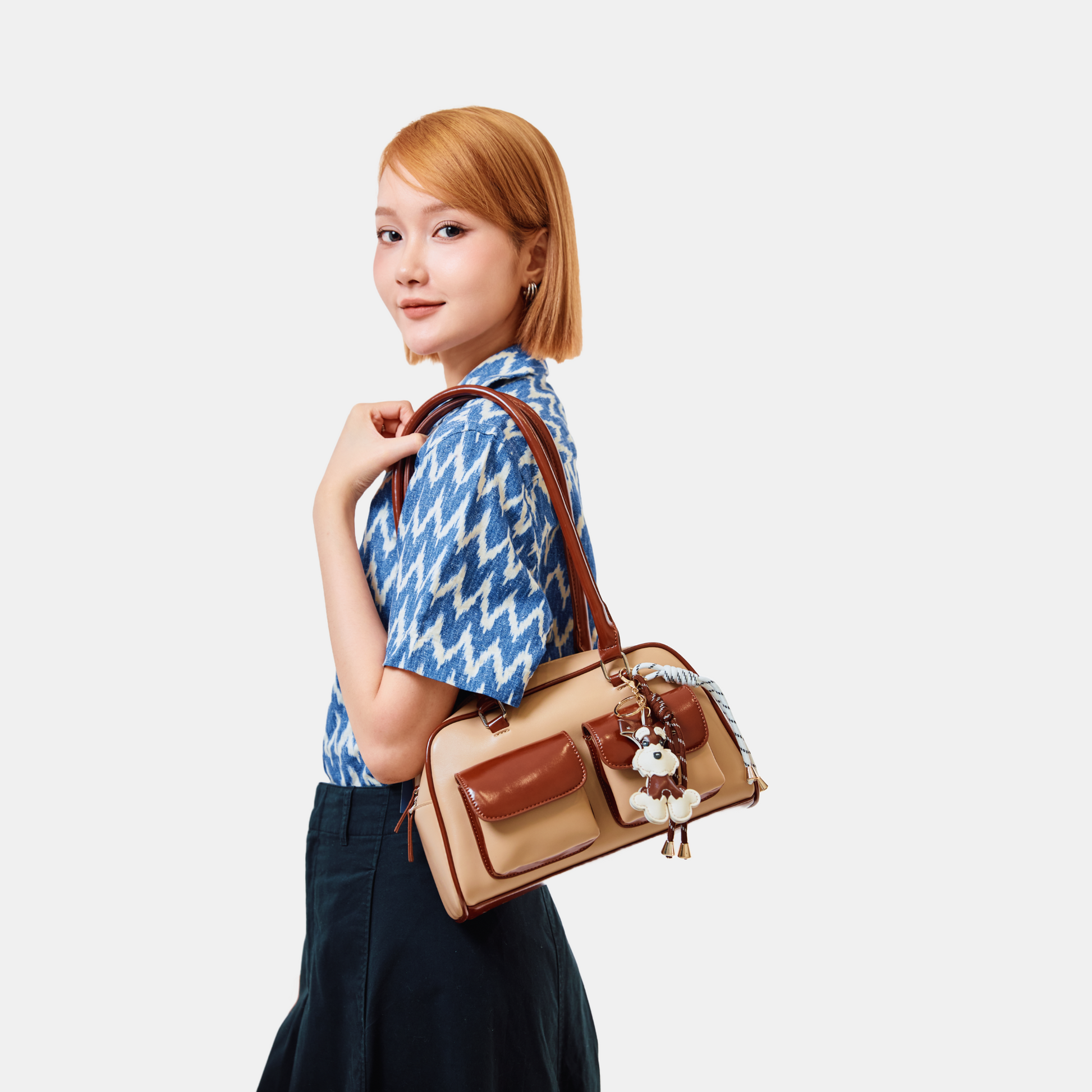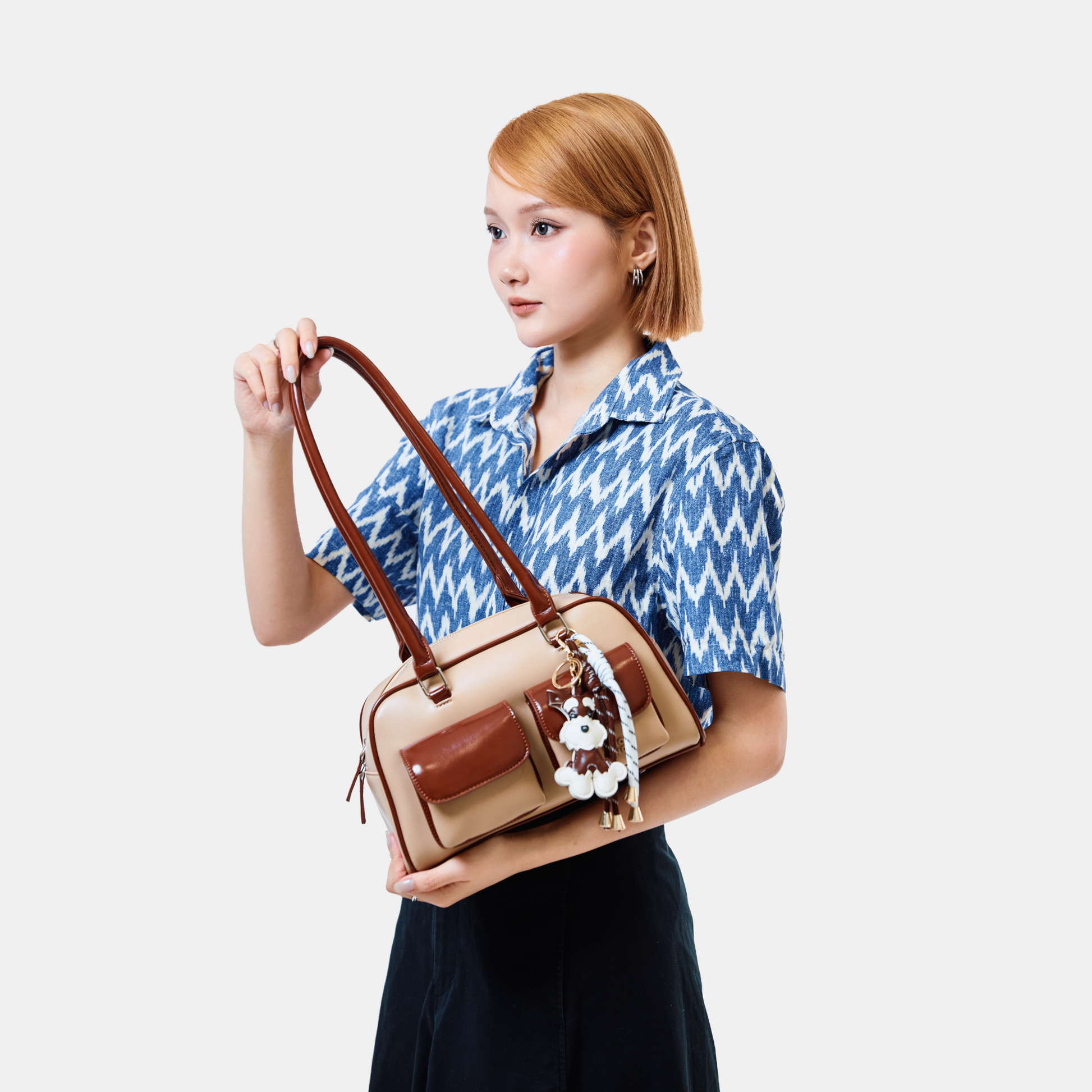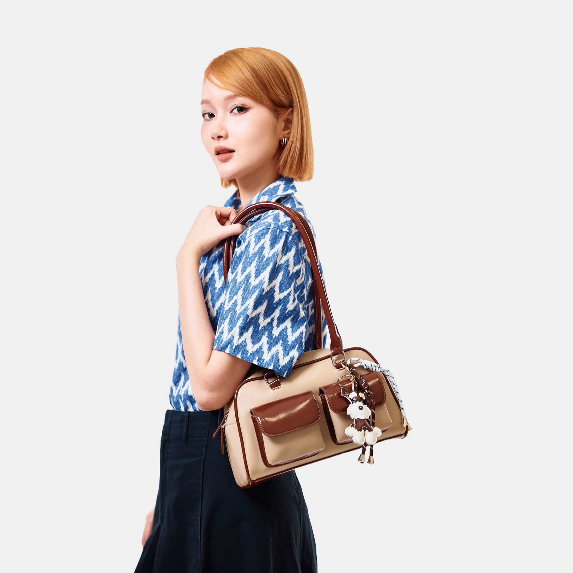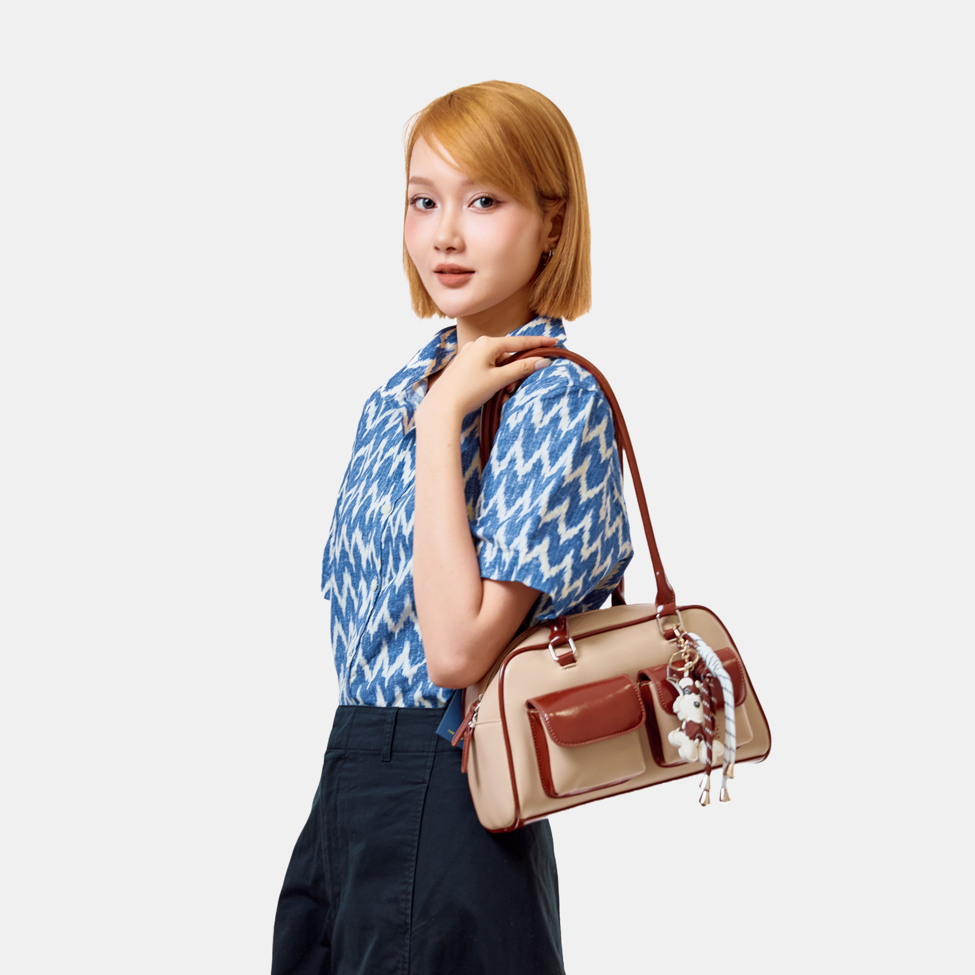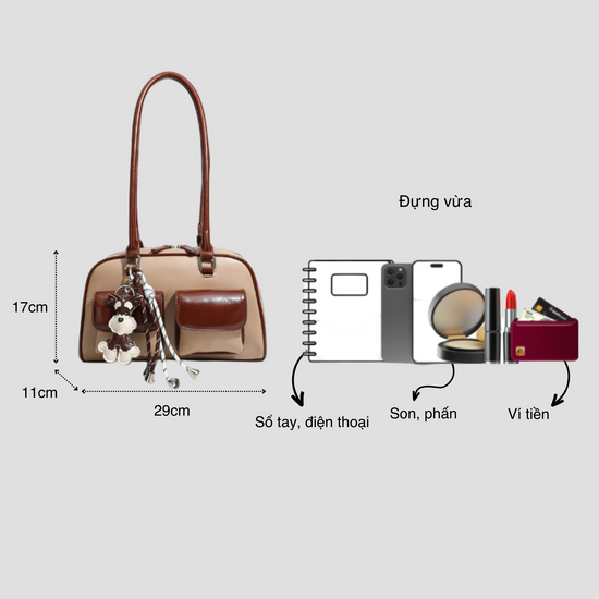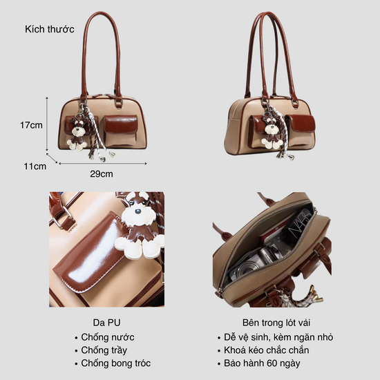 Chiếc túi xách kiểu dáng hộp trendy mà các nàng không nên bỏ qua, túi phối hai ngăn nhỏ nắp da bên ngoài và kèm thêm charm xinh. Có thể tùy ý sử dụng theo hai cách: đeo vai hoặc xách tay. Bên trong túi có không gian rộng rãi, đủ để chứa nhiều đồ dùng cần thiết hàng ngày như điện thoại, bóp ví, mắt kính, đồ trang điểm...