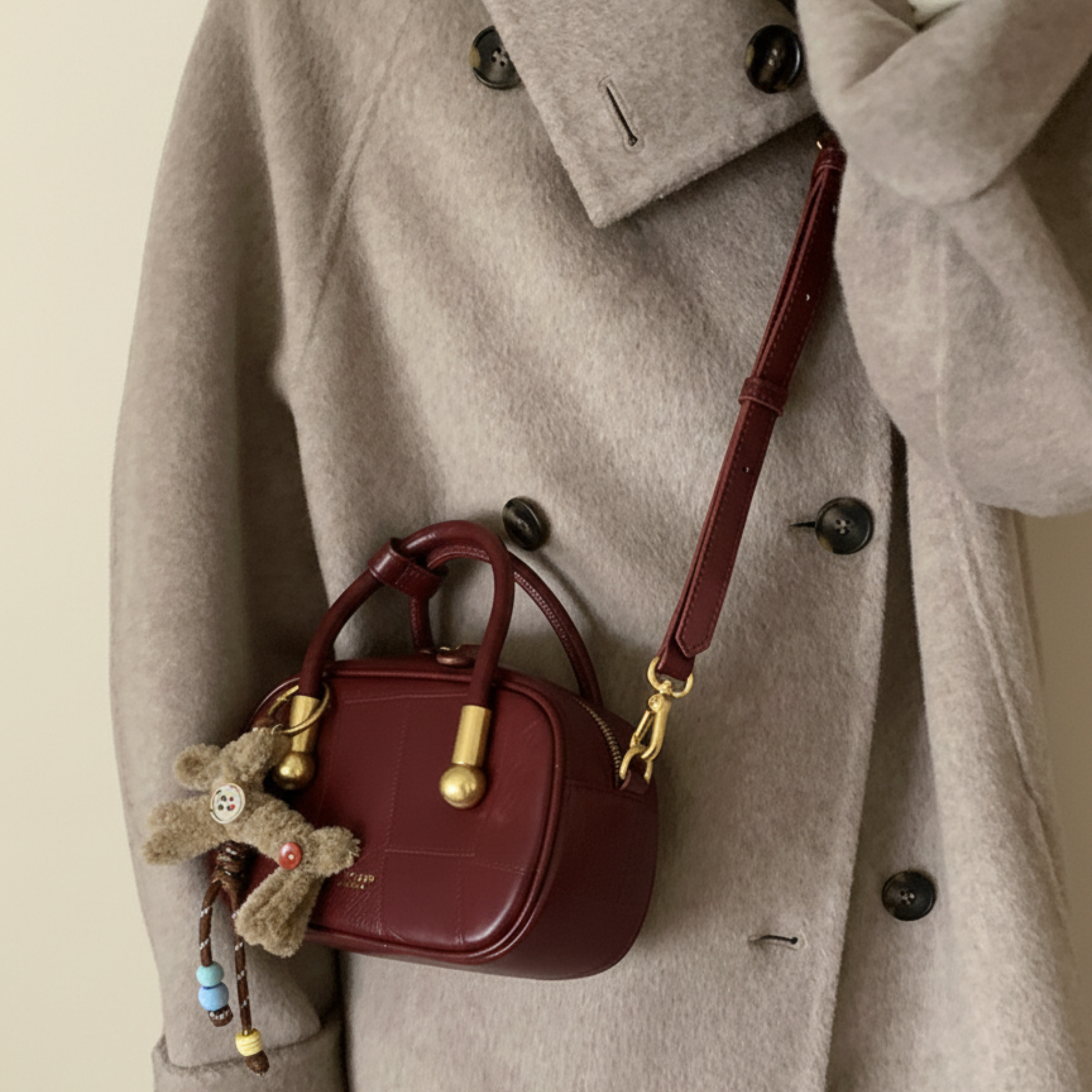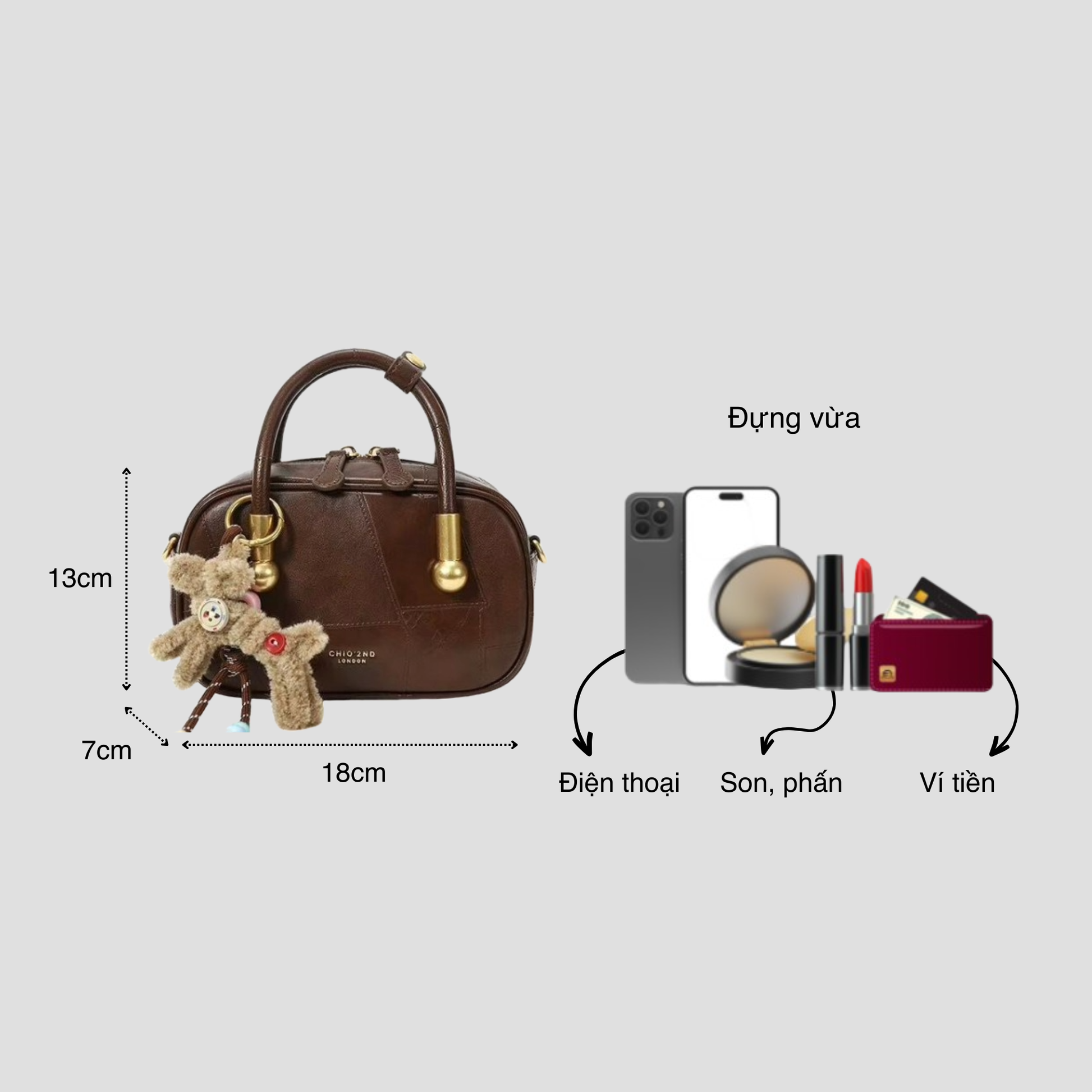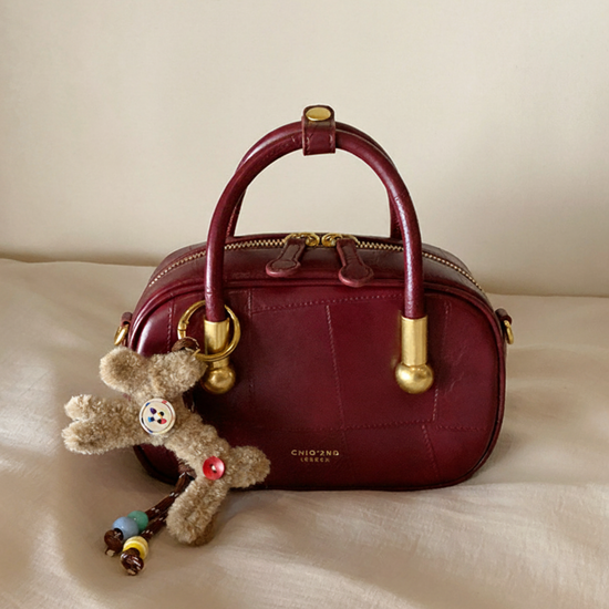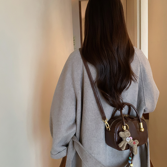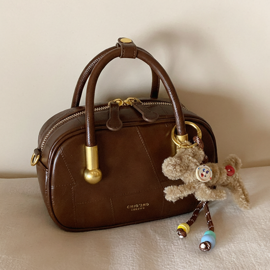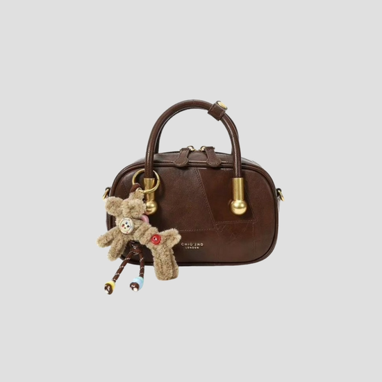 Chiếc túi xách da trơn kiểu hộp phối charm gấu xinh xắn, mang hơi hướng vintage. Điểm nổi bật của túi là dây đeo linh hoạt, bạn có thể sử dụng ba kiểu: cầm tay, đeo vai hoặc đeo chéo tuỳ thích.