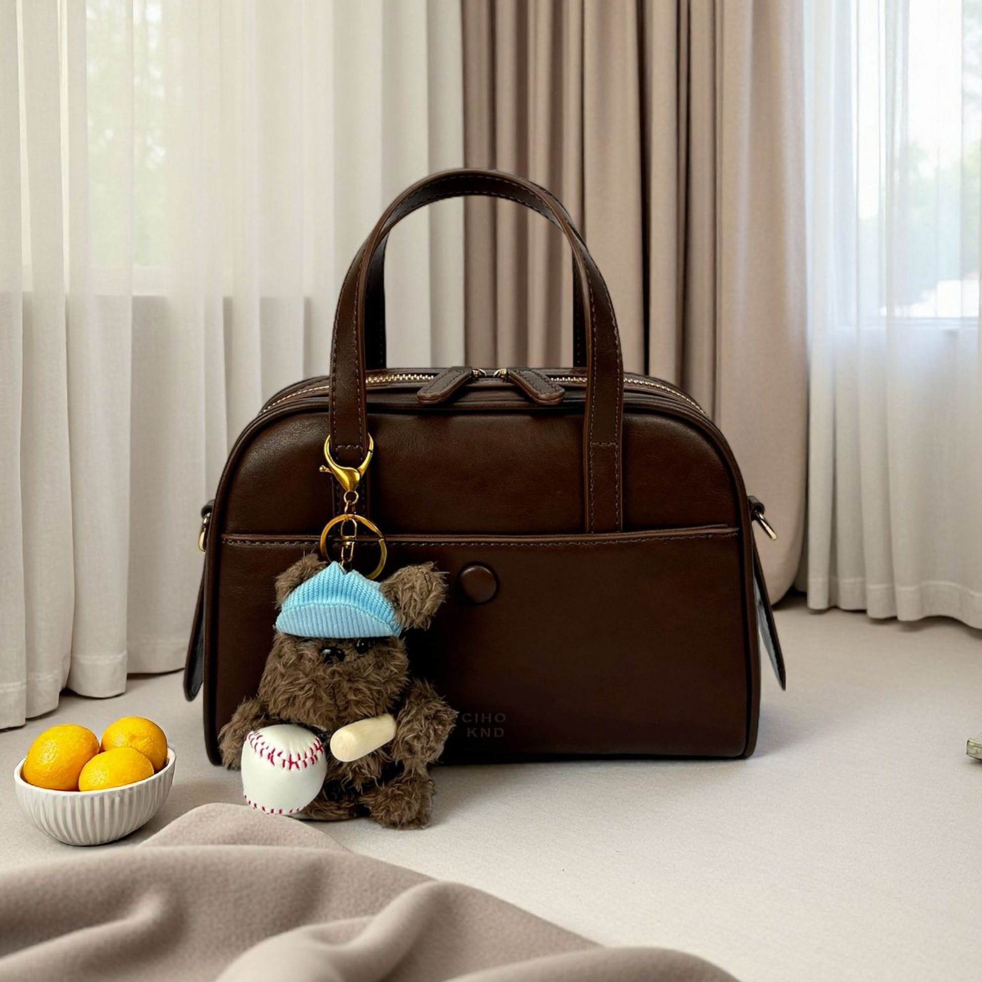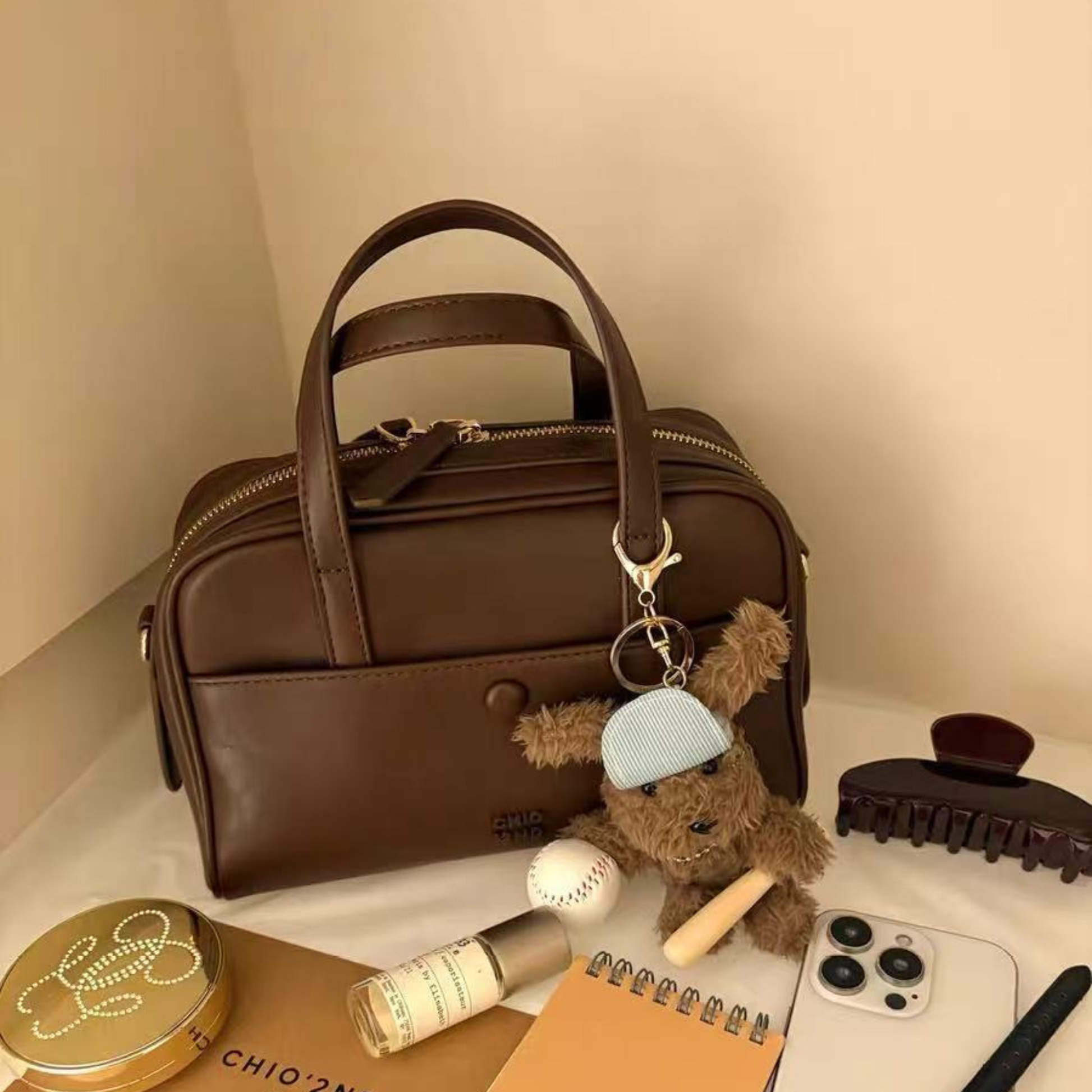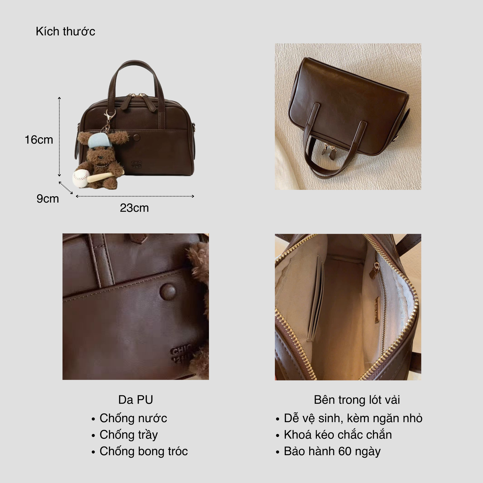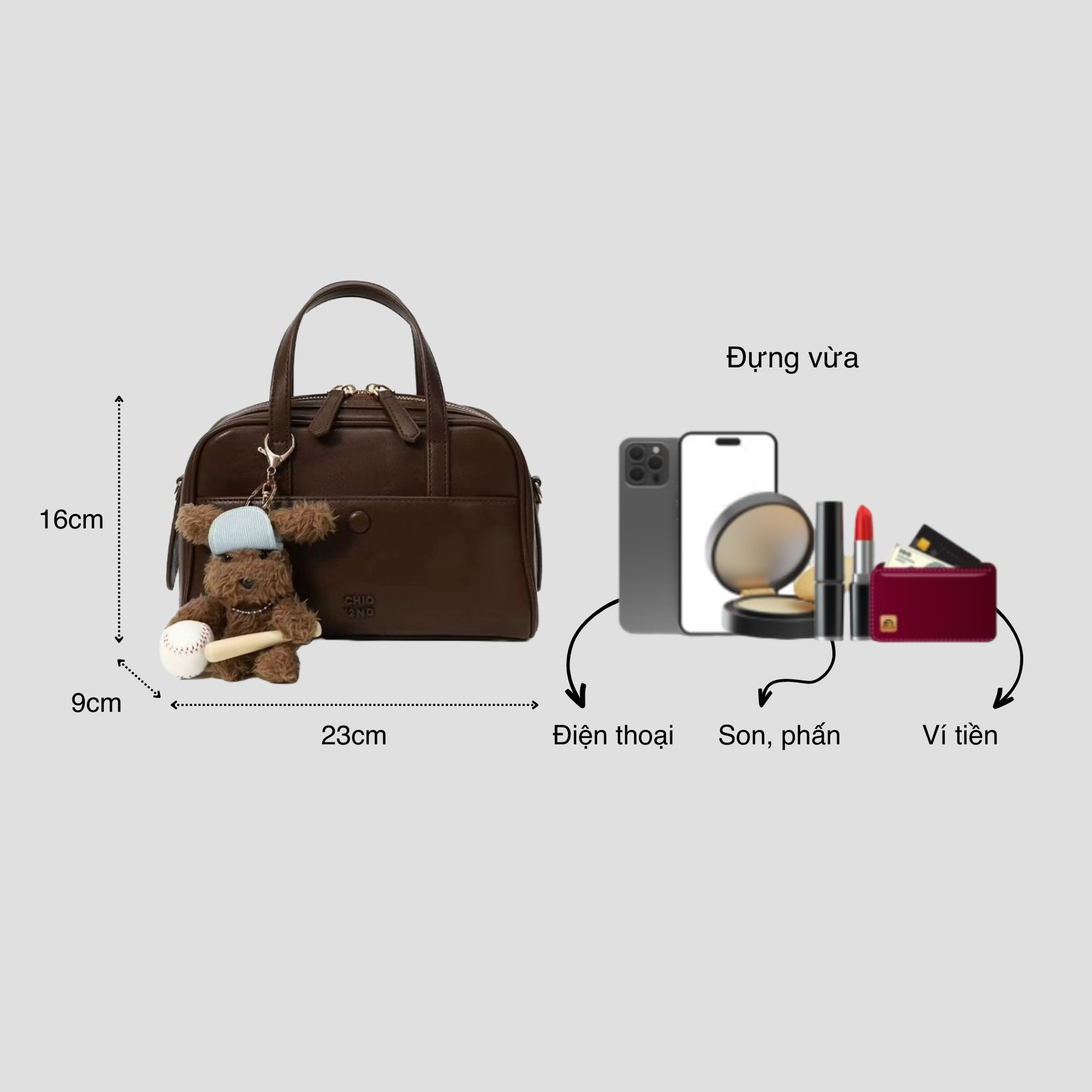 Chiếc túi xách kiểu dáng hộp trendy ngăn cúc bấm, phối kèm charm gấu xinh mà các nàng không nên bỏ qua. Có thể tùy ý sử dụng theo ba kiểu: cầm tay, đeo vai hoặc đeo chéo tuỳ ý. Bên trong túi đựng được các đồ dùng cần thiết hàng ngày như điện thoại, bóp ví, mắt kính, đồ trang điểm...