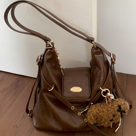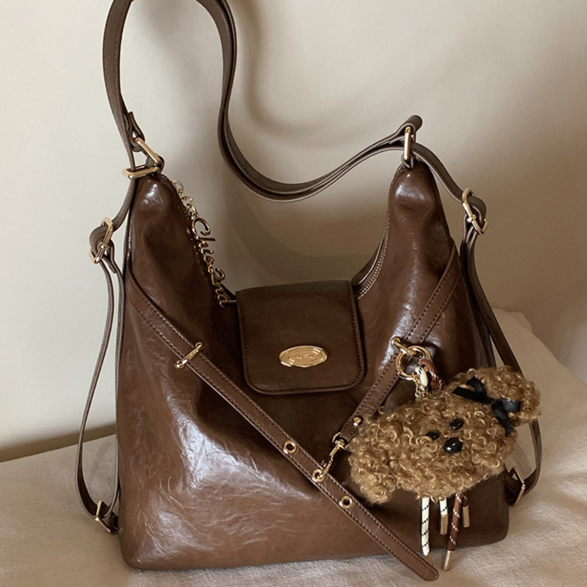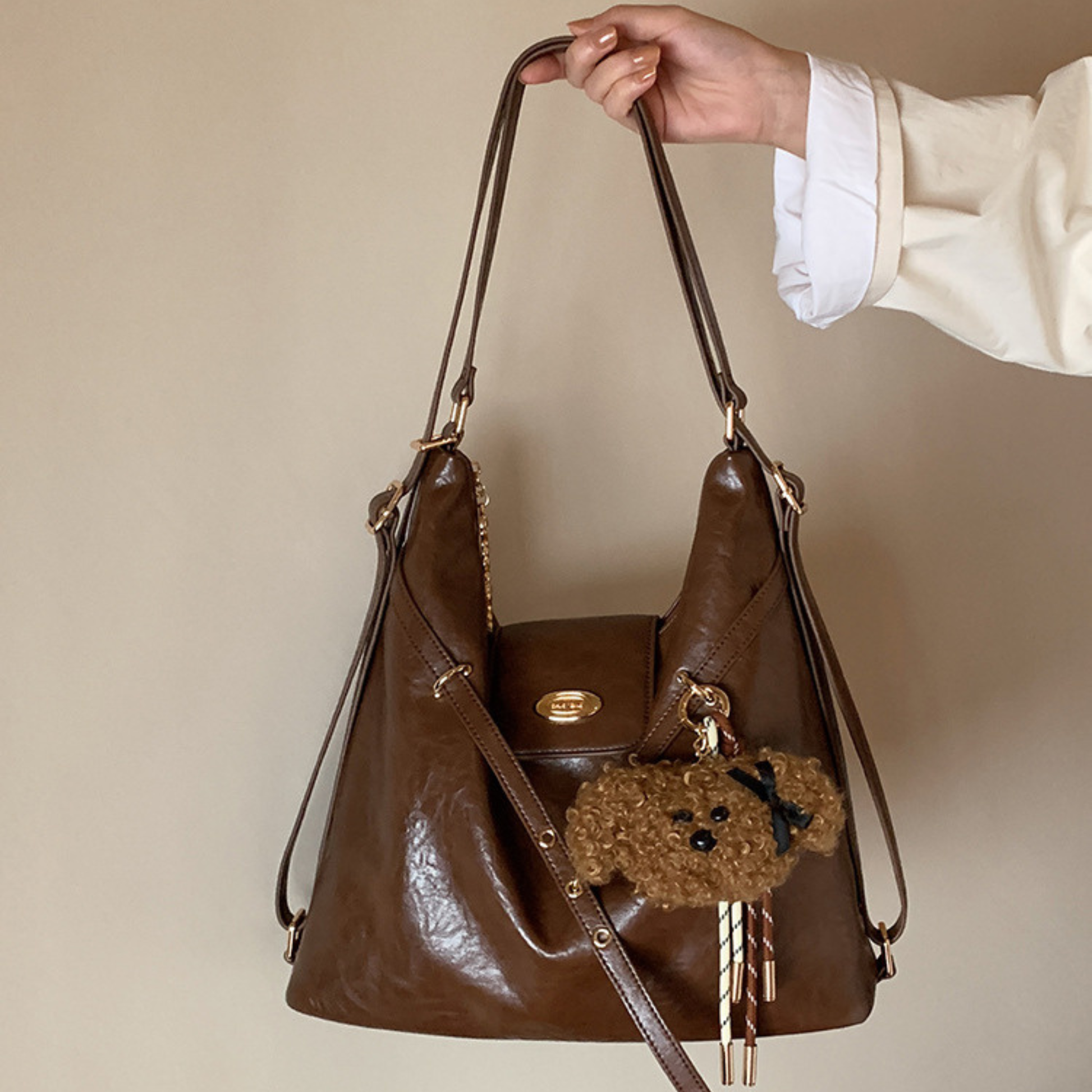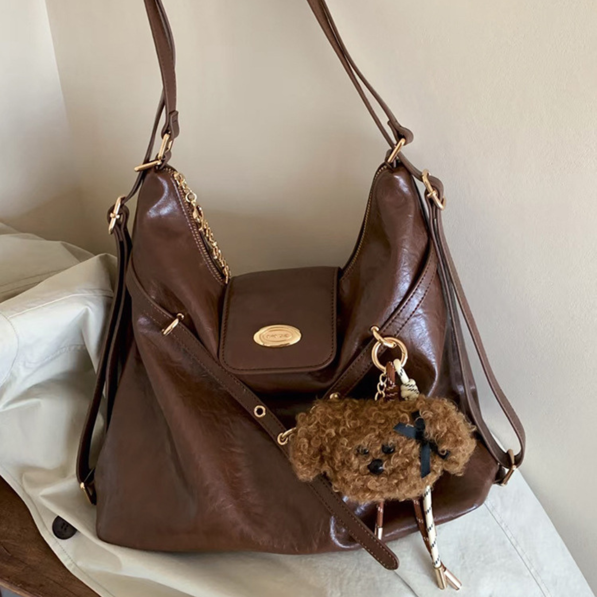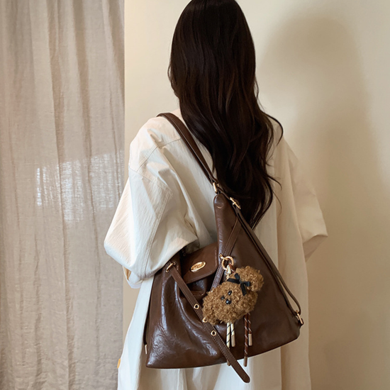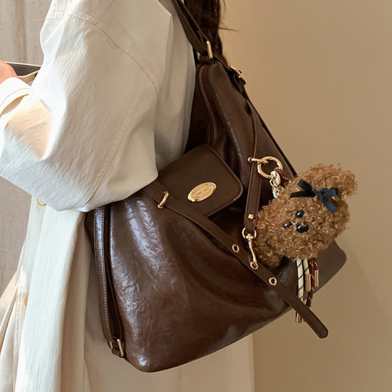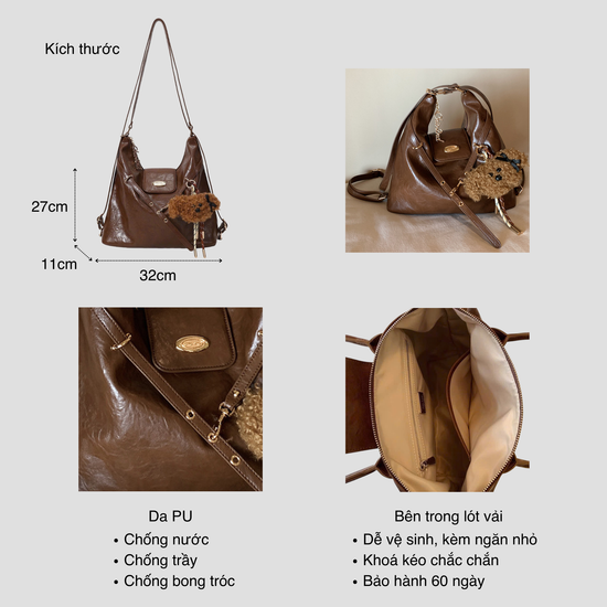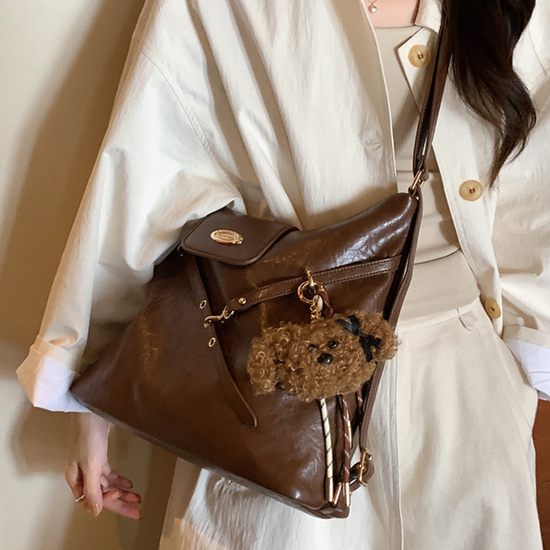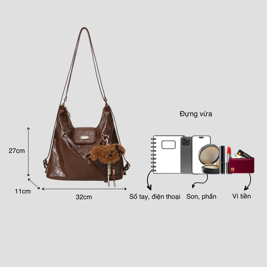 Chiếc túi xách da kiểu hobo nắp gập phối charm gấu đơn giản nhưng cũng không kém phần năng động. Điểm nổi bật của túi là dây đeo linh hoạt, bạn có thể sử dụng ba kiểu: cầm tay, đeo vai hoặc đeo chéo tuỳ thích.