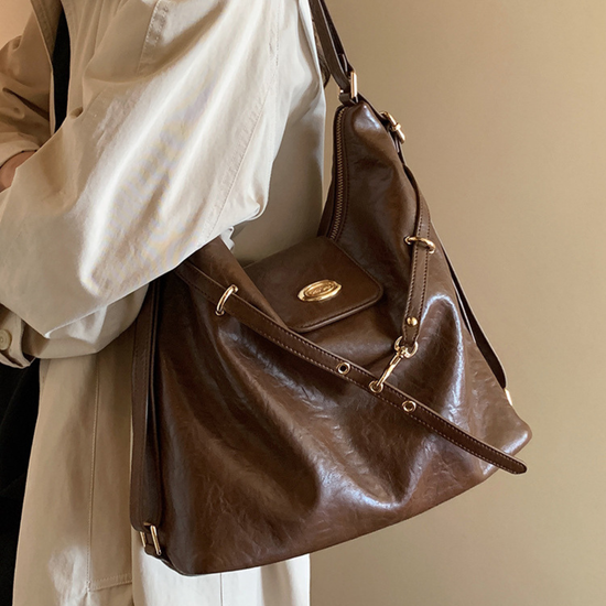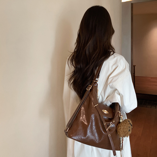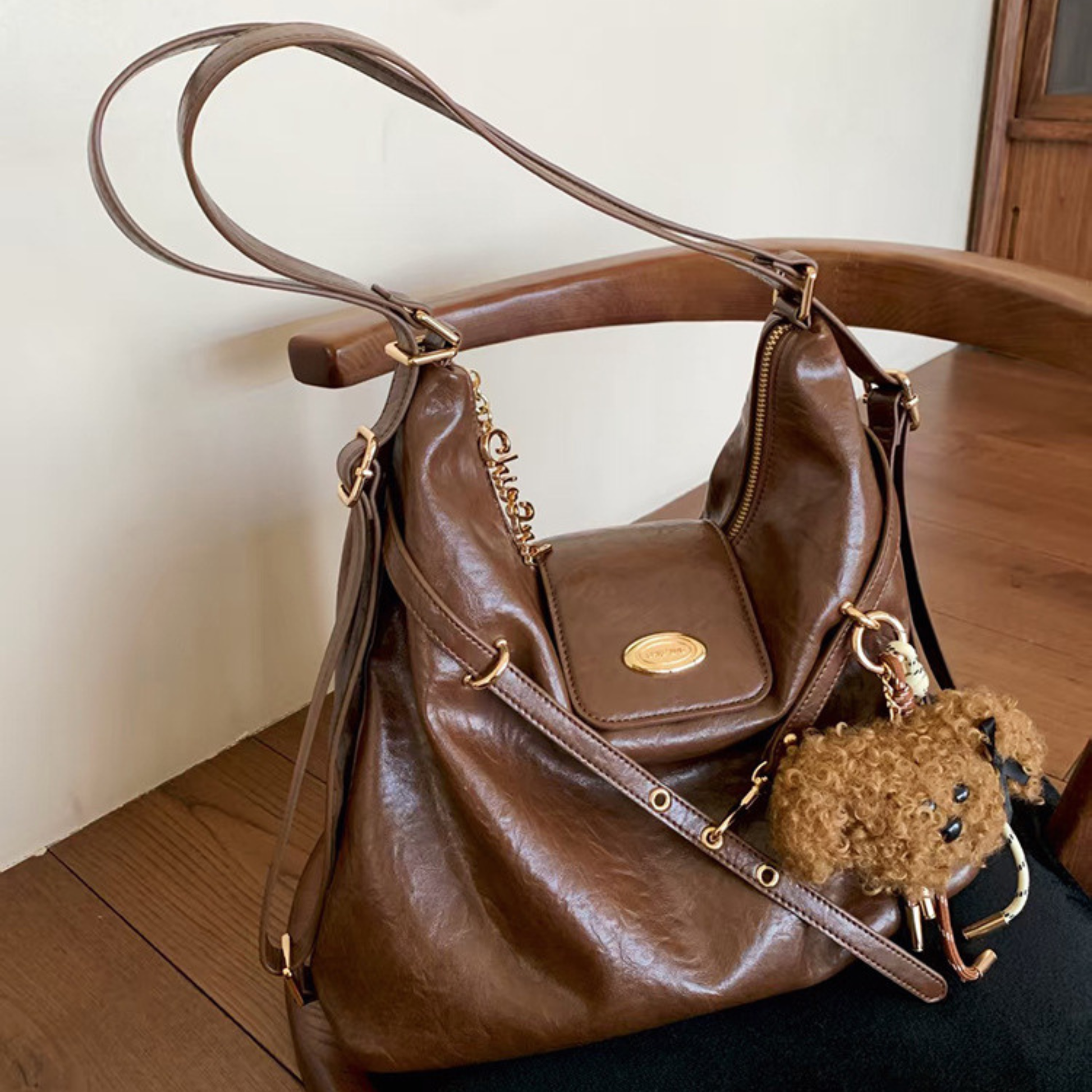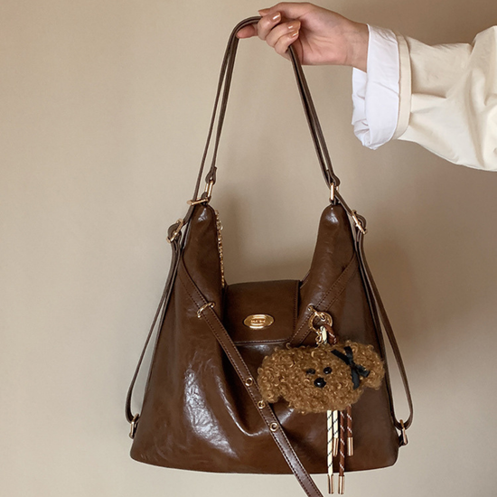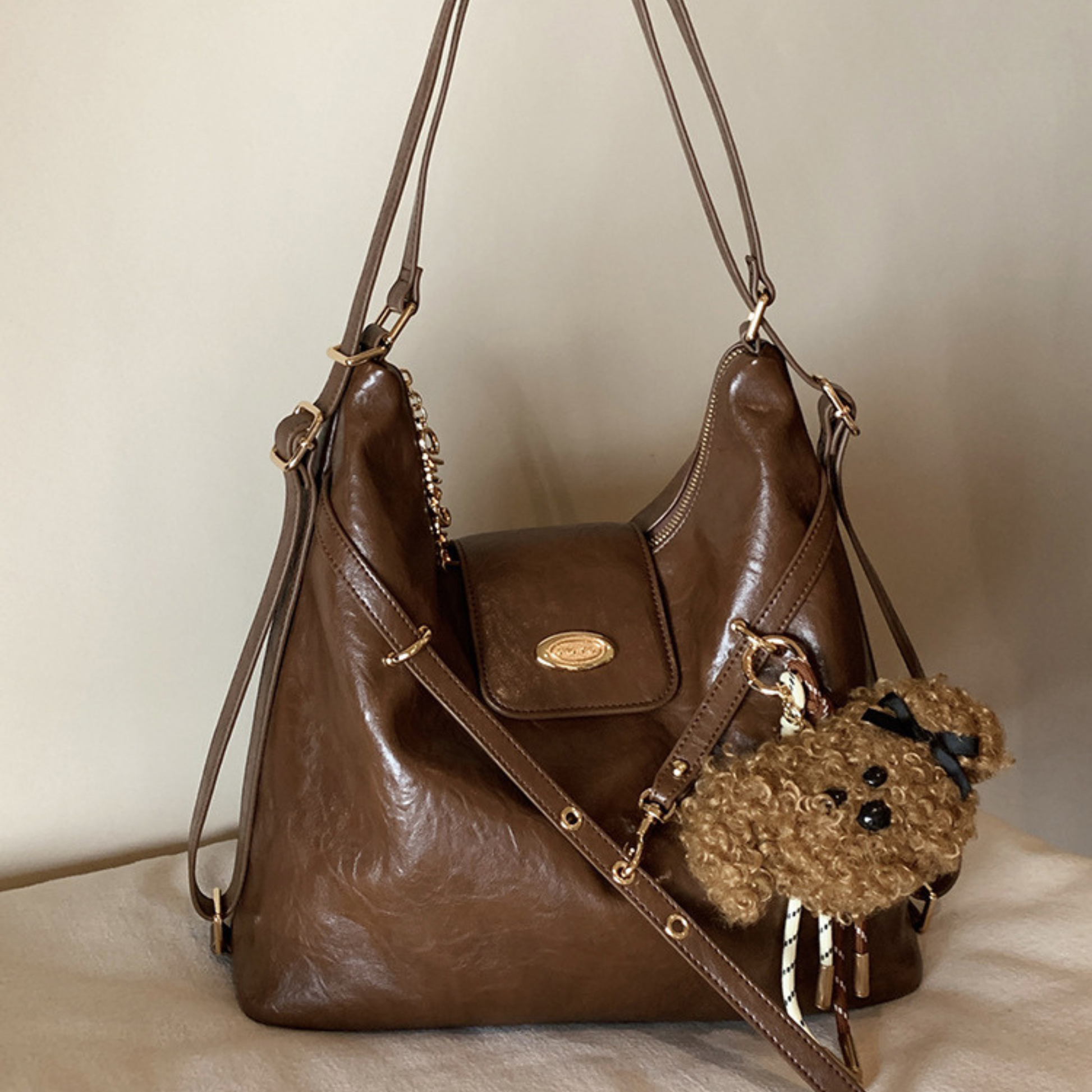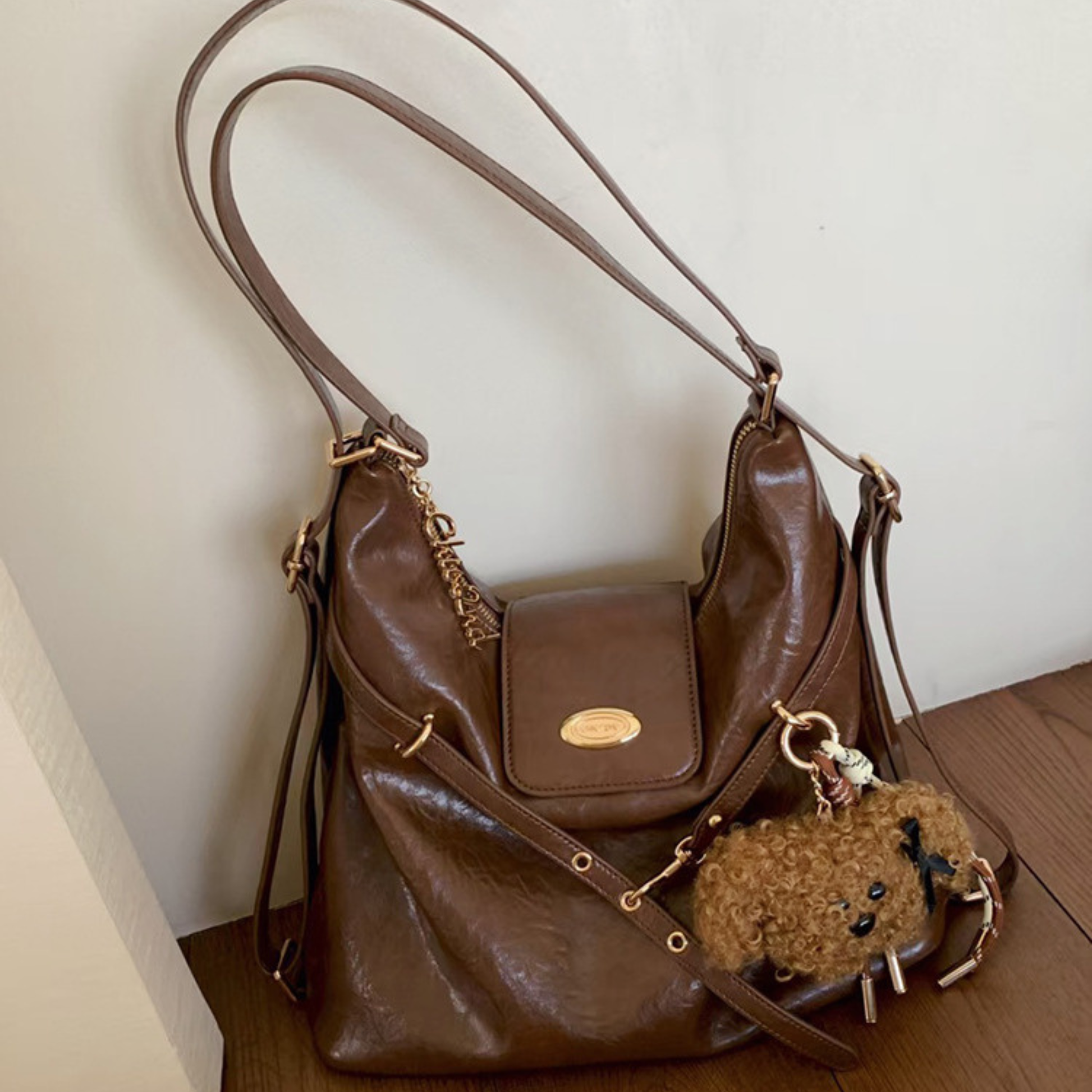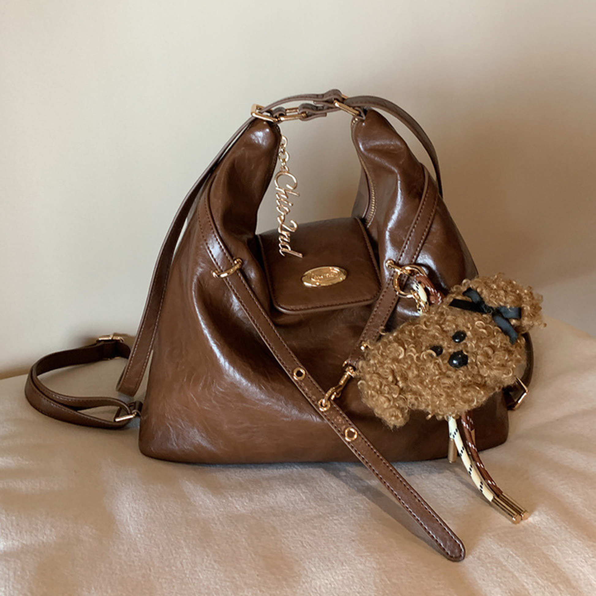Chiếc túi xách da kiểu hobo nắp gập phối charm gấu đơn giản nhưng cũng không kém phần năng động. Điểm nổi bật của túi là dây đeo linh hoạt, bạn có thể sử dụng ba kiểu: cầm tay, đeo vai hoặc đeo chéo tuỳ thích.