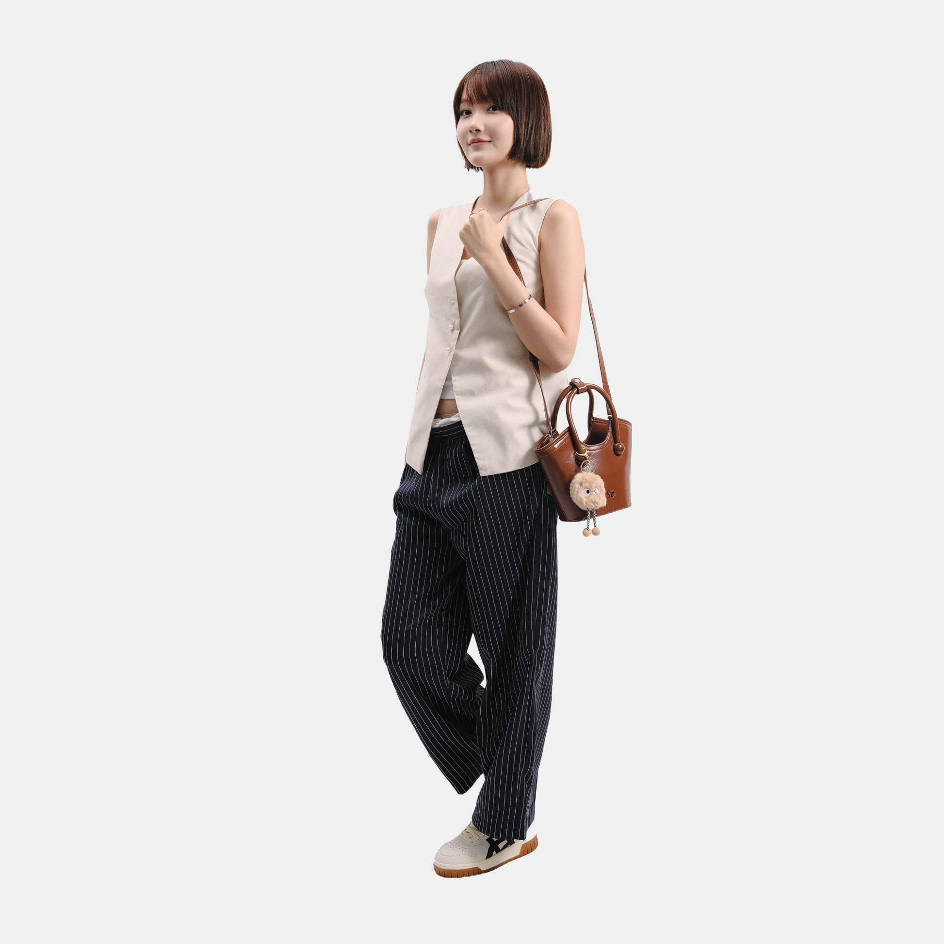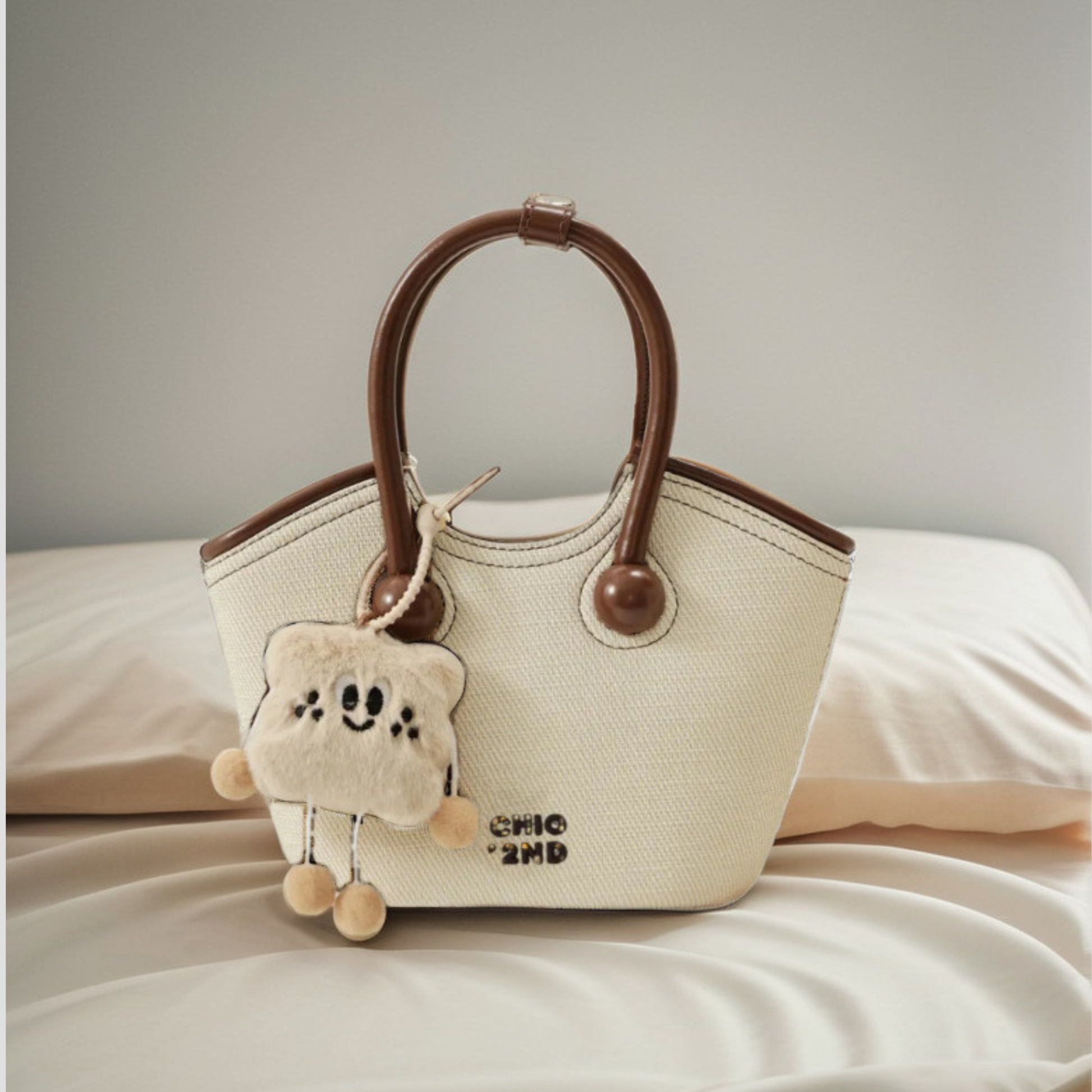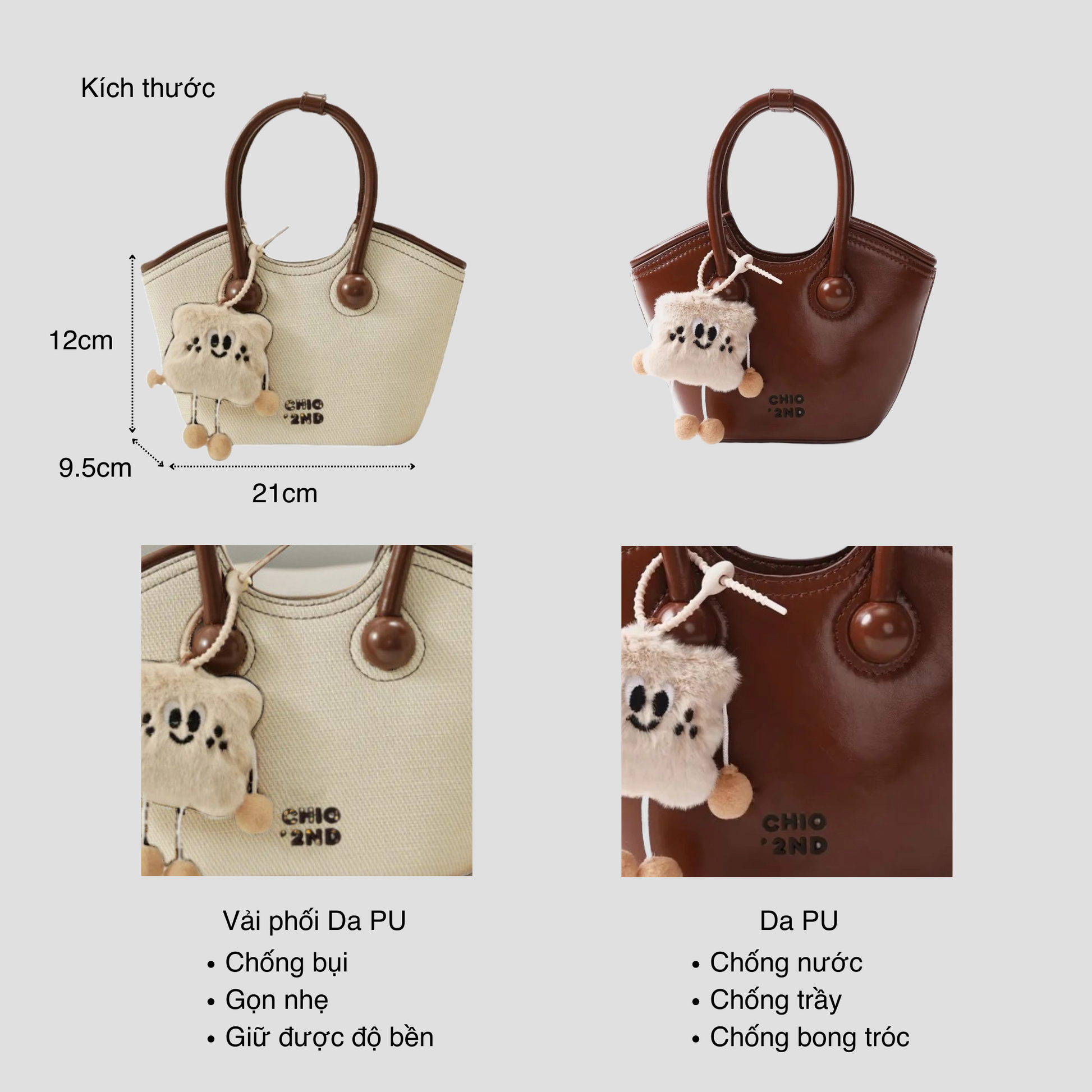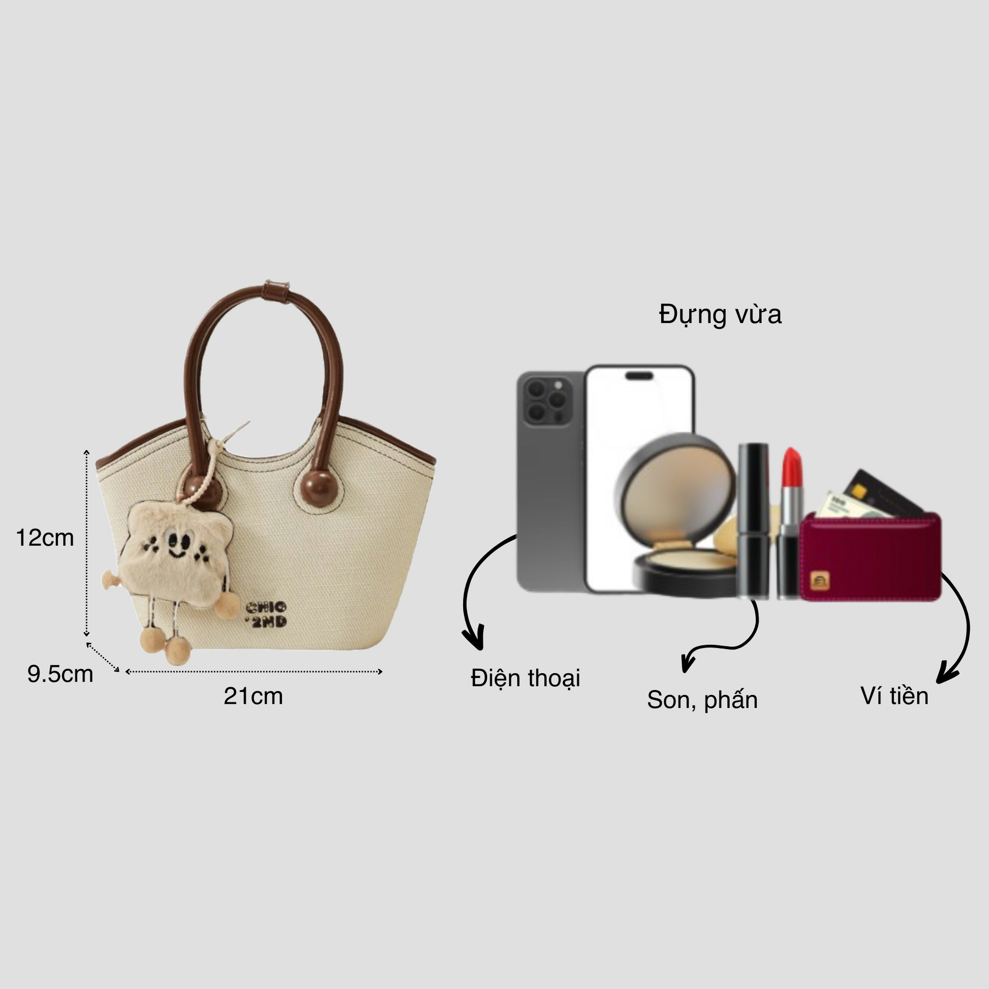 Chiếc túi xách có thiết kế kiểu xô đứng form kèm charm xinh xắn. Điểm nổi bật của túi là dây đeo linh hoạt, bạn có thể sử dụng theo ba kiểu: cầm tay, đeo vai hoặc đeo chéo tuỳ thích.
