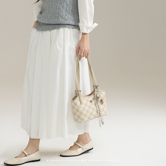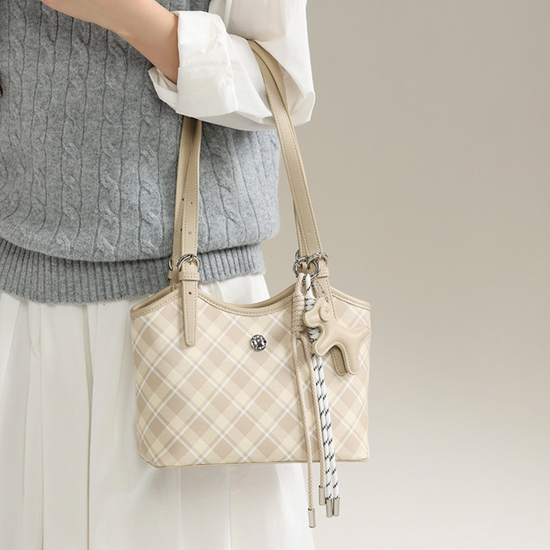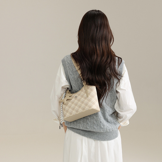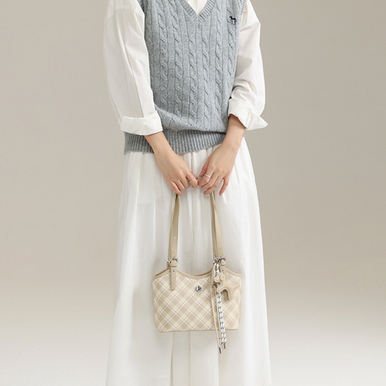 Chiếc túi xách da kiểu xô đứng form với hoạ tiết sọc caro lạ mắt, kèm thêm charm đơn giản. Điểm nổi bật của túi là dây đeo linh hoạt, bạn có thể sử dụng theo hai kiểu: cầm tay hoặc đeo vai tuỳ thích.