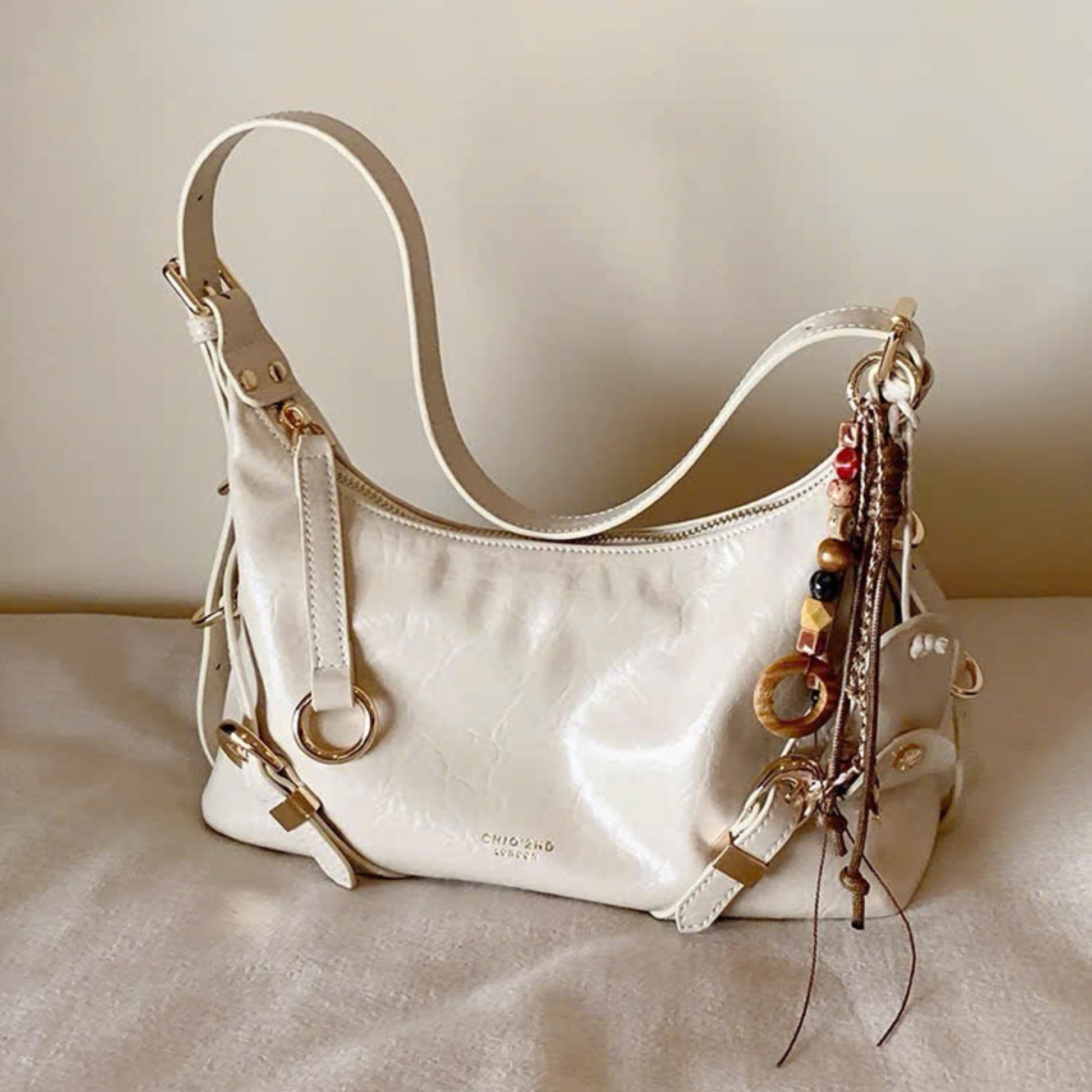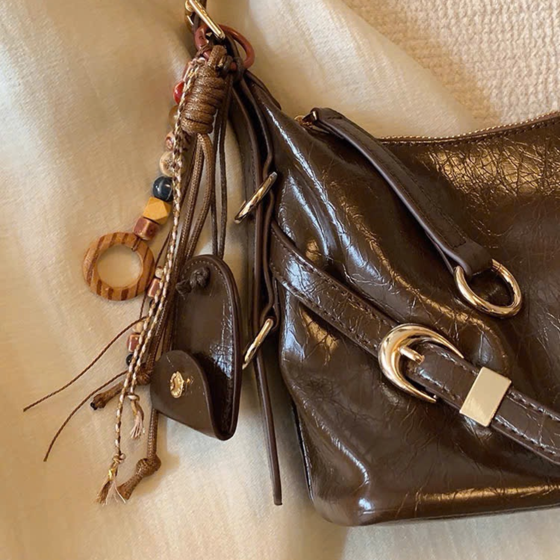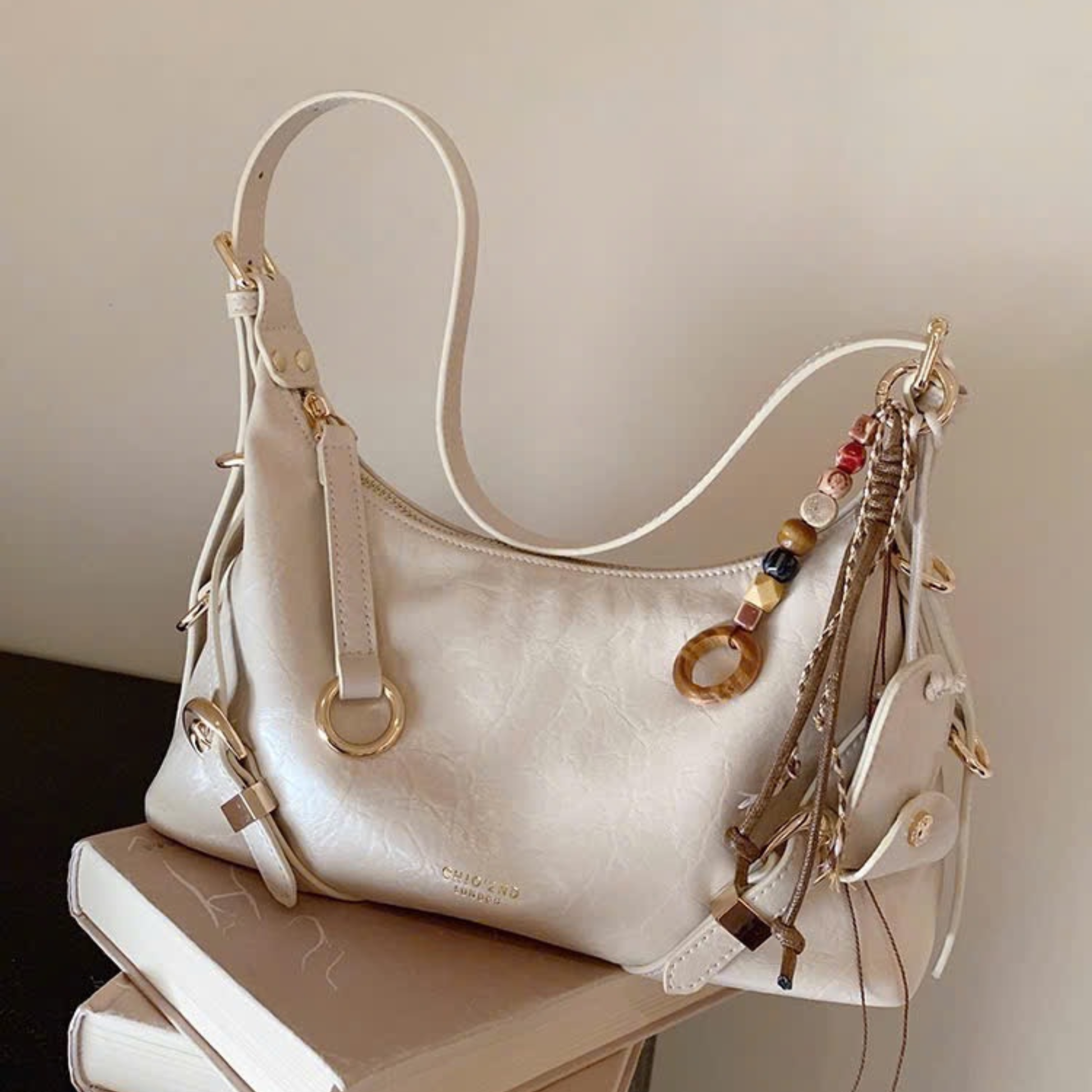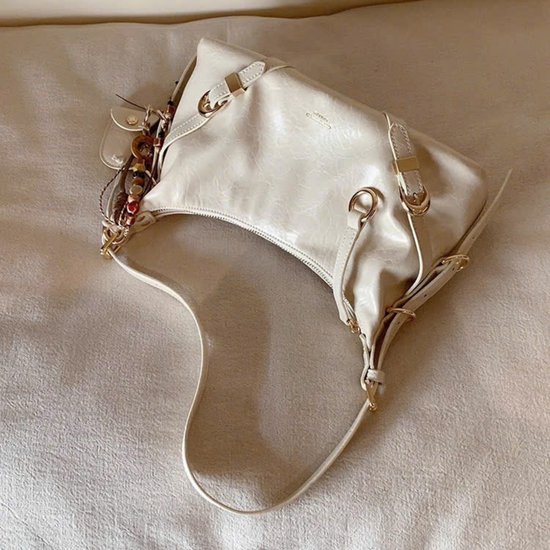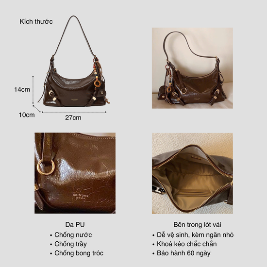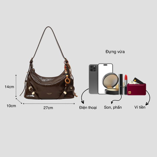 Chiếc túi xách da nhám kiểu hobo phối charm hạt đơn giản nhưng cũng không kém phần vintage. Thiết kế lạ mắt với phần đai xéo hai bên ở ngoài mặt túi. Quai đeo linh hoạt, bạn có thể sử dụng theo hai kiểu: cầm tay hoặc đeo vai tuỳ thích.