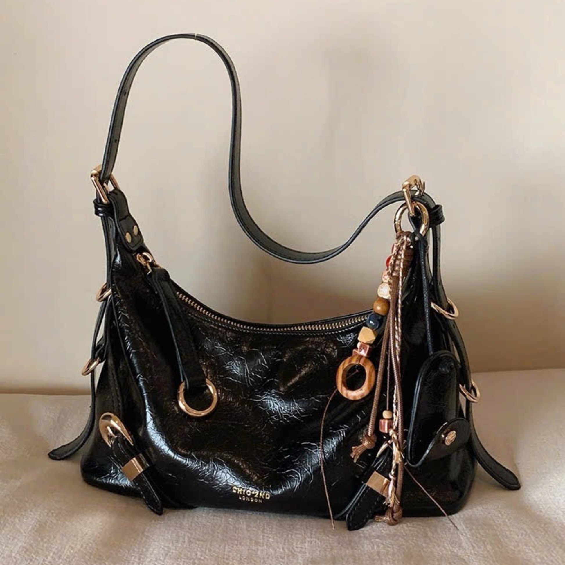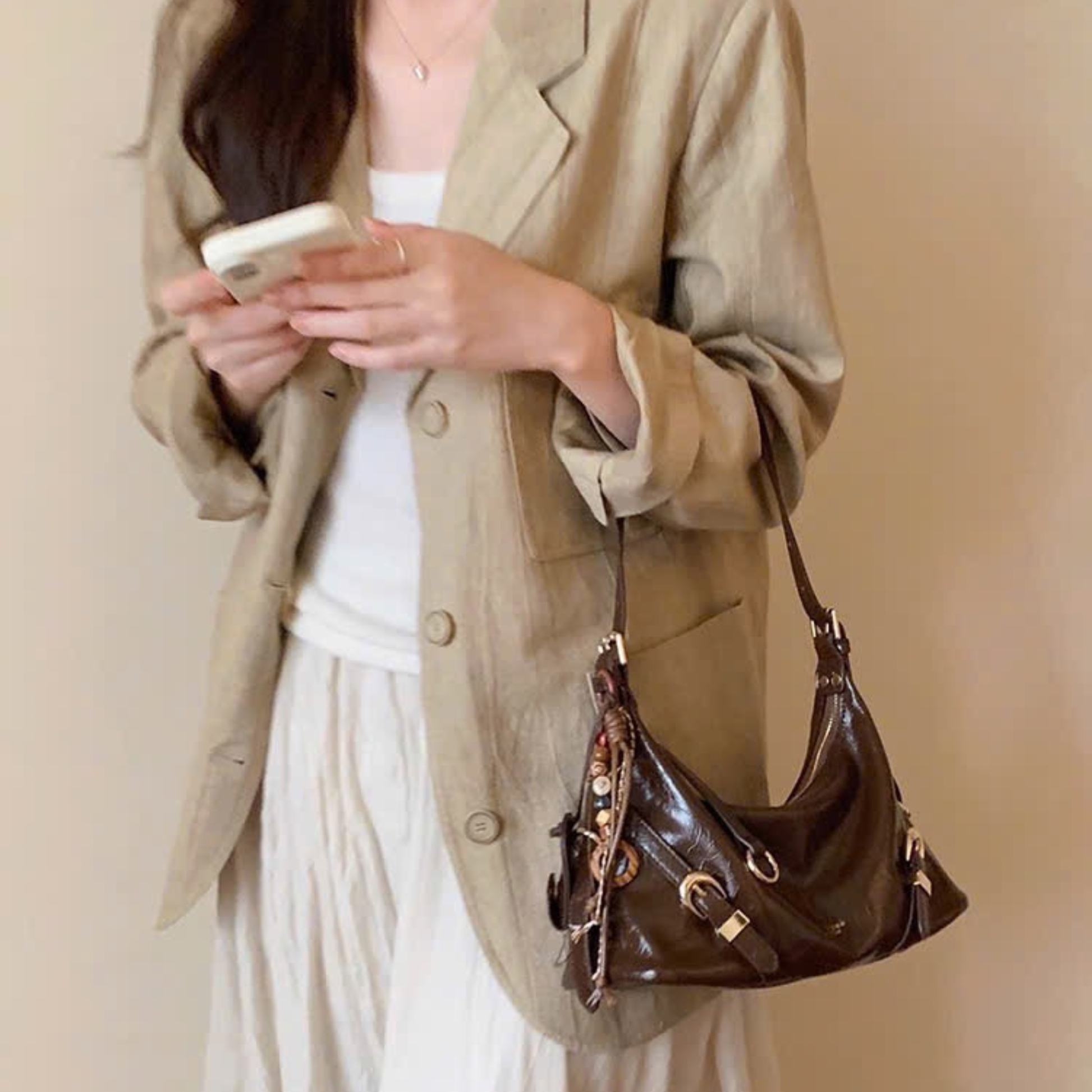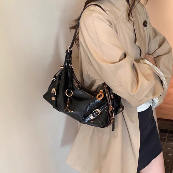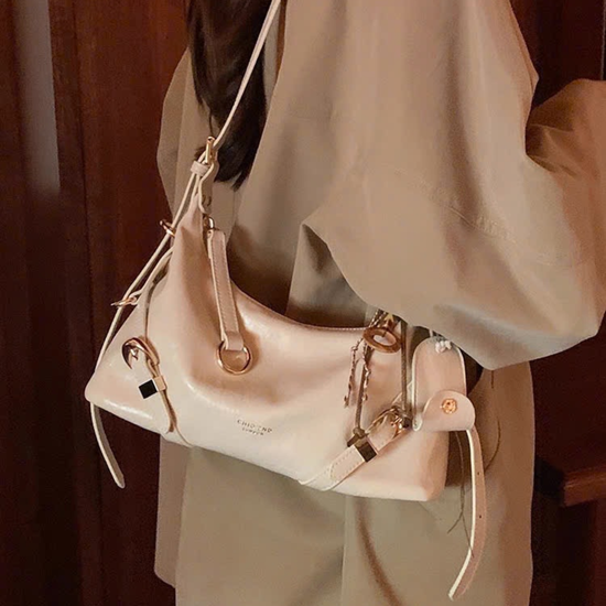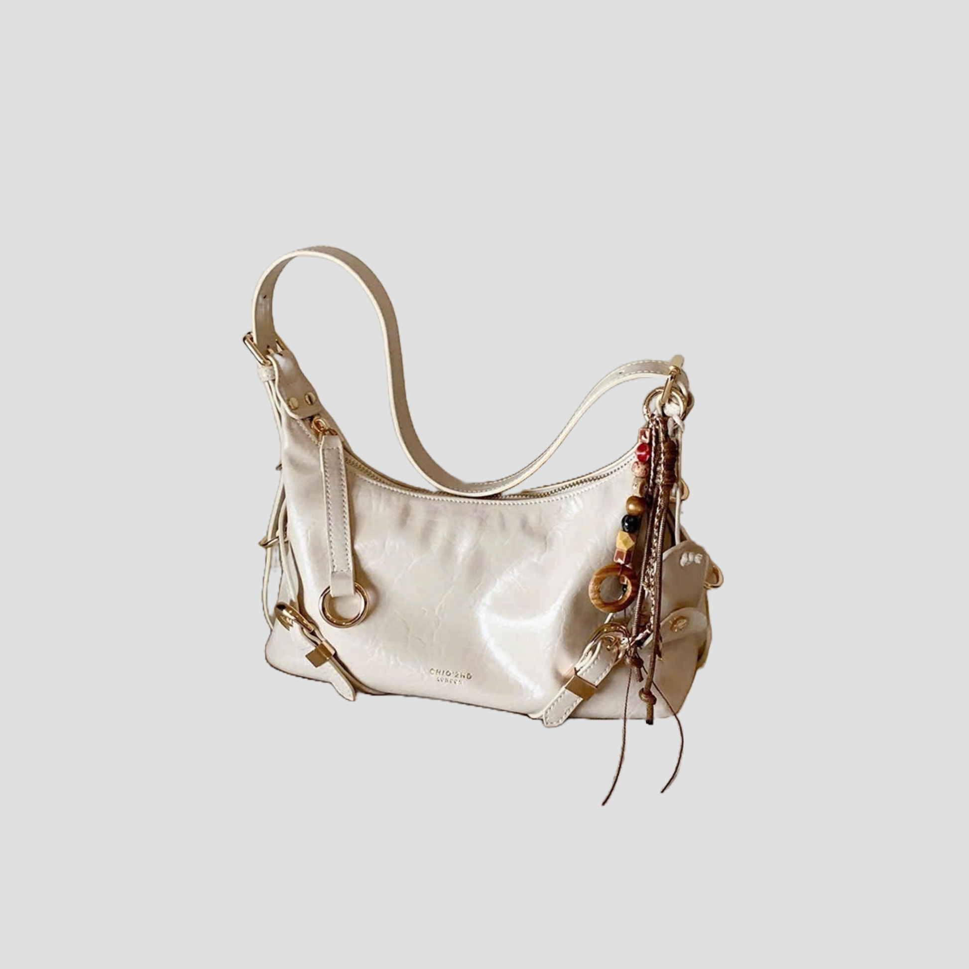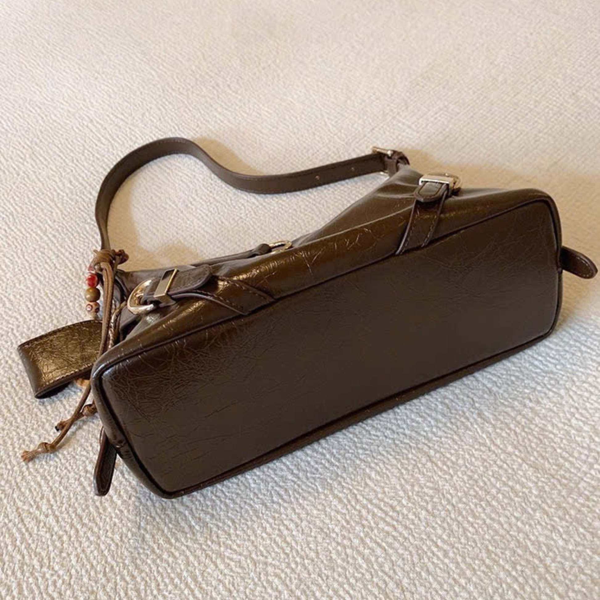 Chiếc túi xách da nhám kiểu hobo phối charm hạt đơn giản nhưng cũng không kém phần vintage. Thiết kế lạ mắt với phần đai xéo hai bên ở ngoài mặt túi. Quai đeo linh hoạt, bạn có thể sử dụng theo hai kiểu: cầm tay hoặc đeo vai tuỳ thích.