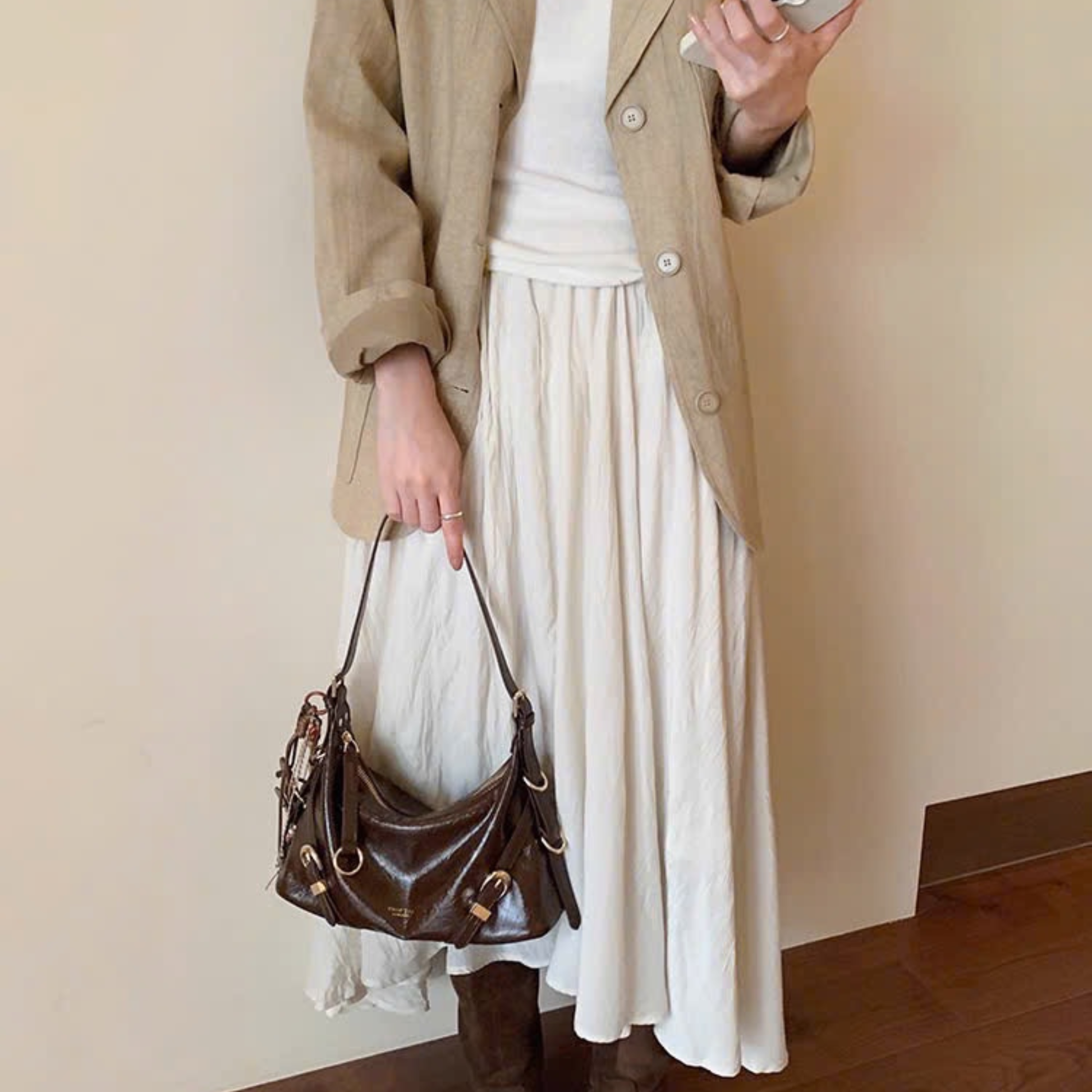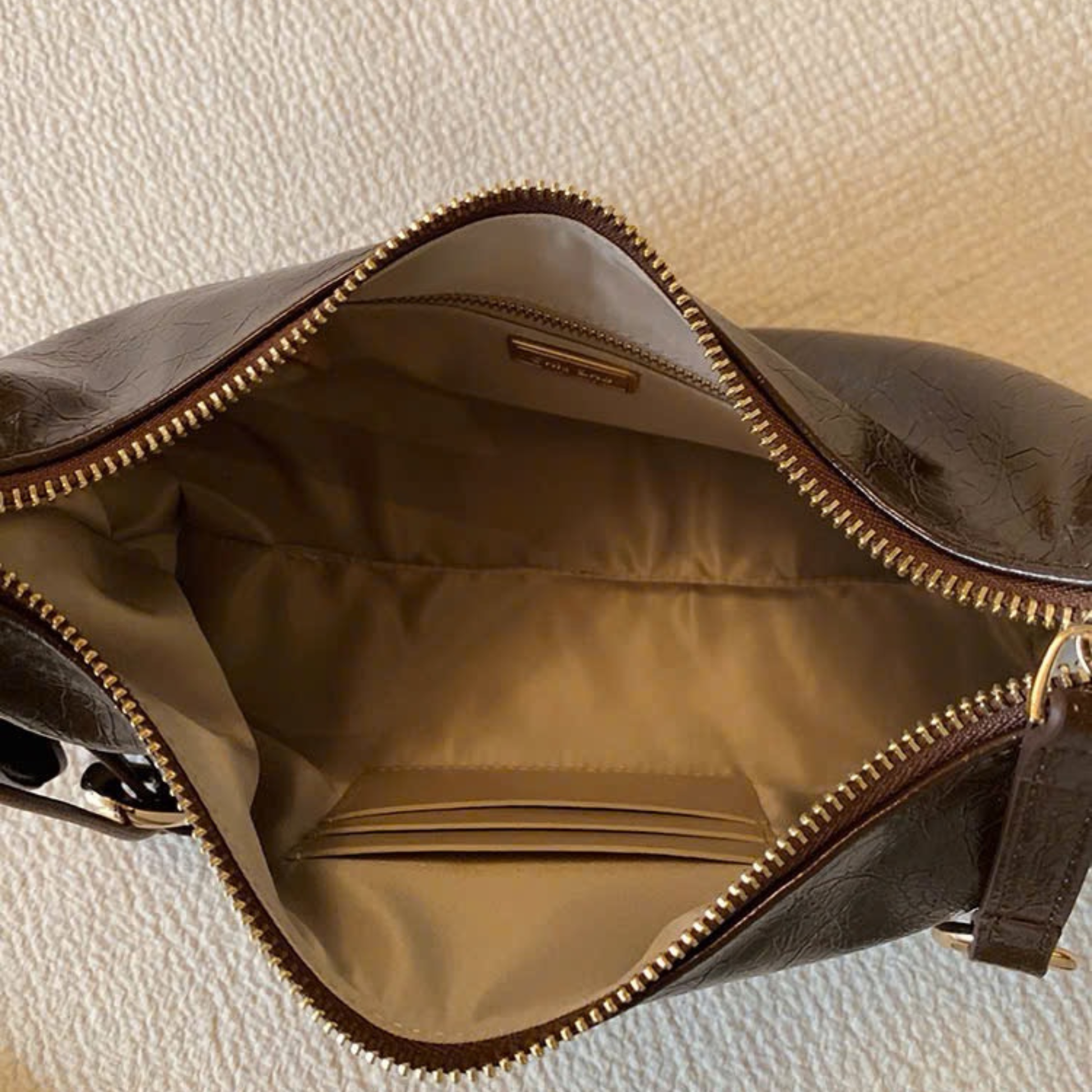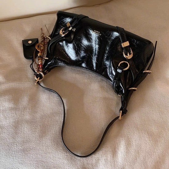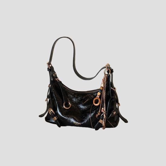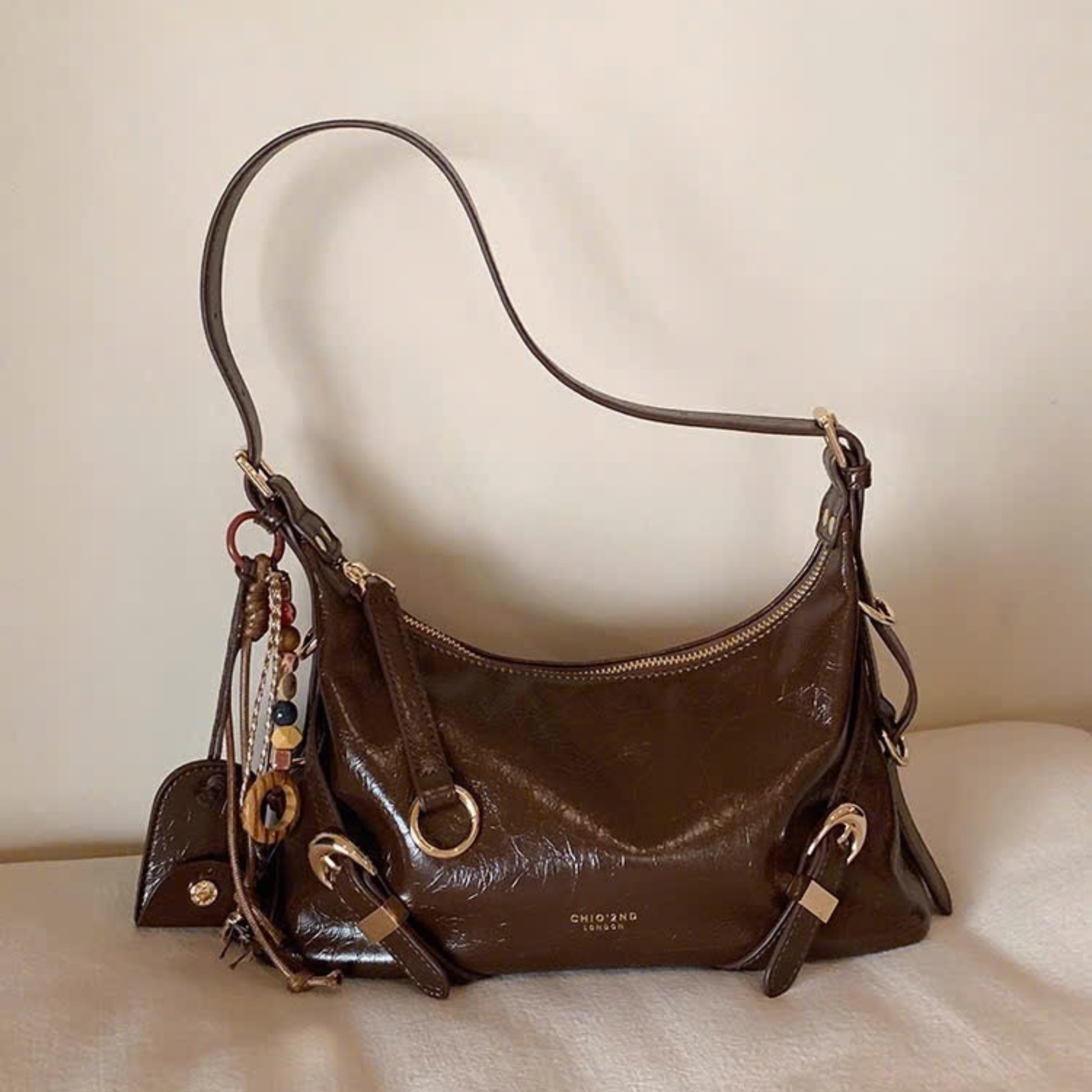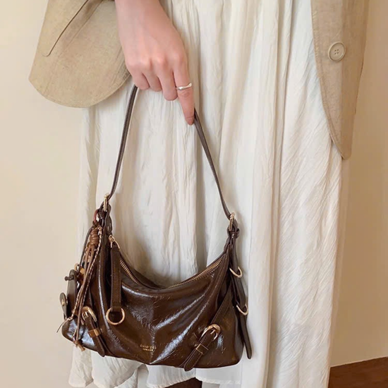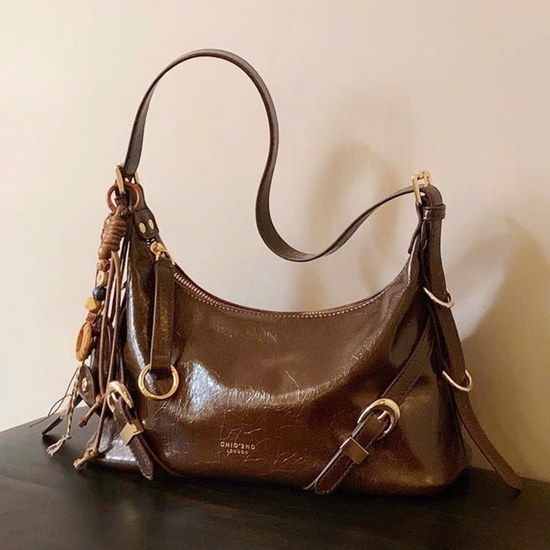 Chiếc túi xách da nhám kiểu hobo phối charm hạt đơn giản nhưng cũng không kém phần vintage. Thiết kế lạ mắt với phần đai xéo hai bên ở ngoài mặt túi. Quai đeo linh hoạt, bạn có thể sử dụng theo hai kiểu: cầm tay hoặc đeo vai tuỳ thích.