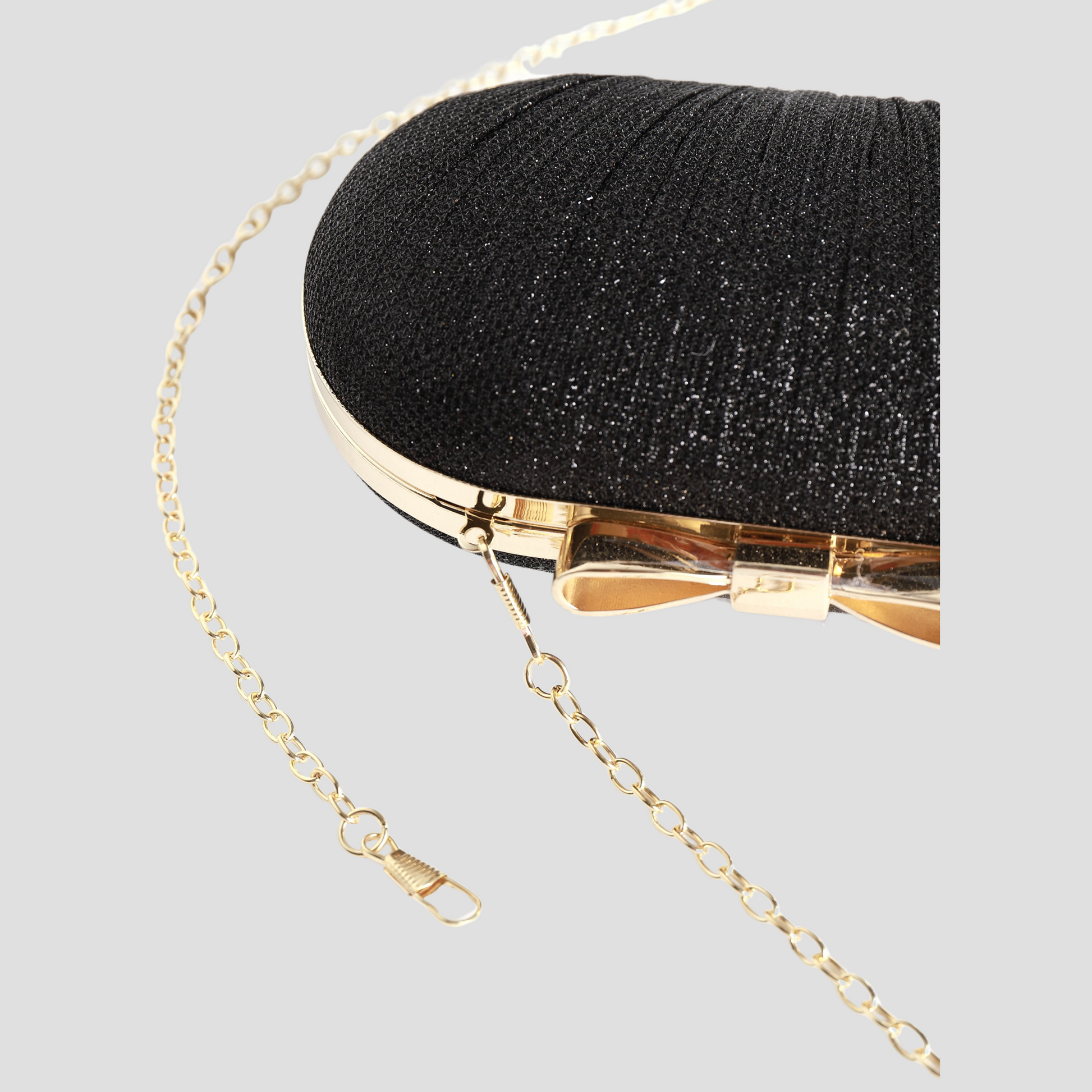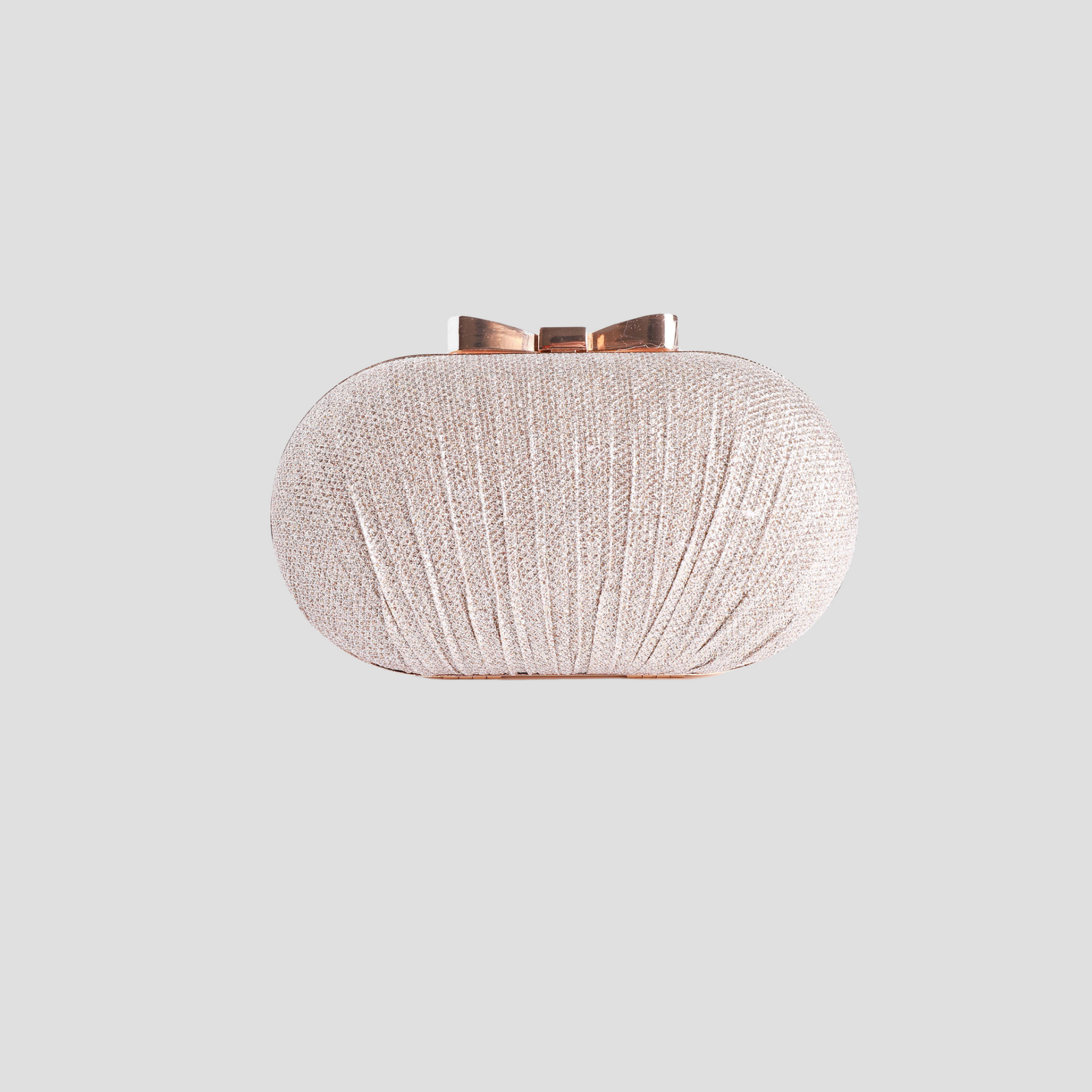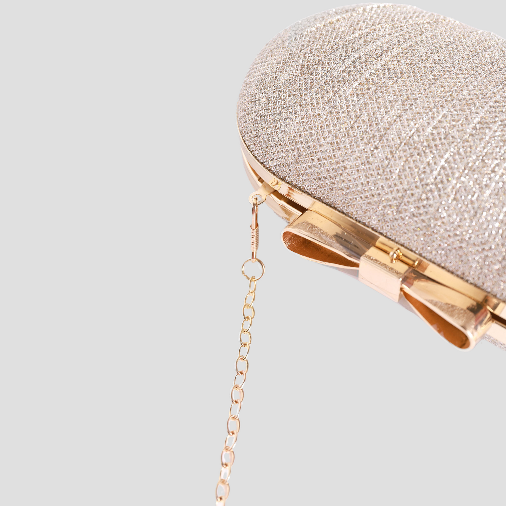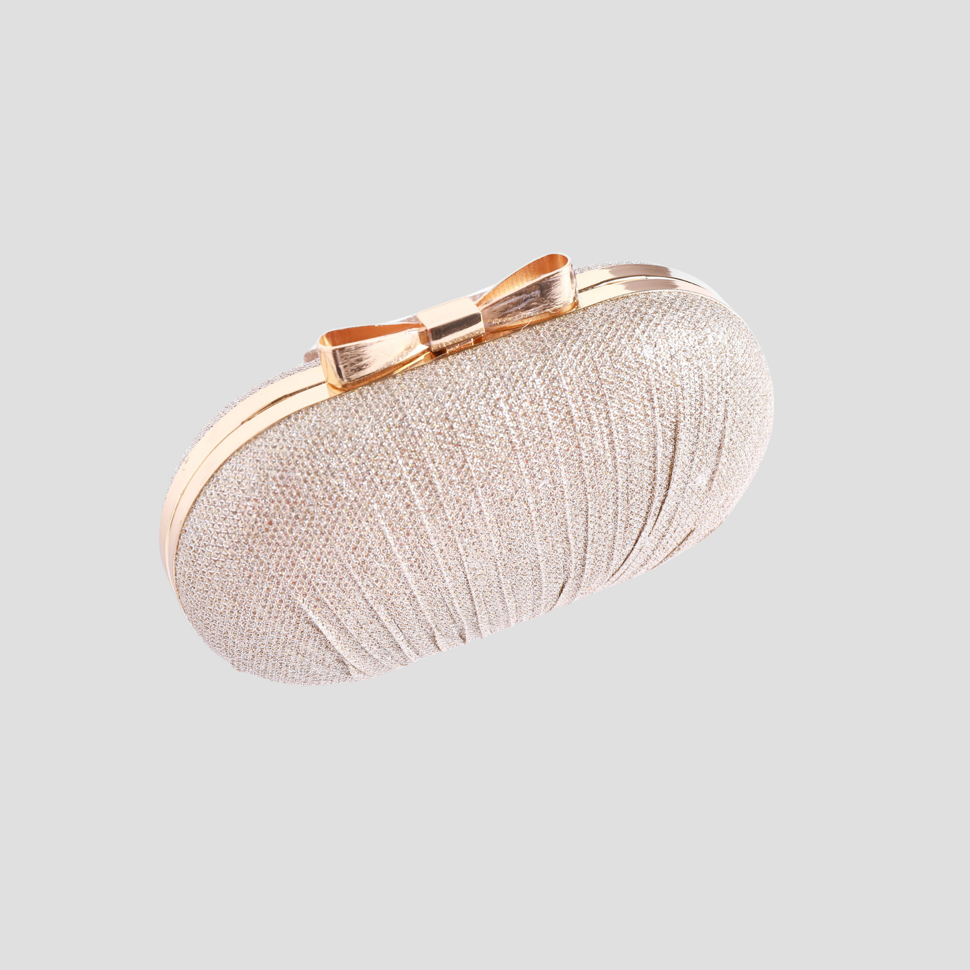 Một chiếc clutch cầm tay chắc chắn sẽ là phụ kiện không thể thiếu khi sánh đôi cùng nàng trong các bữa tiệc. Clutch có thiết kế form gọn nhẹ kết hợp khoá nơ kim loại và lớp vải kim tuyến lấp lánh tạo nên ánh nhìn sang trọng. Ngoài ra còn đi kèm dây xích tháo rời để xách tay tuỳ ý. Dễ dàng phối hợp với mọi trang phục từ nhẹ nhàng đến cá tính quyến rũ, giúp nàng nổi bật và ghi lại dấu ấn khó phai trong lòng người đối diện.